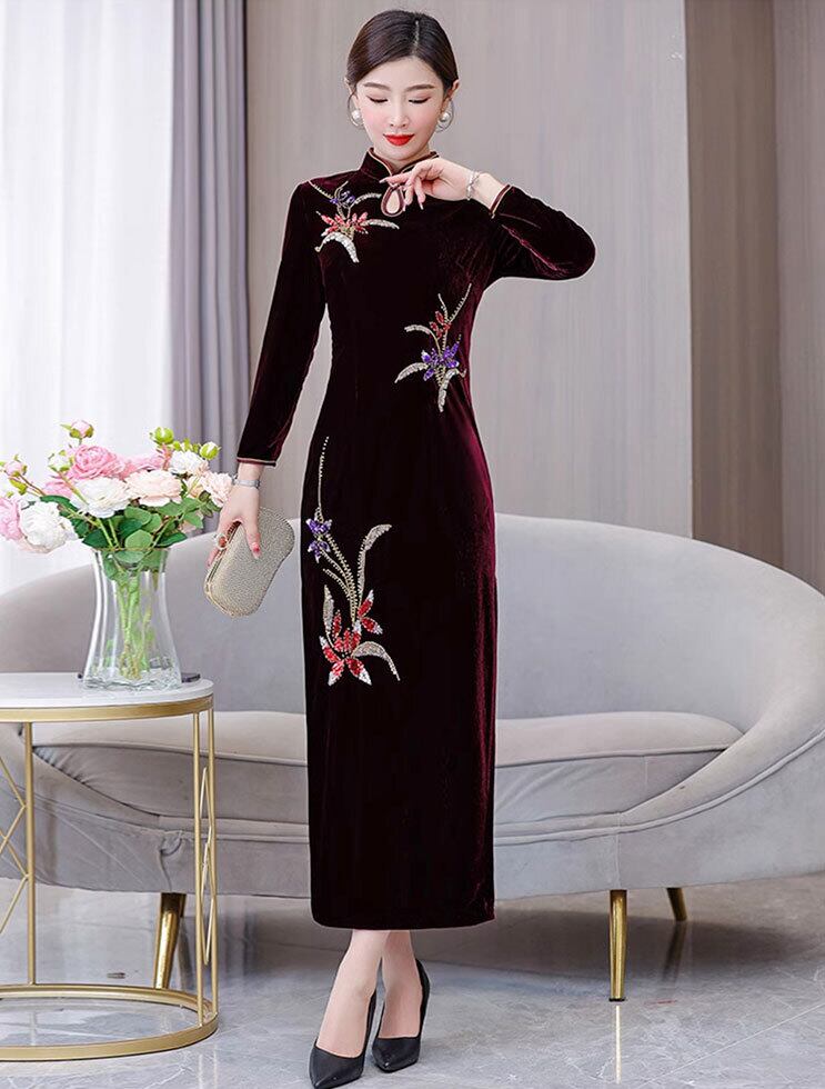 チャイナドレス ロングワンピ ステージ衣装 秋冬 長袖 装飾ワンピ zl411