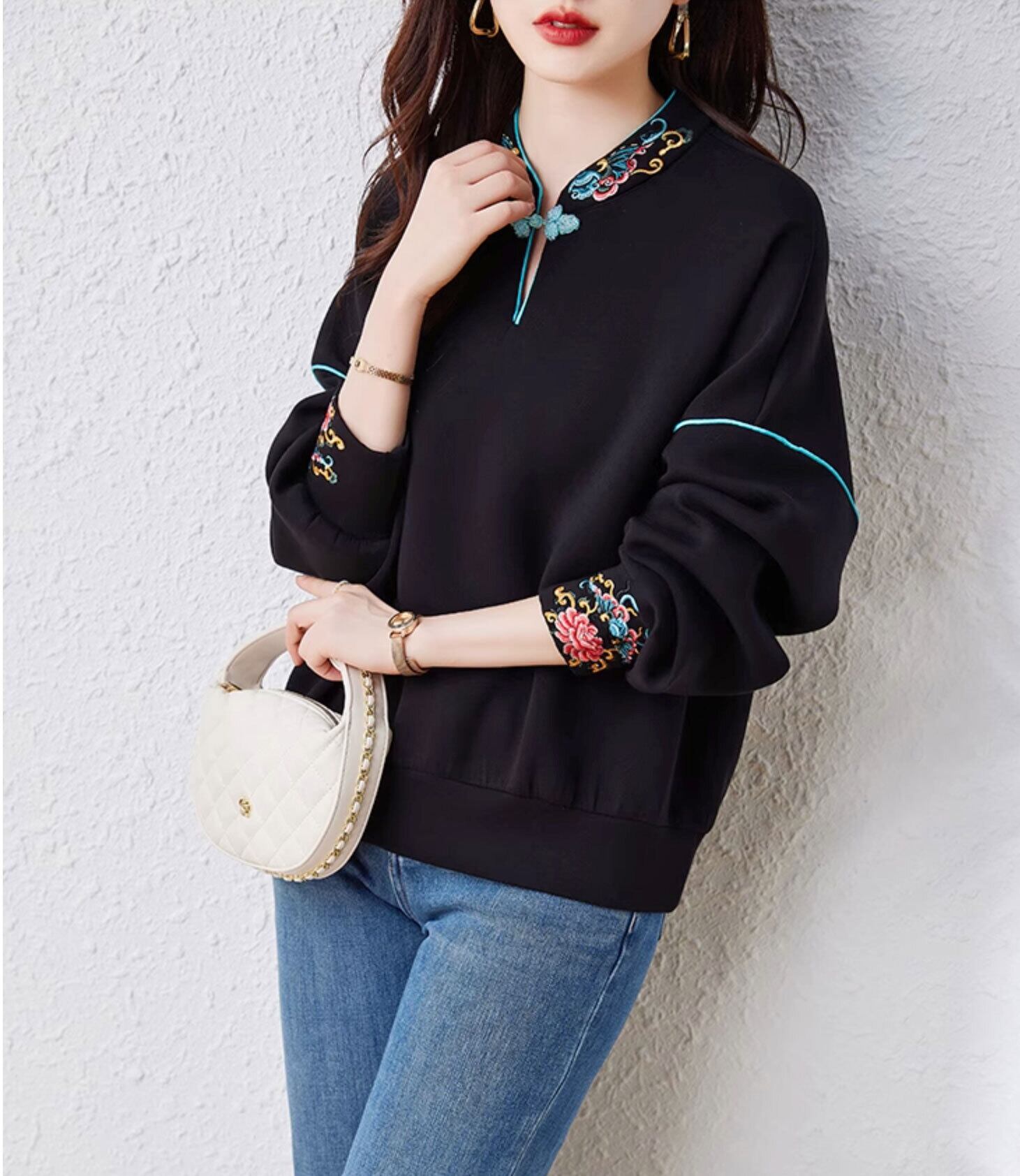 チャイナ服 トップス 秋冬 刺繍長袖チャイナトップス ブラック zt498