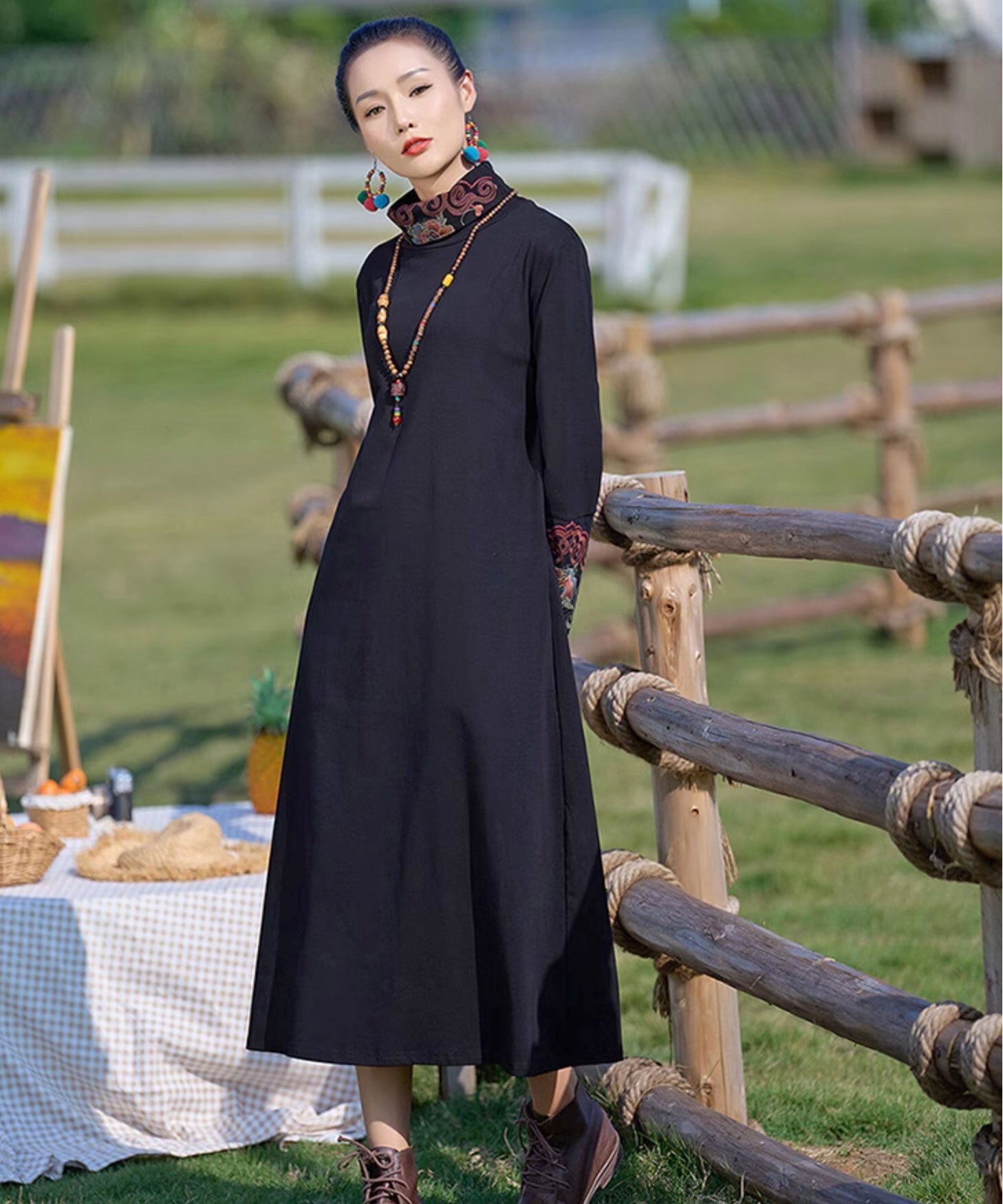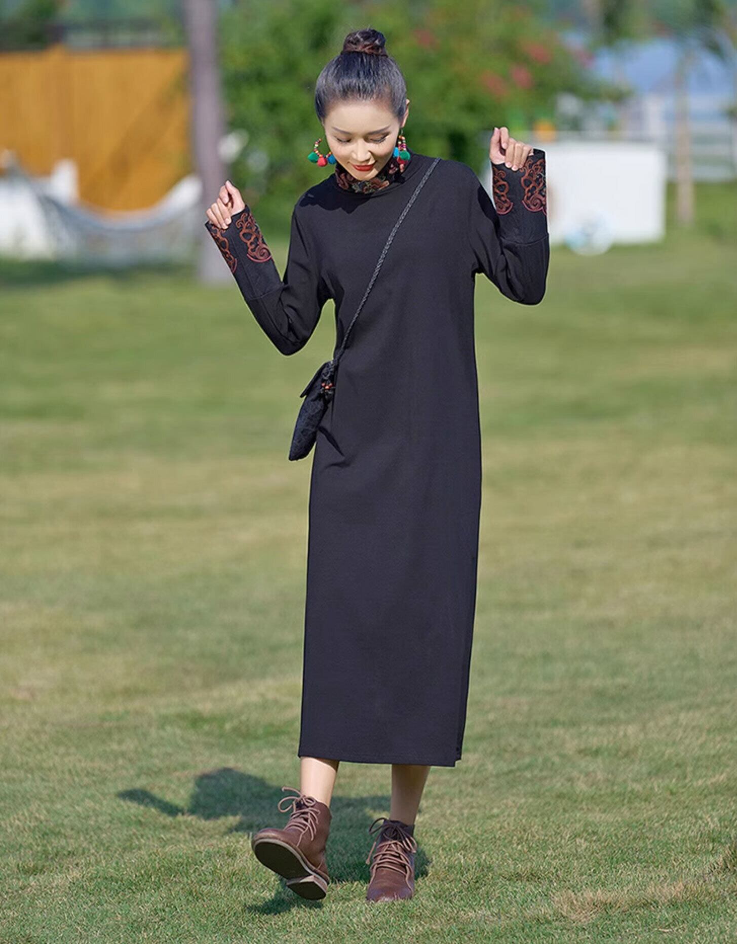 チャイナドレス チャイナ服 ゆったり ロングワンピース ハイネック 刺繍袖 zl415