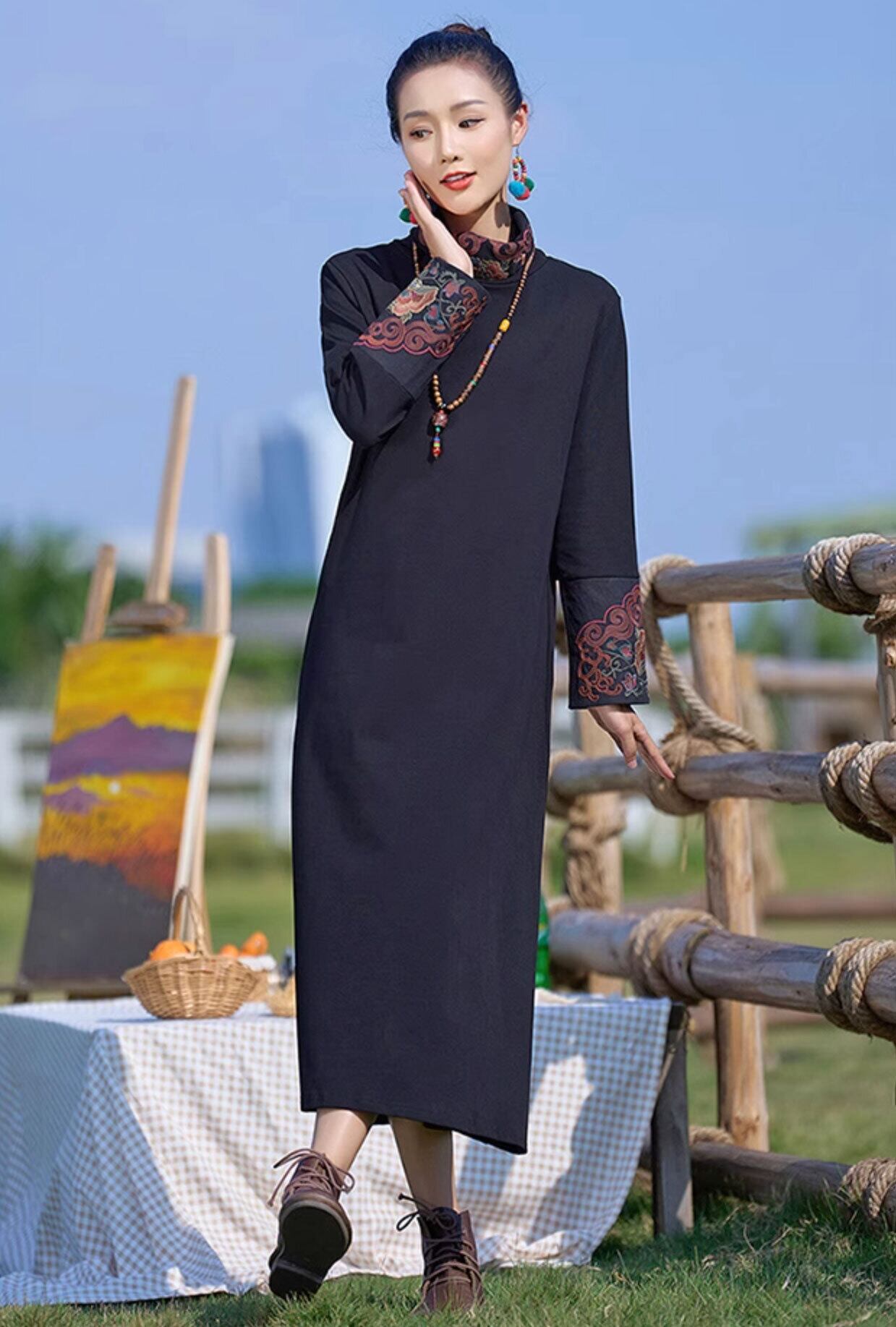 トップスも普段着も揃うチャイナ服専門店chaiです。こちらはチャイナドレス チャイナ服 ゆったり ロングワンピース ハイネック 刺繍袖 zl415の商品ページです。刺繍の素敵なハイネックのチャイナワンピースで、普段着にも衣装にもおすすめのアイテムです。