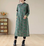 チャイナ服 ロングワンピース 秋冬 ゆったり 厚手 素朴 落ち着いた風合い グリーン 長袖 zl419
