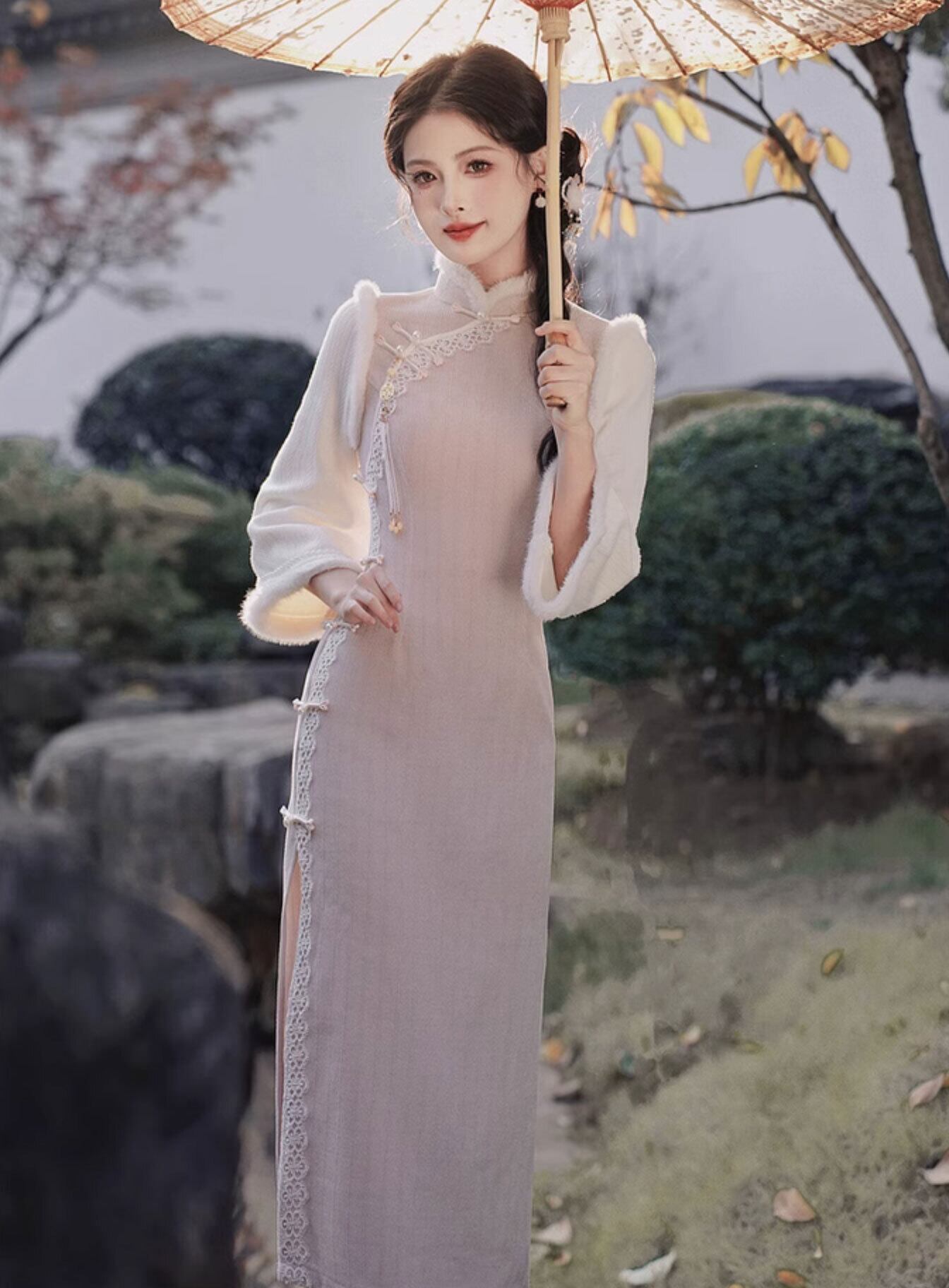 チャイナドレス チャイナ服 ロングワンピース ファー 重ね着風 長袖 zl423