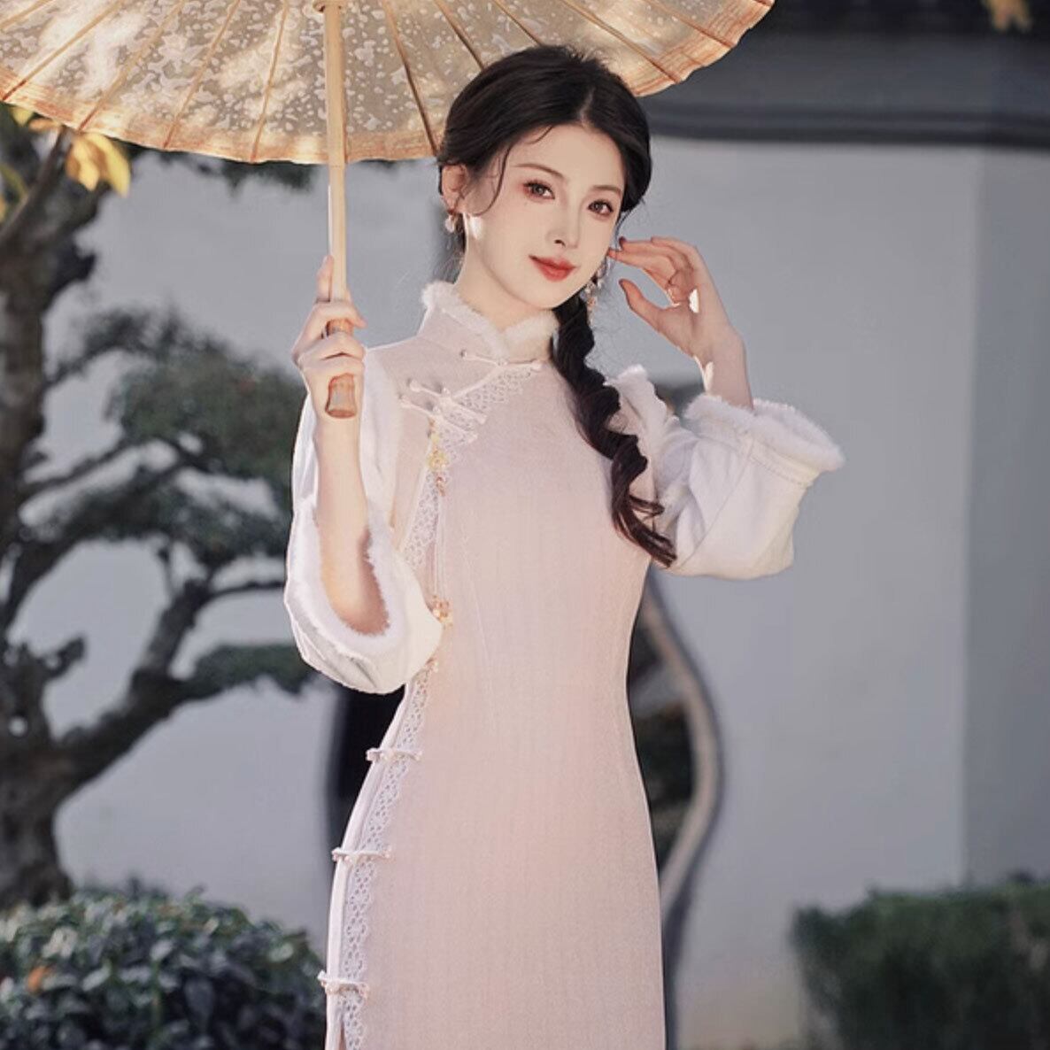 トップスも普段着も揃うチャイナ服専門店chaiです。こちらはチャイナドレス チャイナ服 ロングワンピース ファー 重ね着風 長袖 zl423の商品ページです。ファーが可愛い重ね着風のチャイナワンピースで、普段着にも衣装にもおすすめのアイテムです。