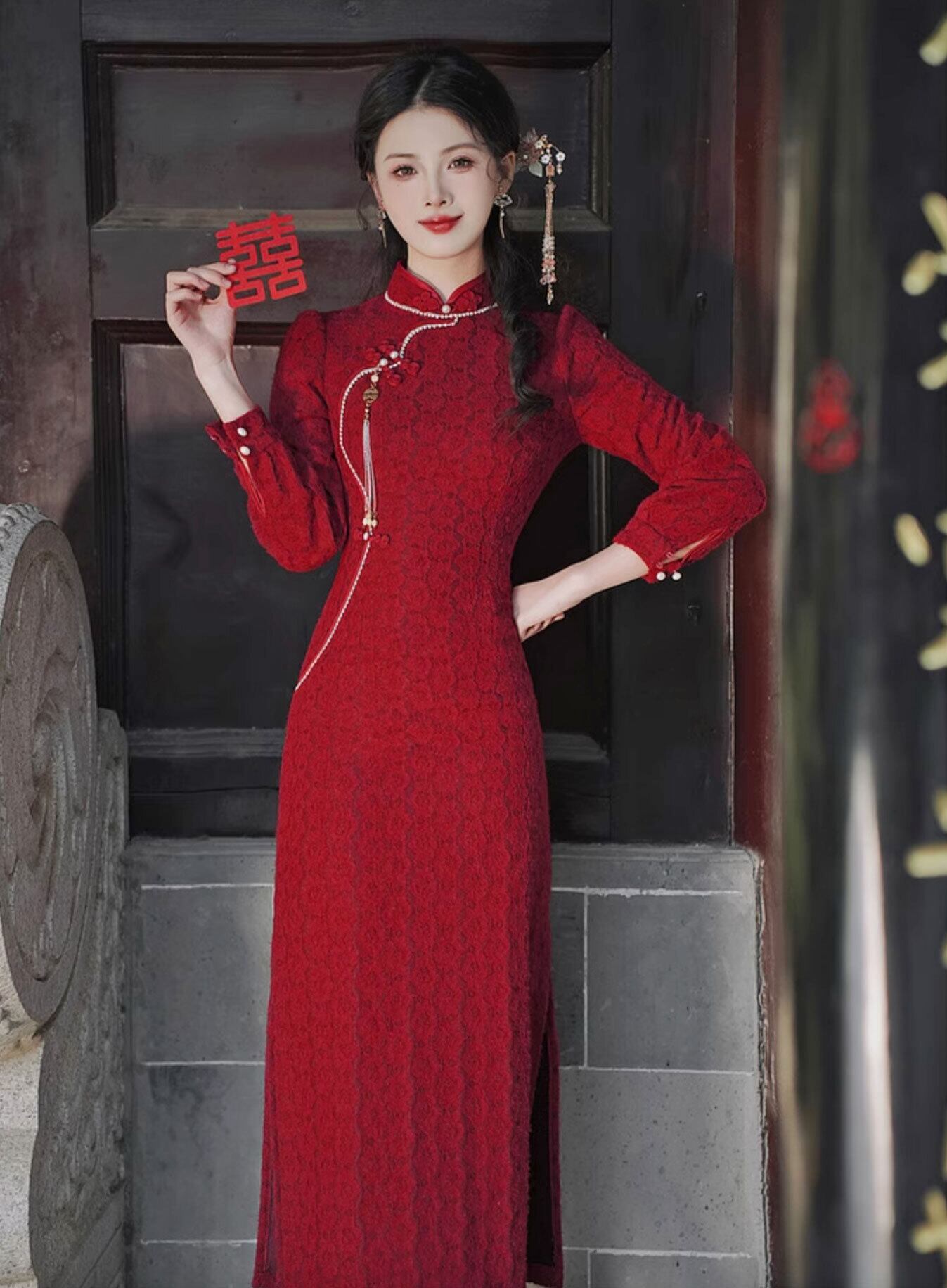 チャイナドレス チャイナ服 ロングワンピース 上品な風合い レッド 長袖 zl424