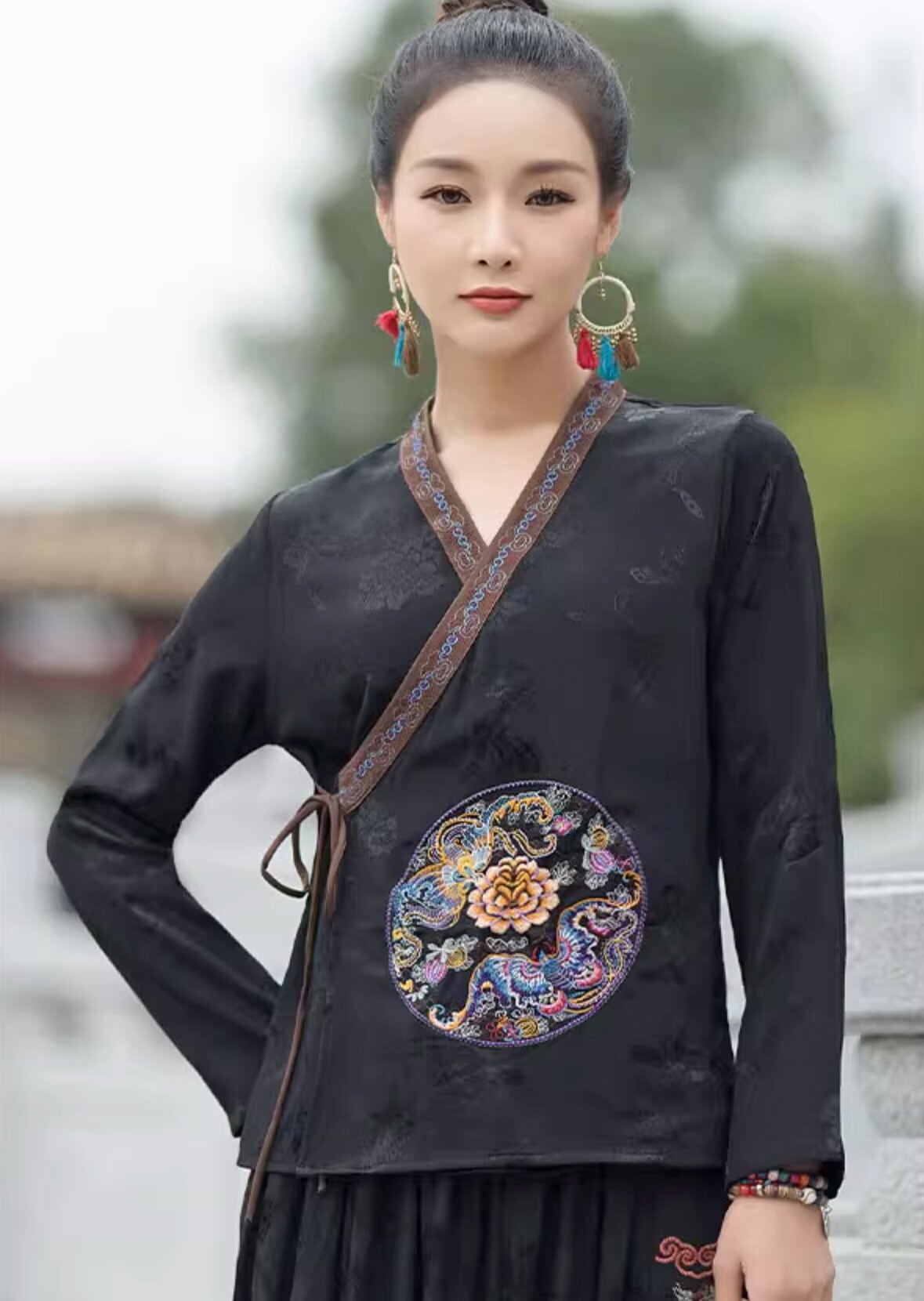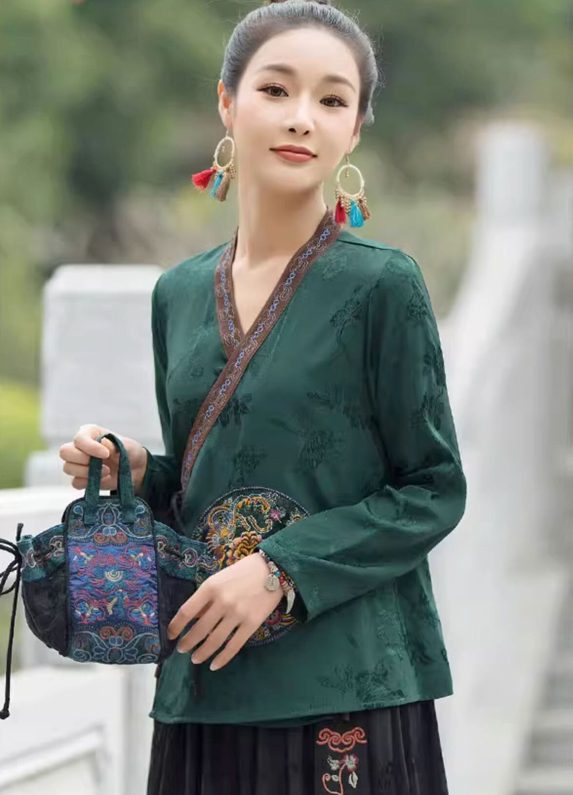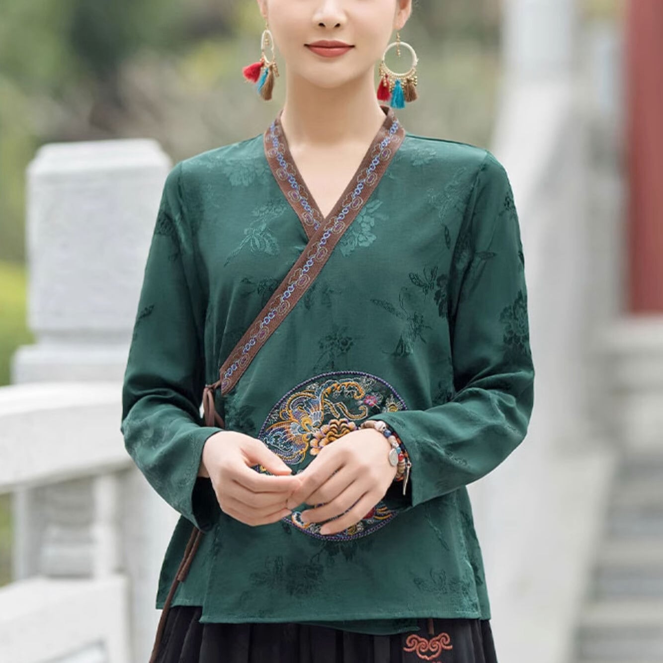 チャイナ服 トップス 秋冬 斜め合わせ Vネック 刺繍 落ち着いた風合い 長袖 zt511