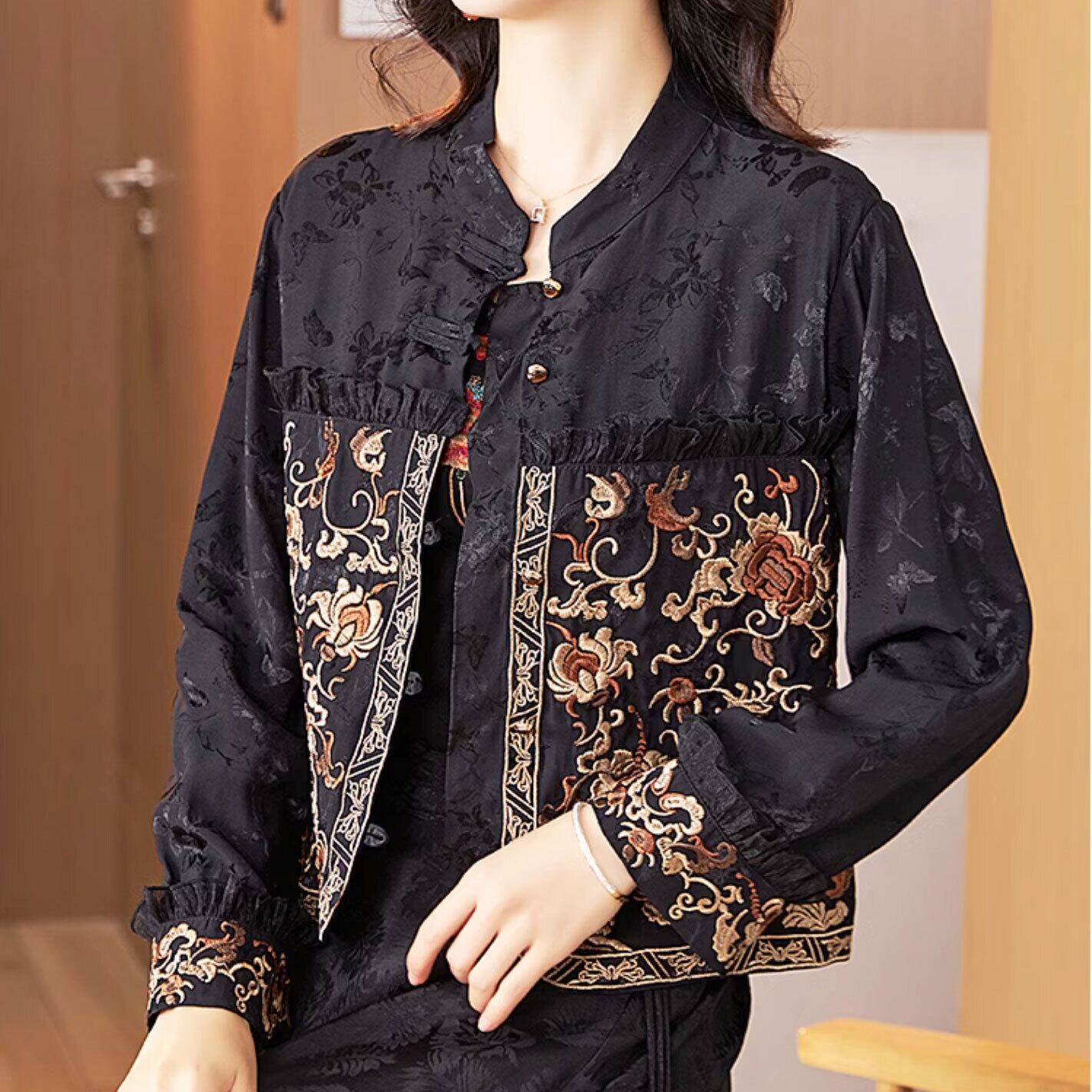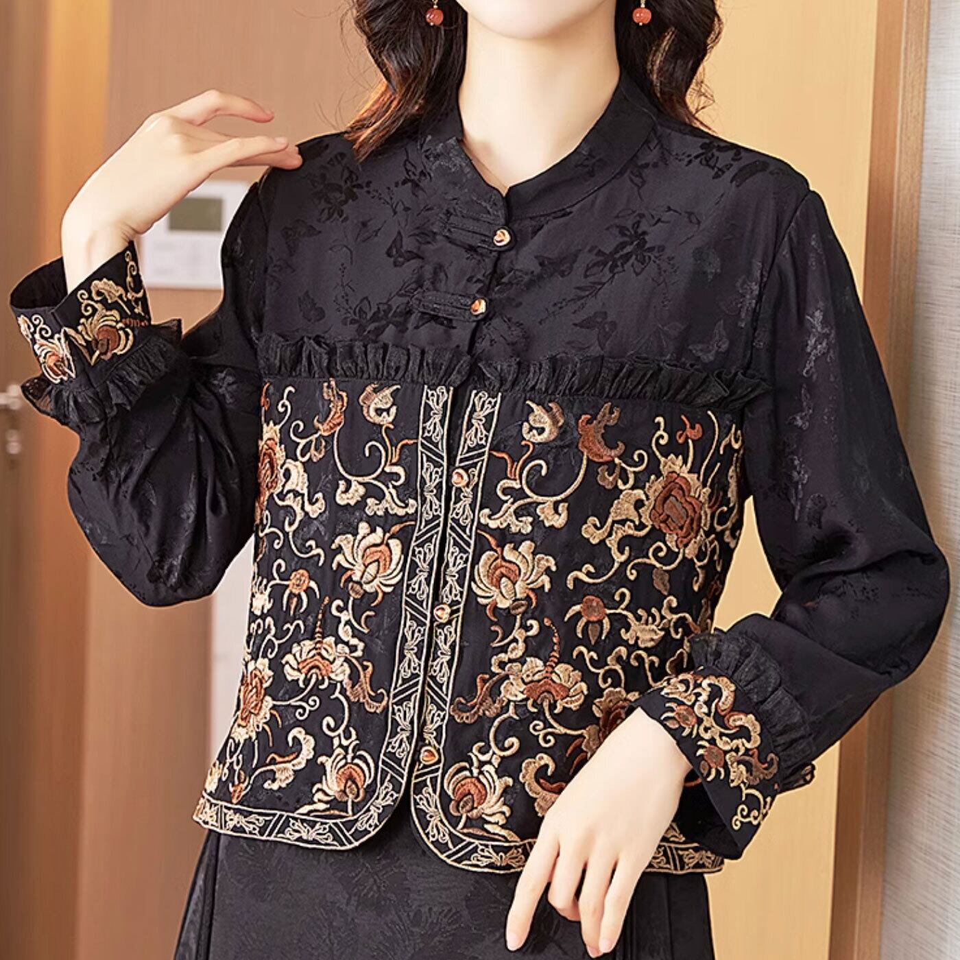 チャイナ服 トップス 秋冬 上品な風合い 前開き ブラック 刺繍 zt520