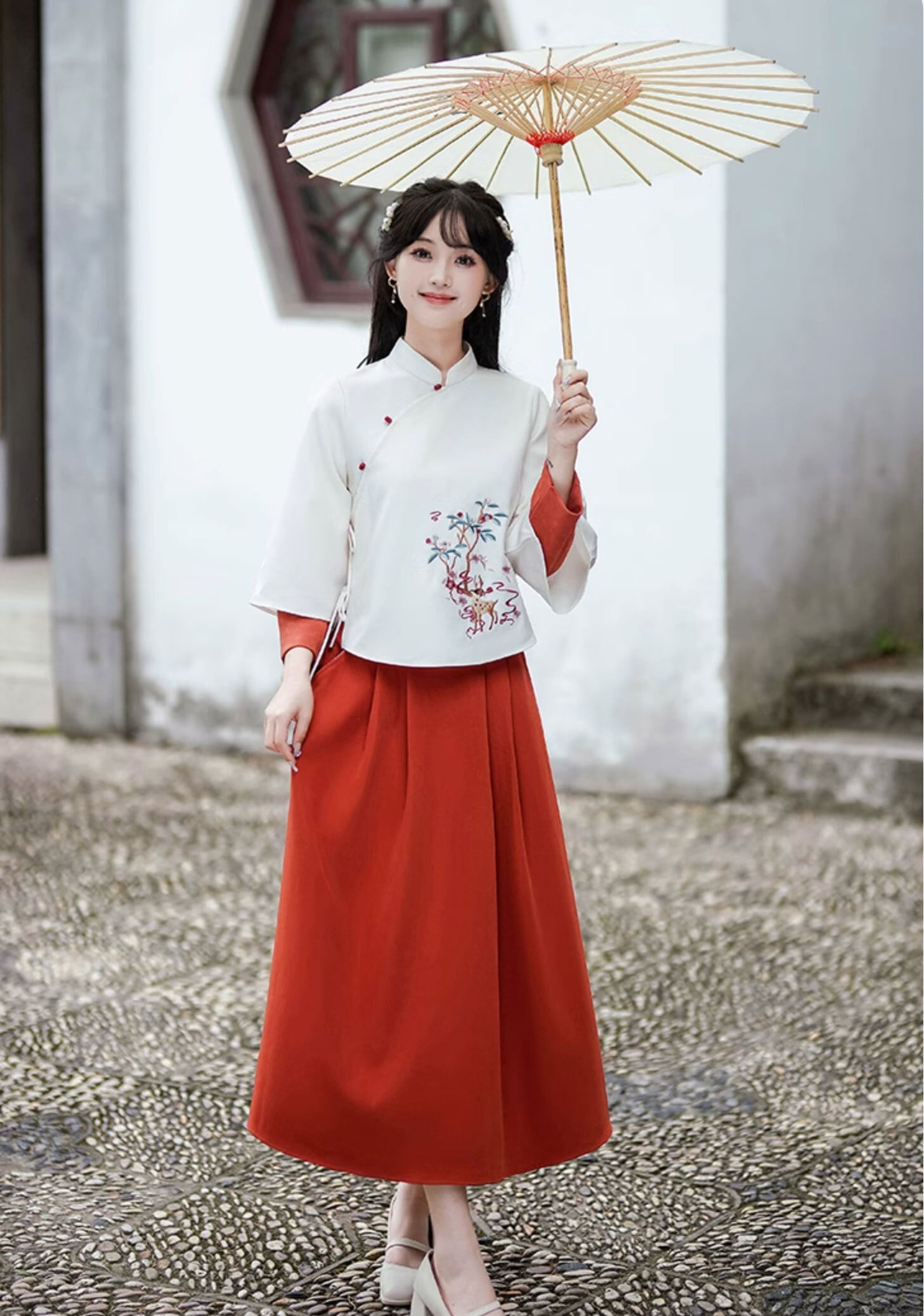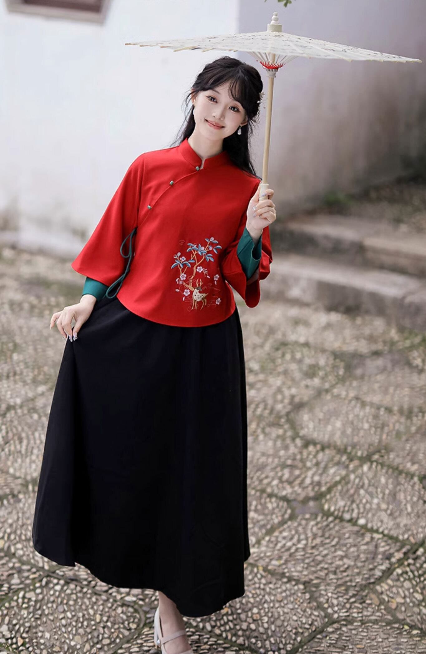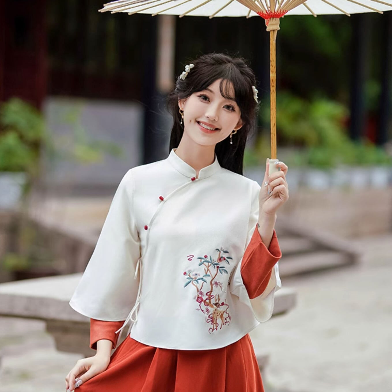 チャイナ服 トップス 秋冬 重ね着風袖 刺繍 長袖 装飾チャイナトップス zt523