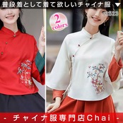 トップスも普段着も揃うチャイナ服専門店chaiです。こちらはチャイナ服 トップス 秋冬 重ね着風袖 刺繍 長袖 装飾チャイナトップス zt523の商品ページです。重ね着風の袖が素敵なチャイナトップスで、普段着チャイナファッションにも使いやすいアイテムです。