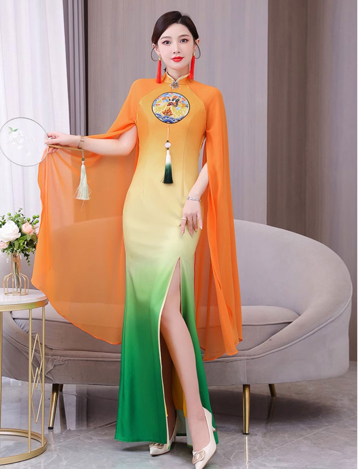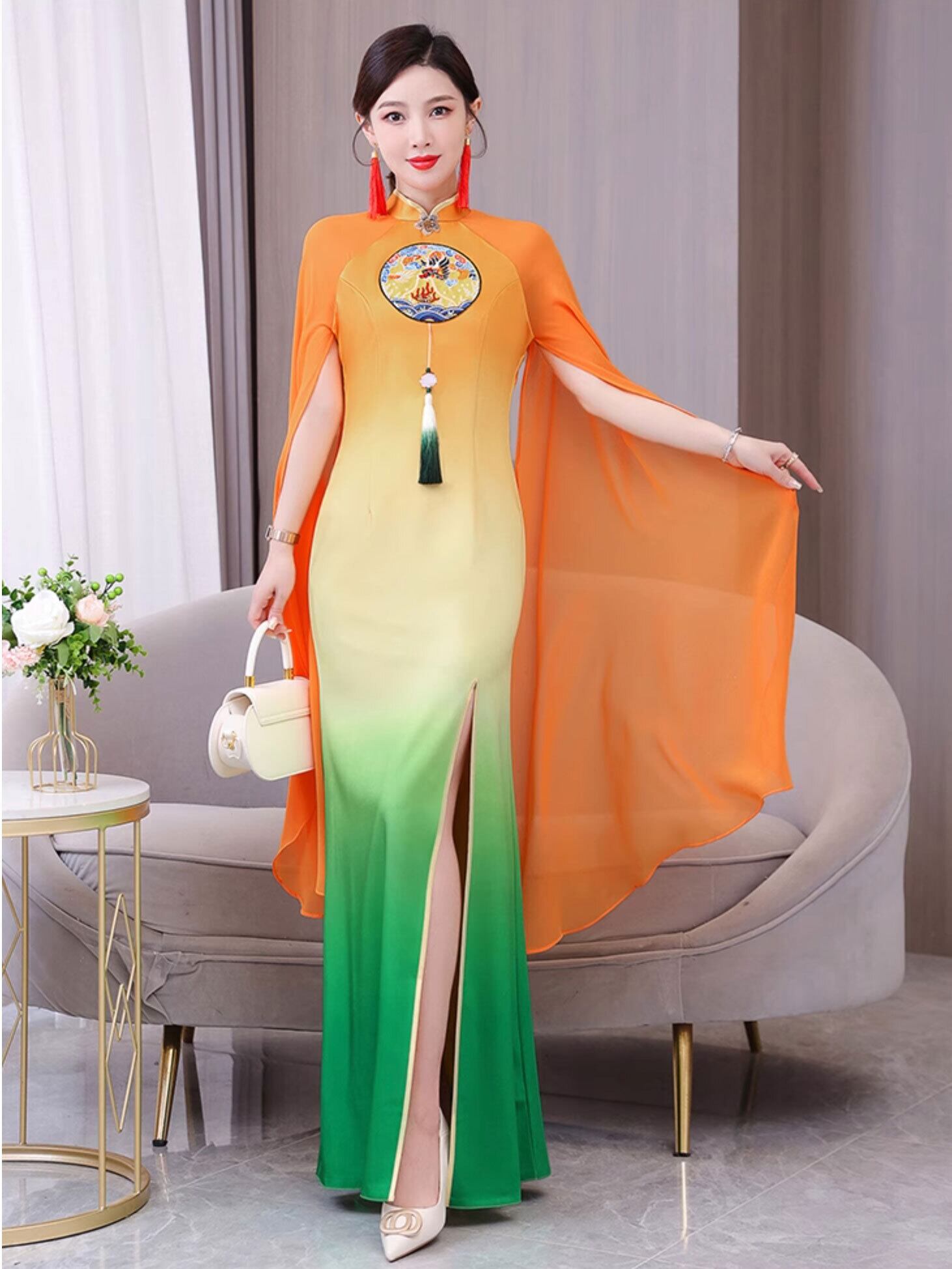 トップスも普段着も揃うチャイナ服専門店chaiです。こちらはチャイナドレス チャイナ服 ロングワンピース 舞台衣装 変形袖 スリット グラデーション zl427の商品ページです。変形袖が素敵なチャイナワンピースで、舞台衣装におすすめのアイテムです。