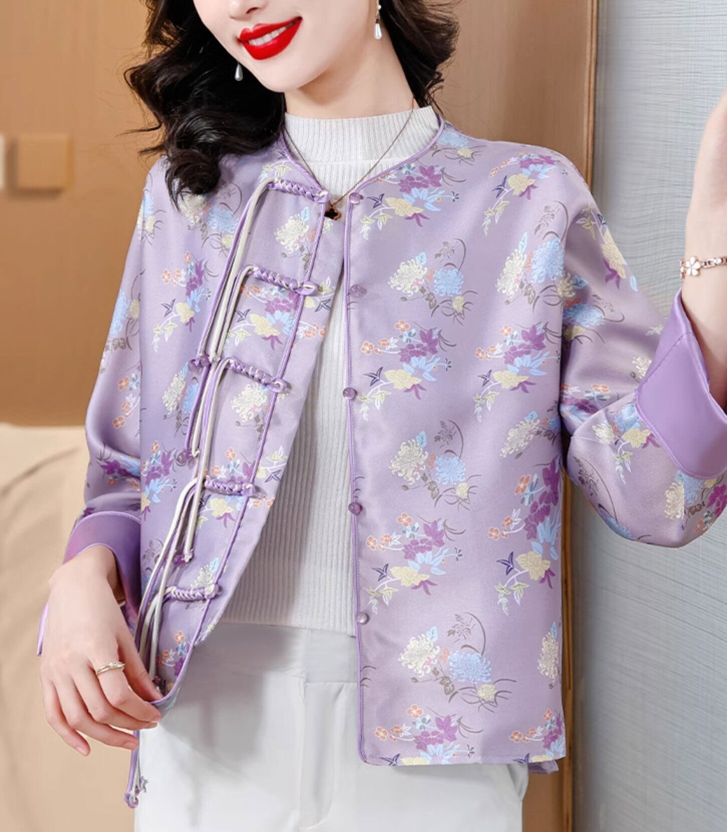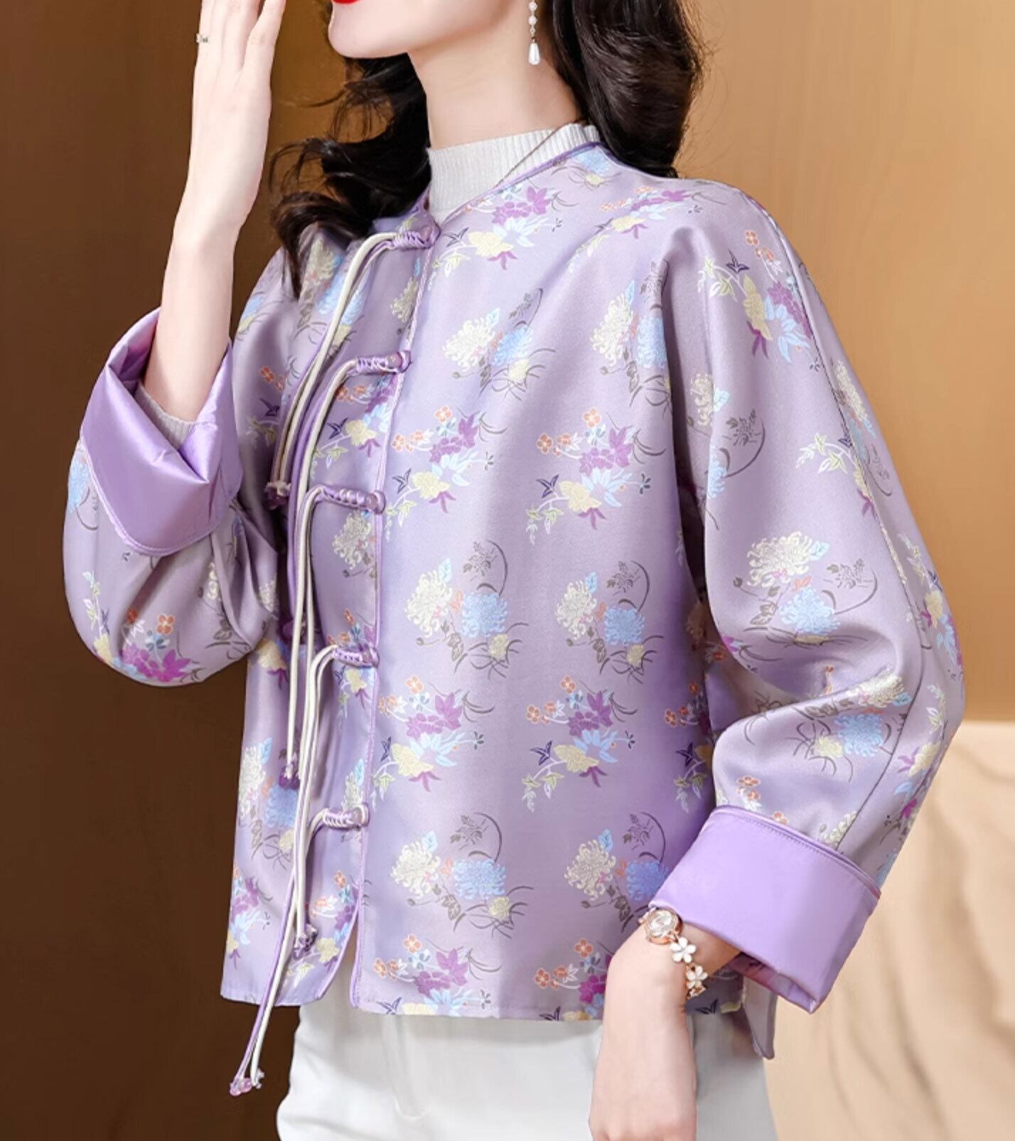 チャイナ服 トップス 春秋 高級感 上品な風合い 長袖 襟なし パープル zt531