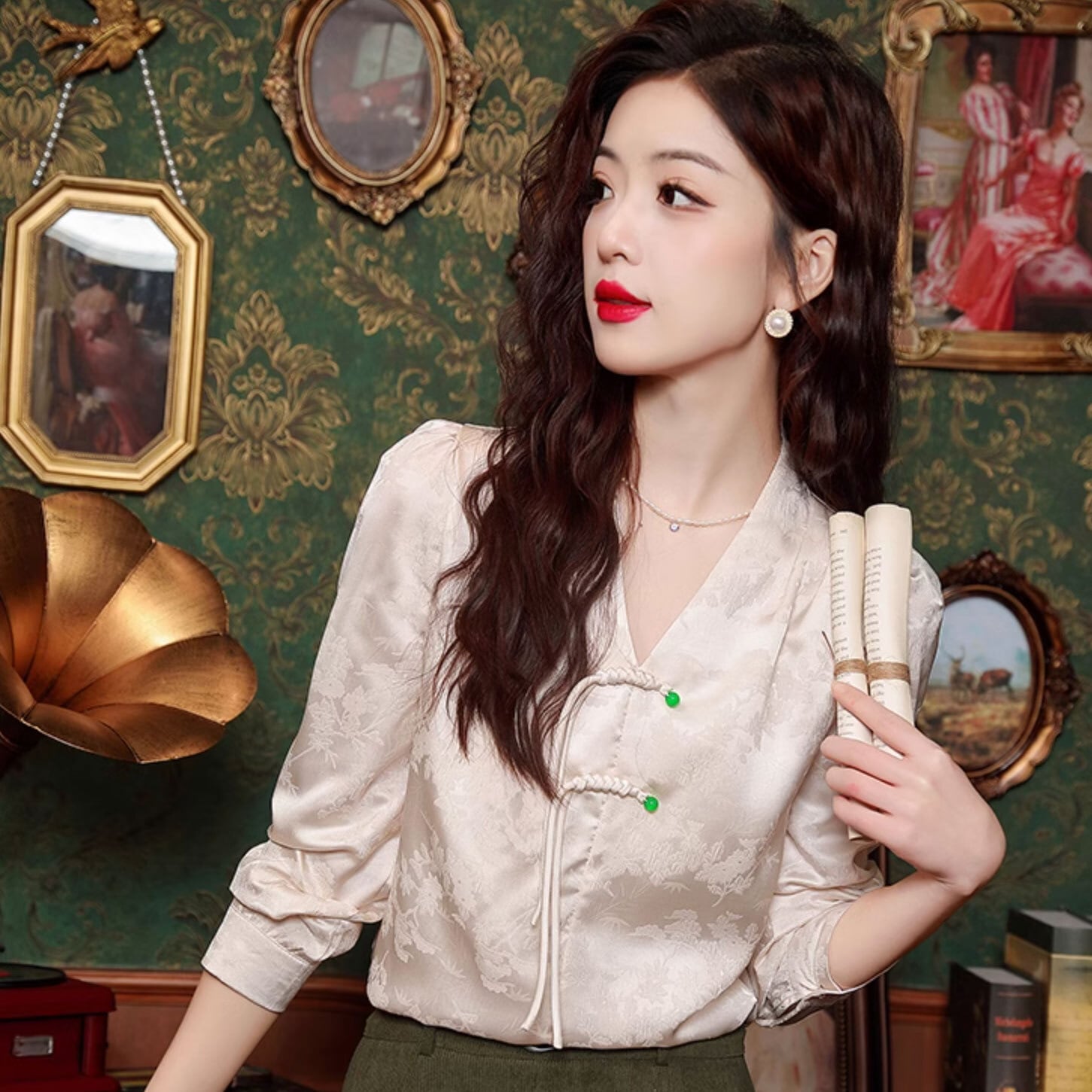 チャイナ服 トップス 春秋 上品な風合い つやあり 襟なし Vネック 装飾チャイナシャツ zt552