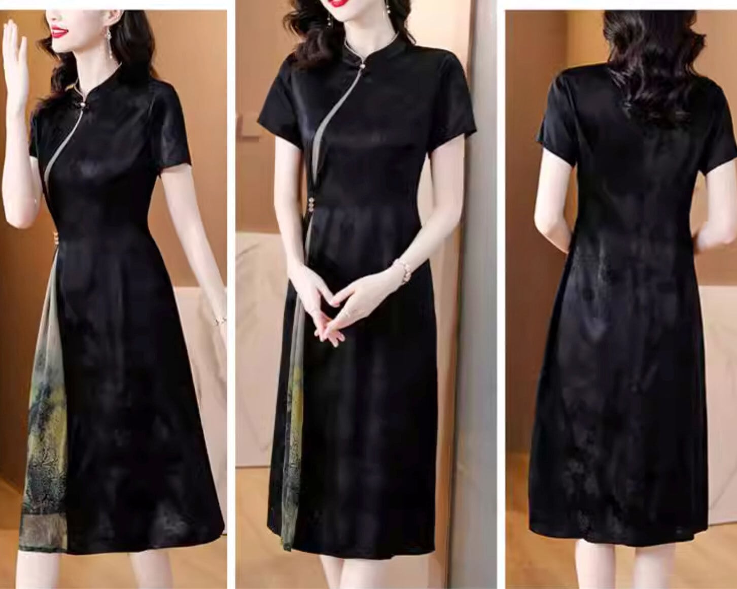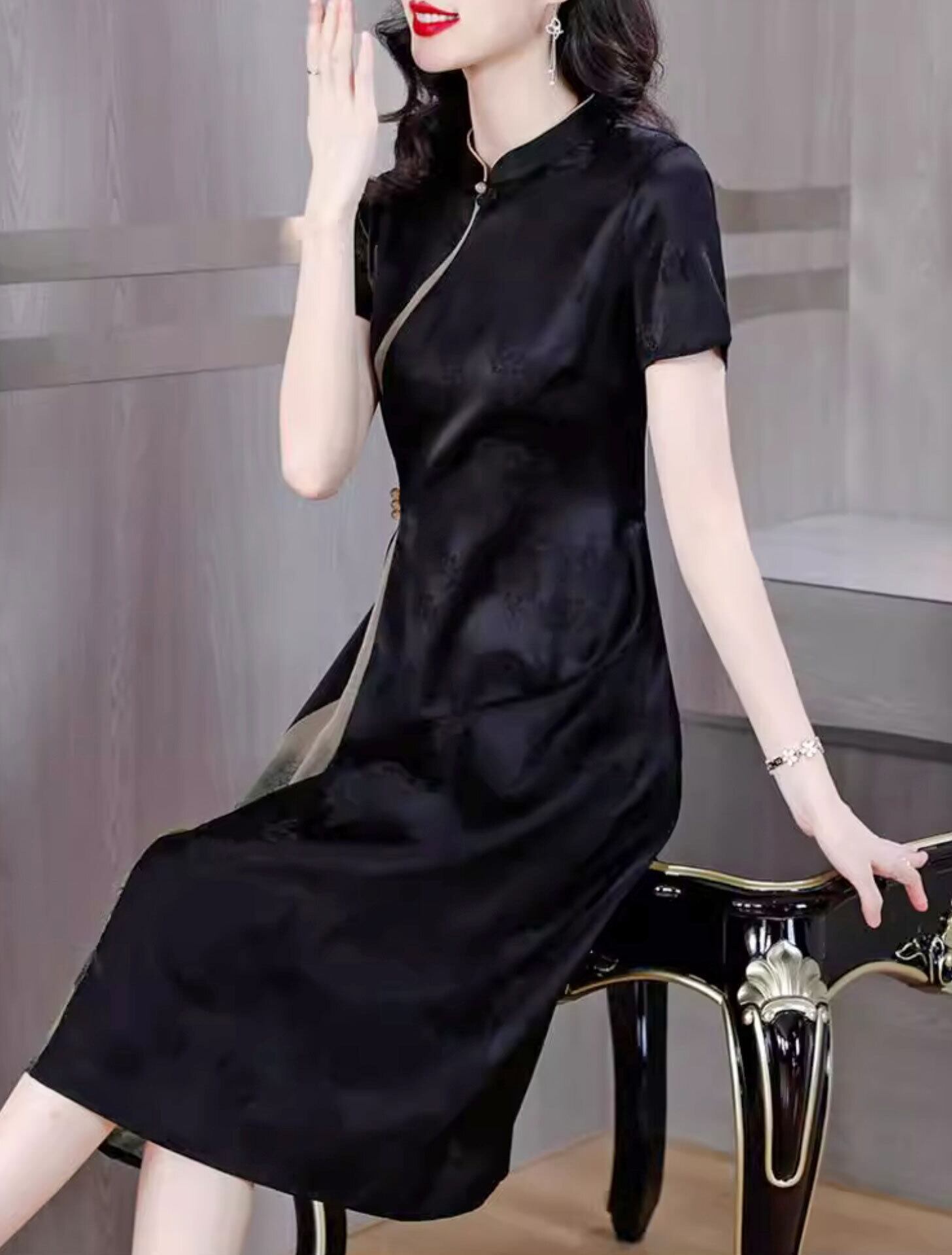 チャイナドレス チャイナ服 春夏 ブラック ワンピース 上品な風合い 半袖 普段着 zl431