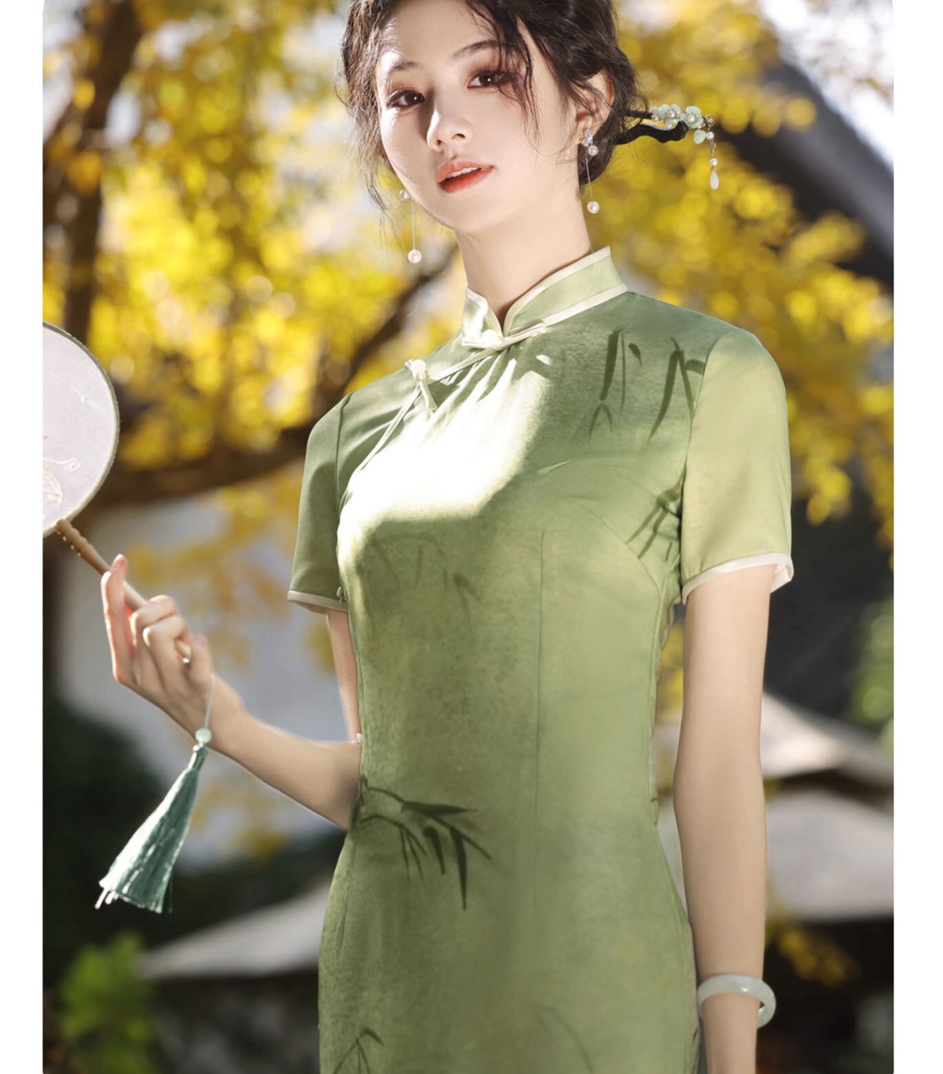チャイナドレス チャイナ服 春夏 竹笹柄 ロングワンピース 襟あり 上品な風合い 半袖 普段着 zl433