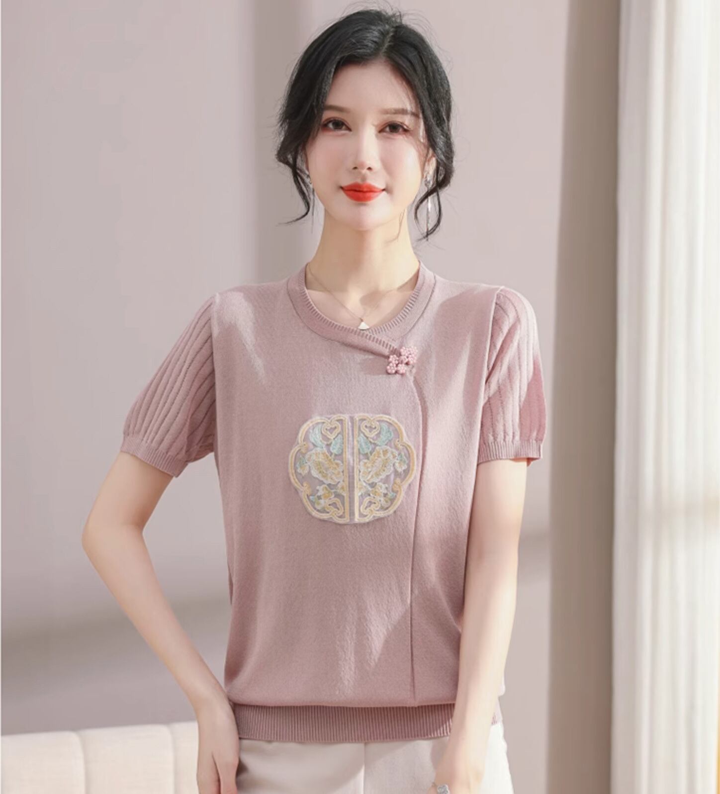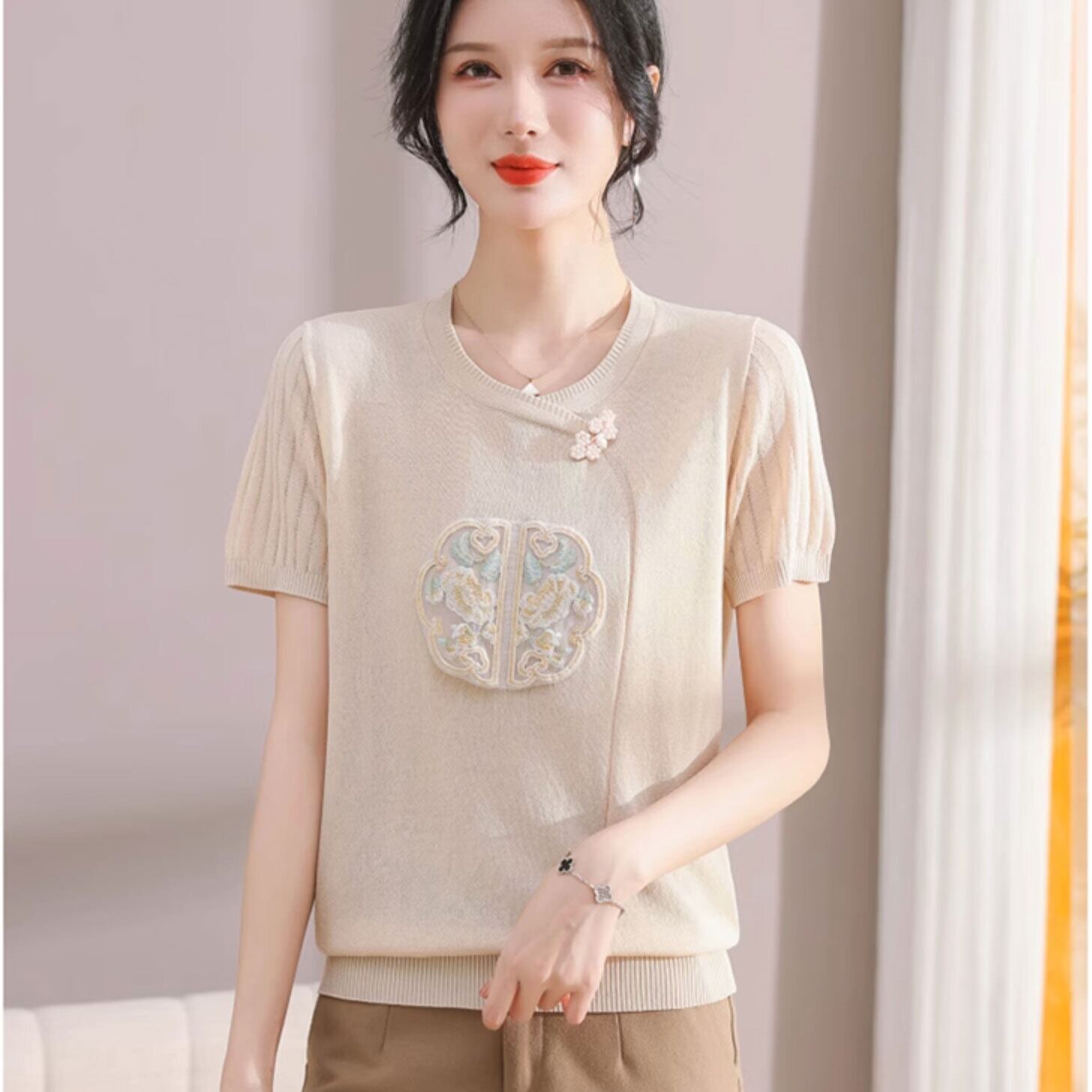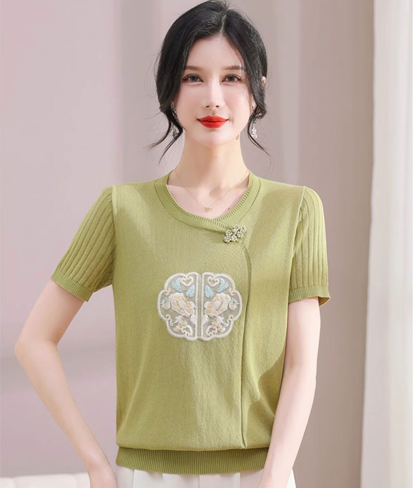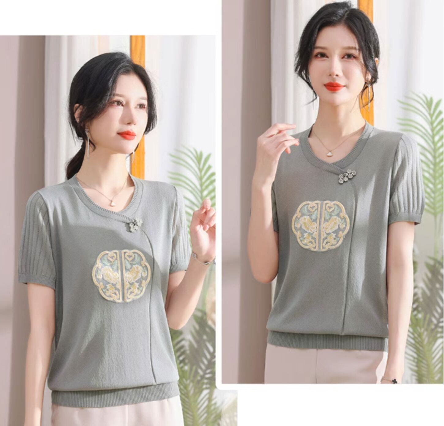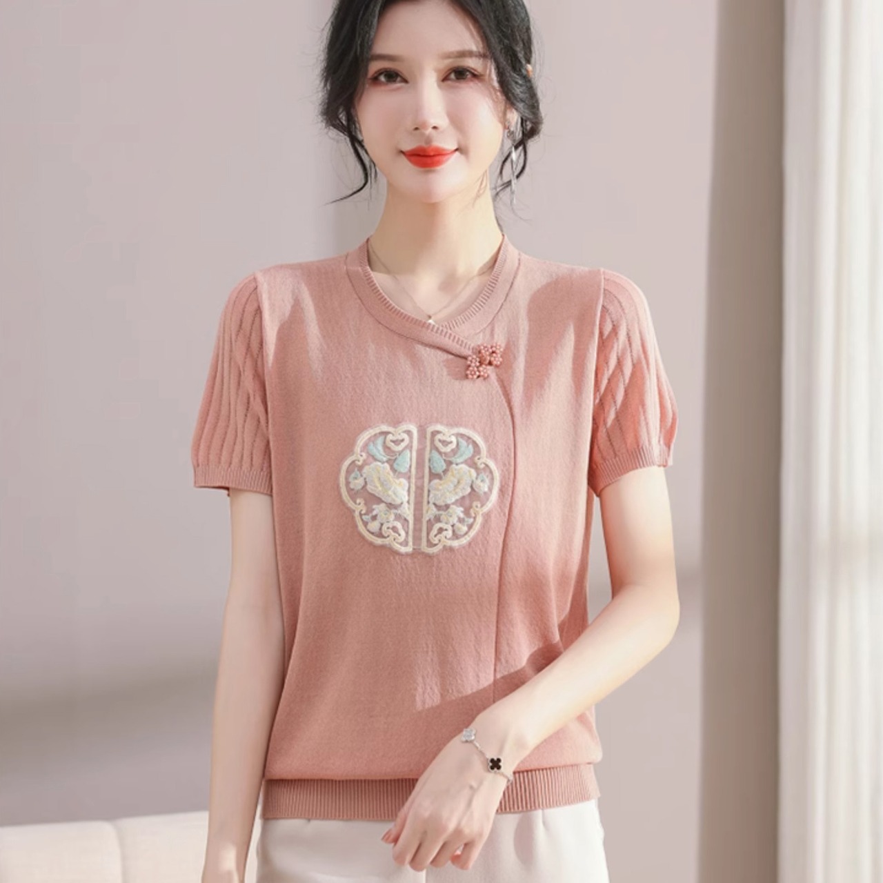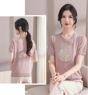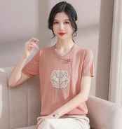 チャイナ服 トップス サマーニット 上品 刺繍 落ち着いた風合い 半袖 襟なし zh519
