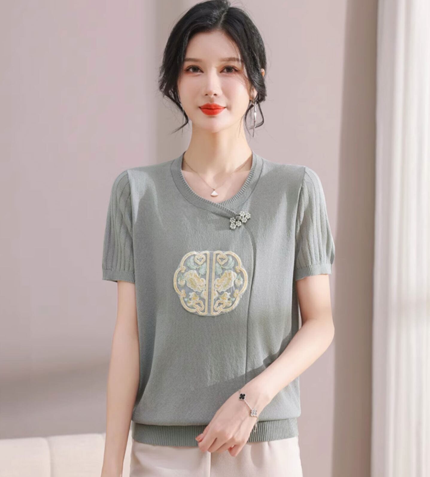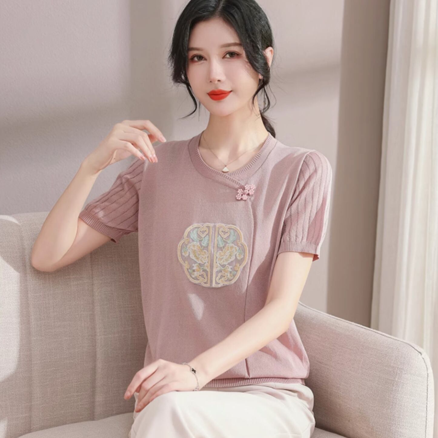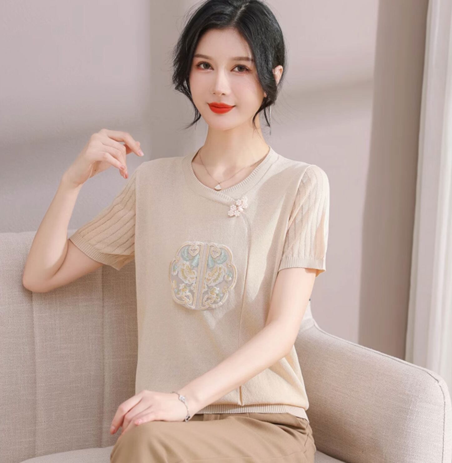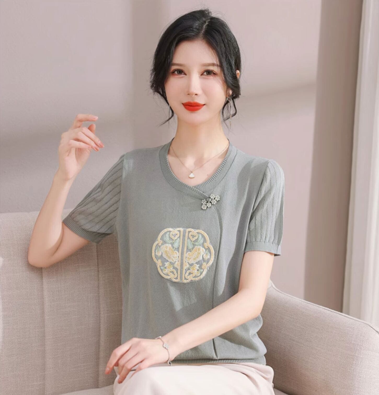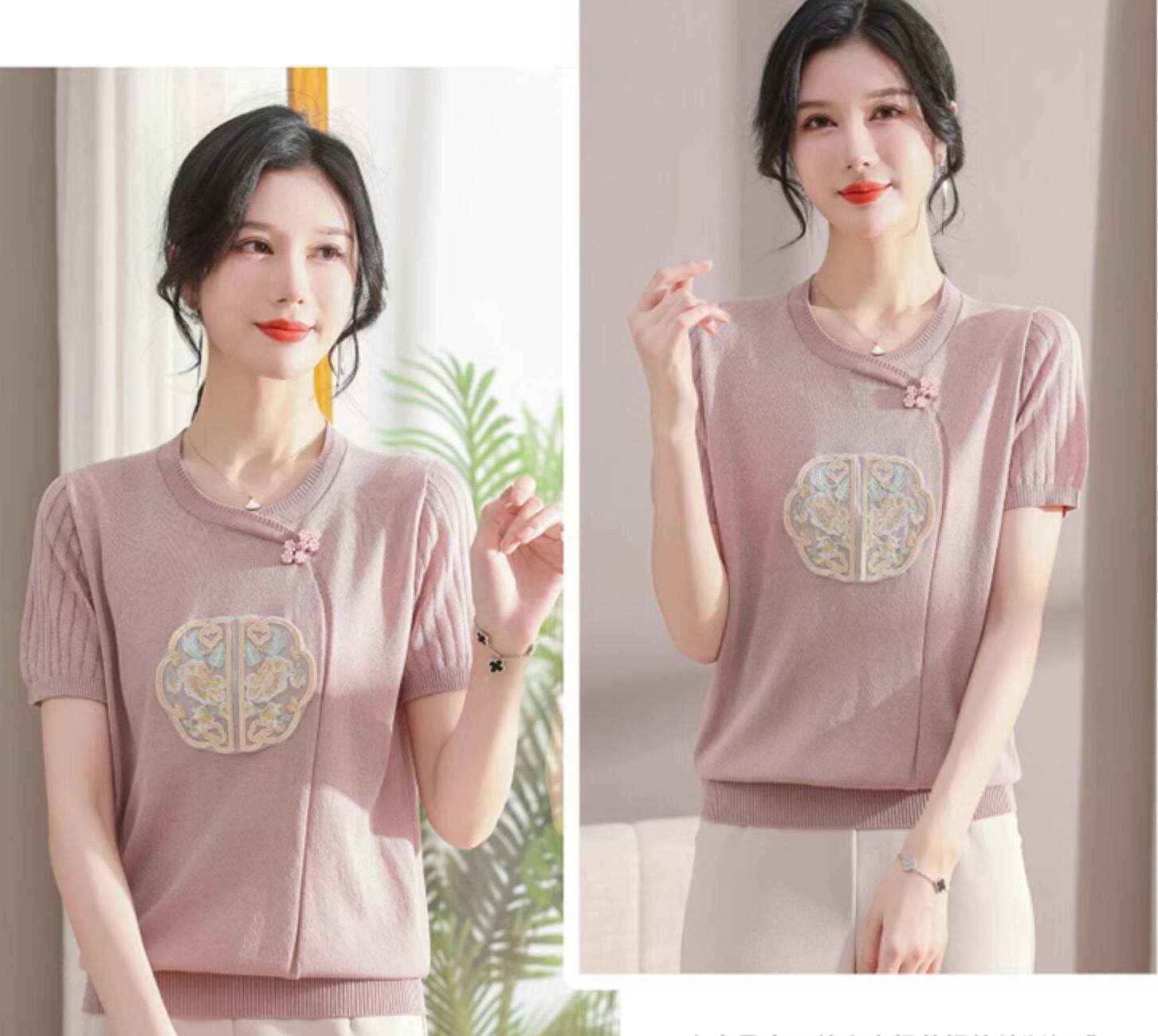 チャイナ服 トップス サマーニット 上品 刺繍 落ち着いた風合い 半袖 襟なし zh519