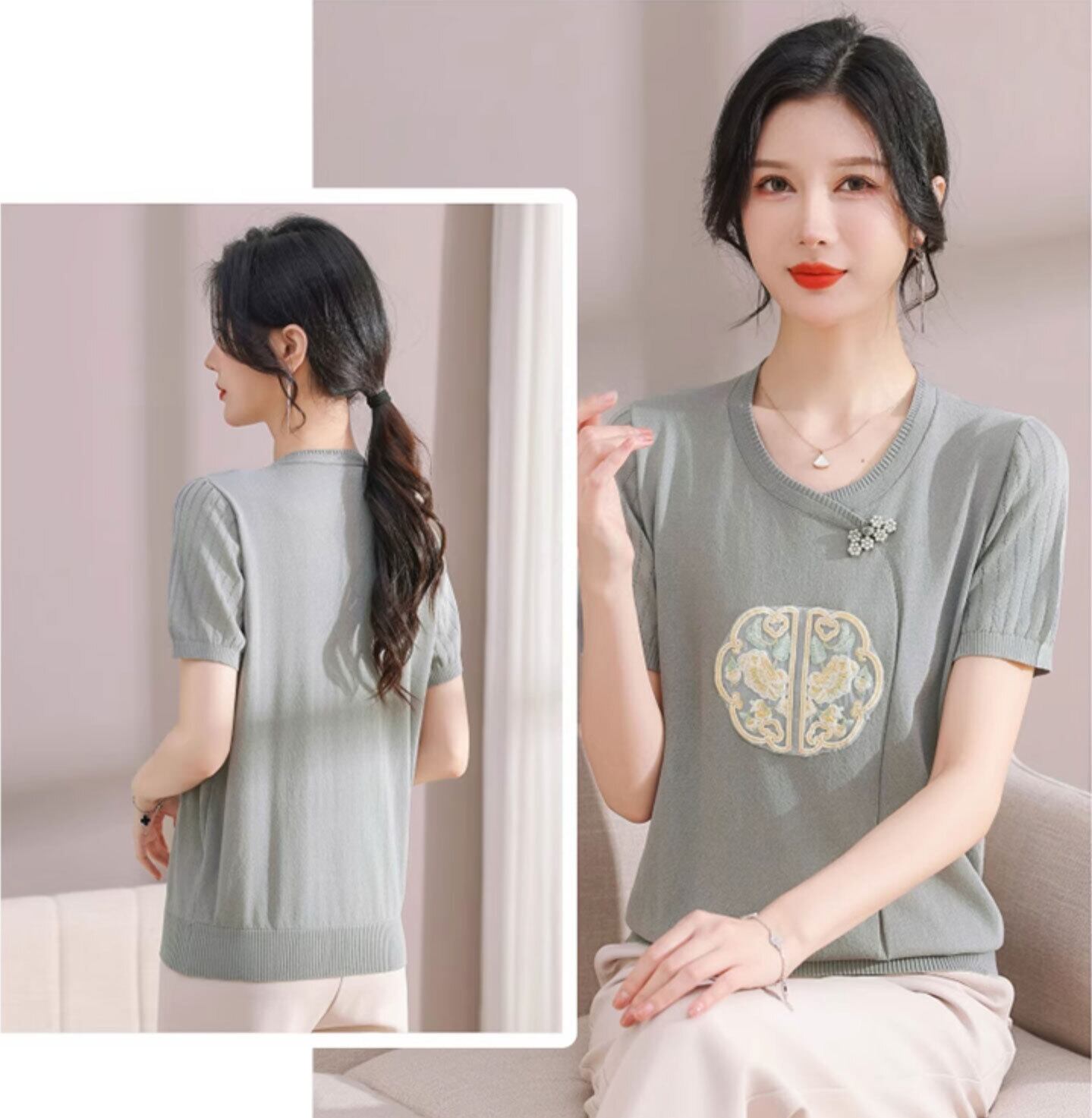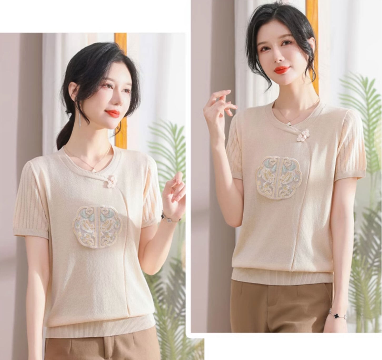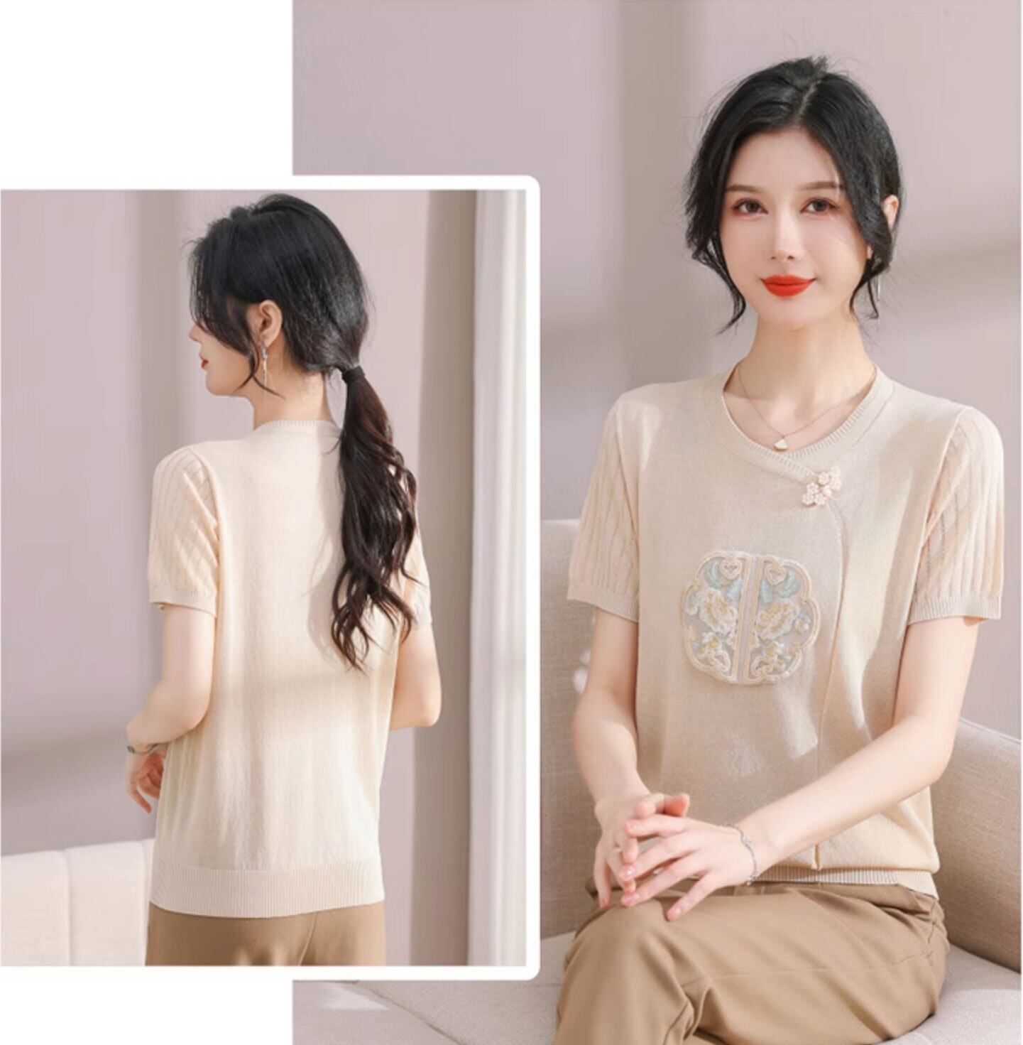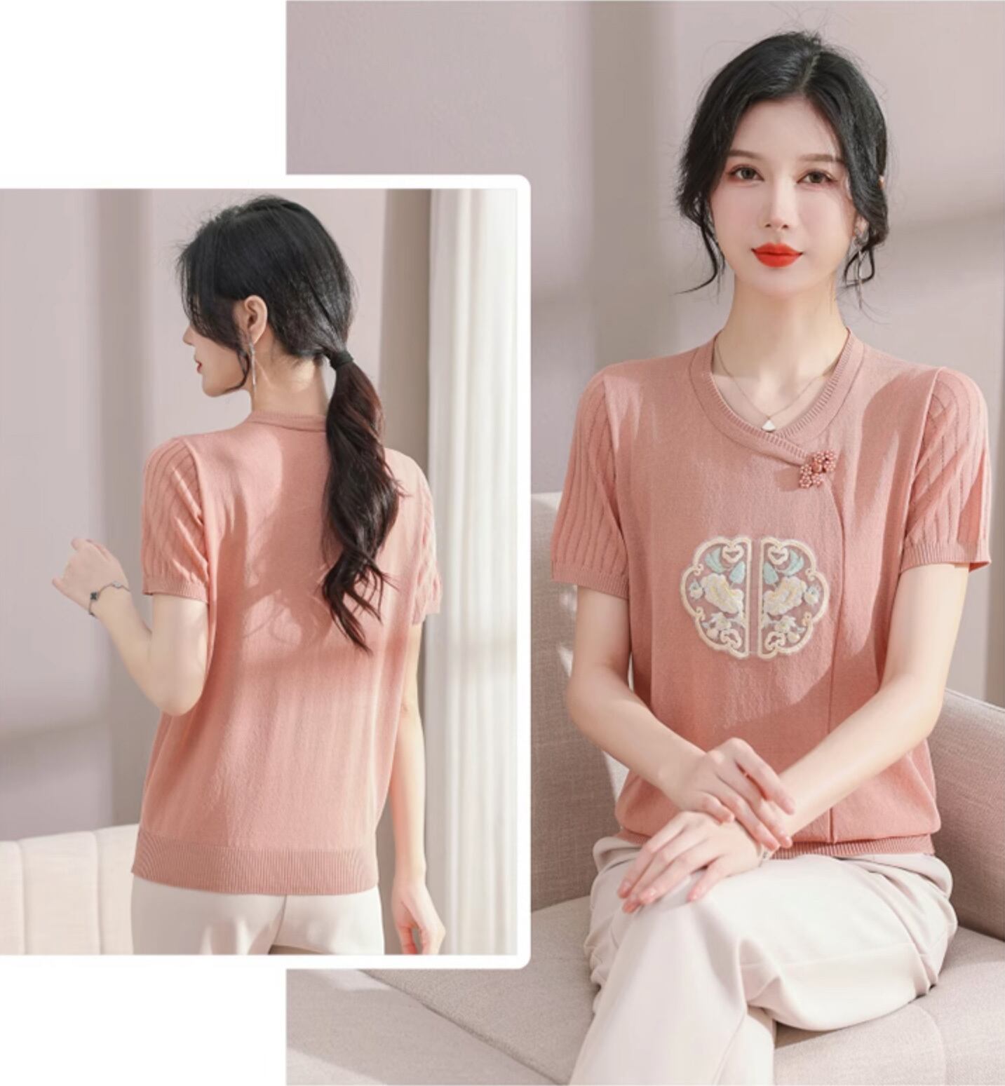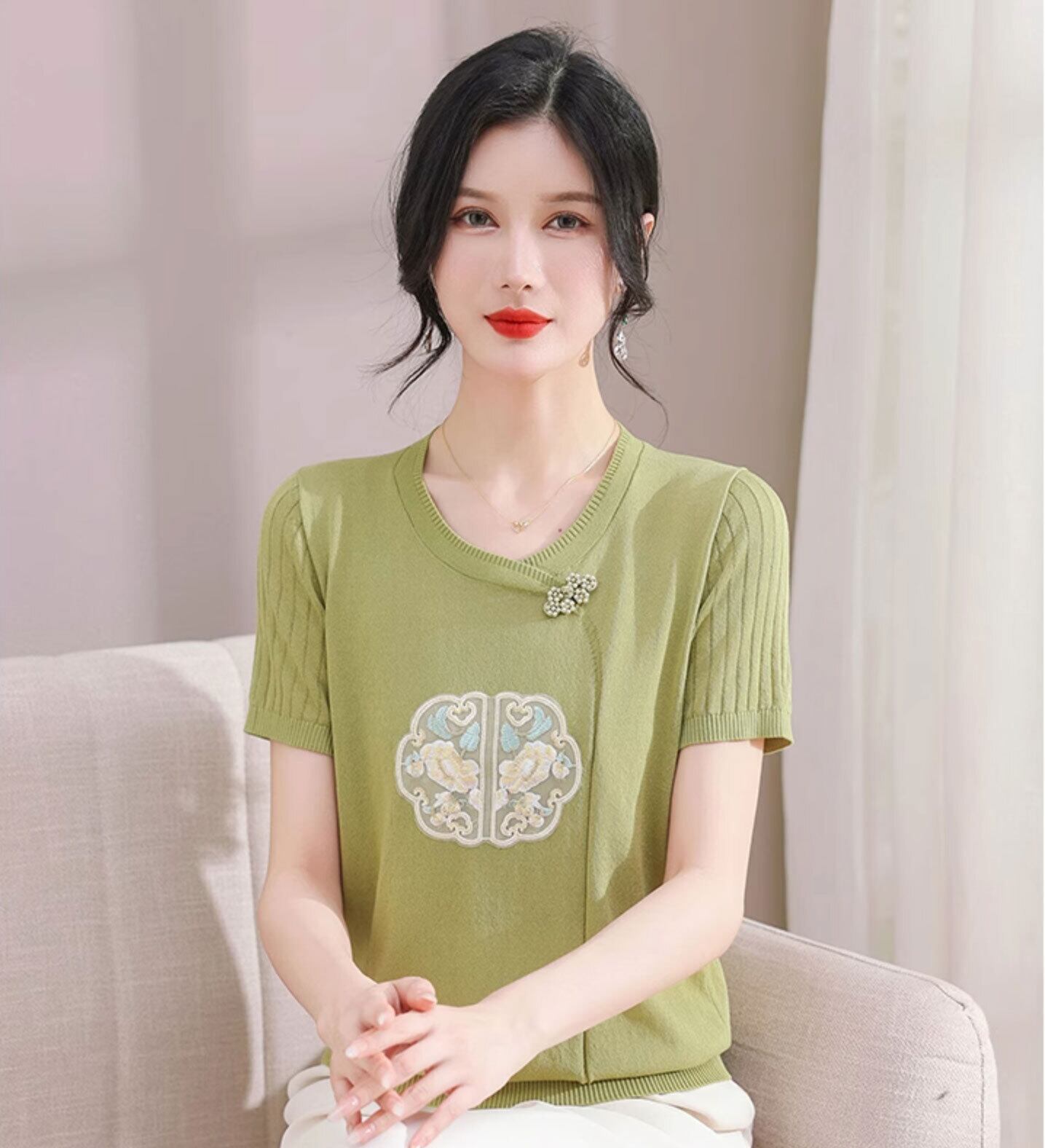 チャイナ服 トップス サマーニット 上品 刺繍 落ち着いた風合い 半袖 襟なし zh519