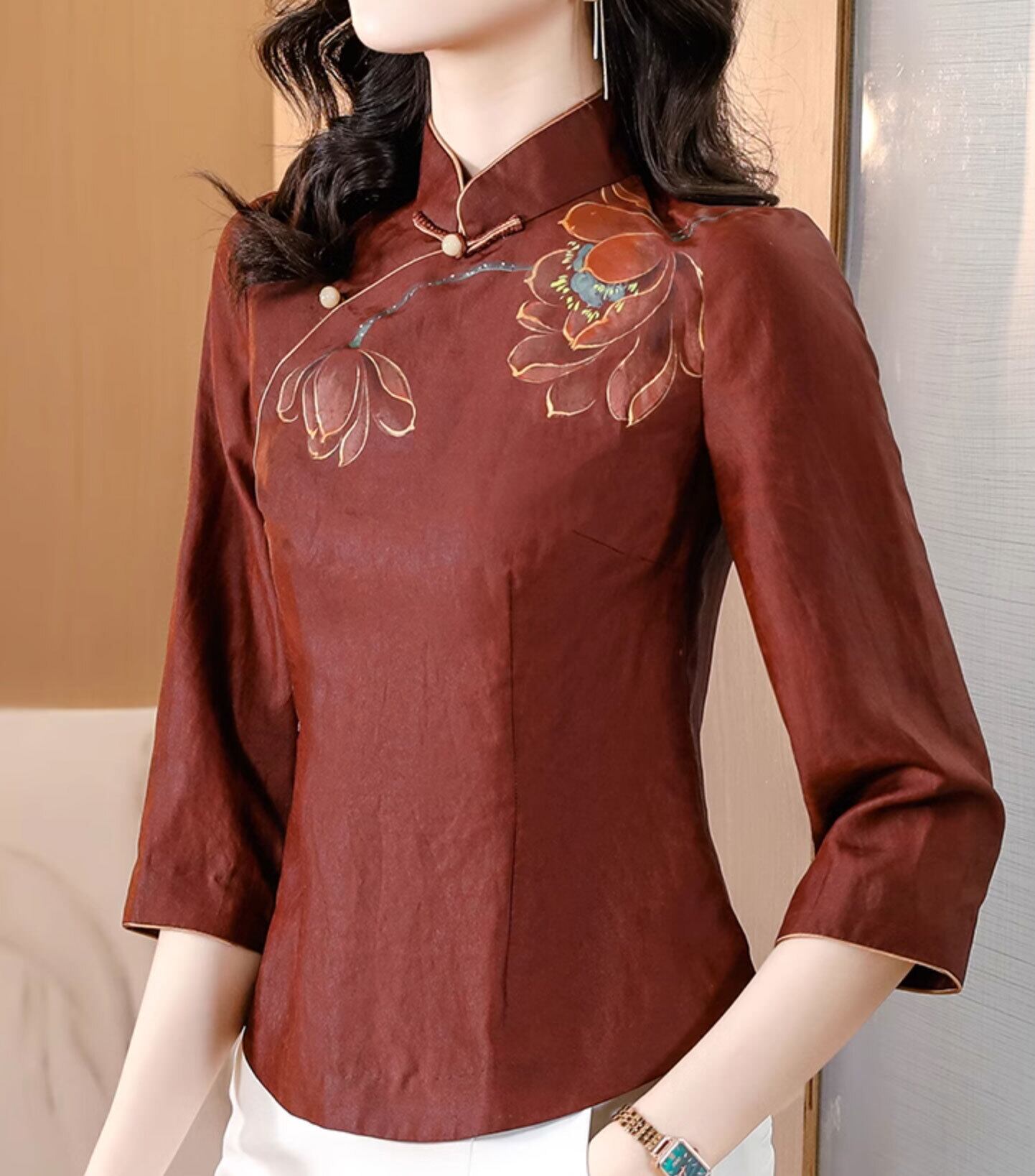 チャイナ服 トップス 上品な風合い 高襟 花柄 七分袖 普段着チャイナトップス zh527
