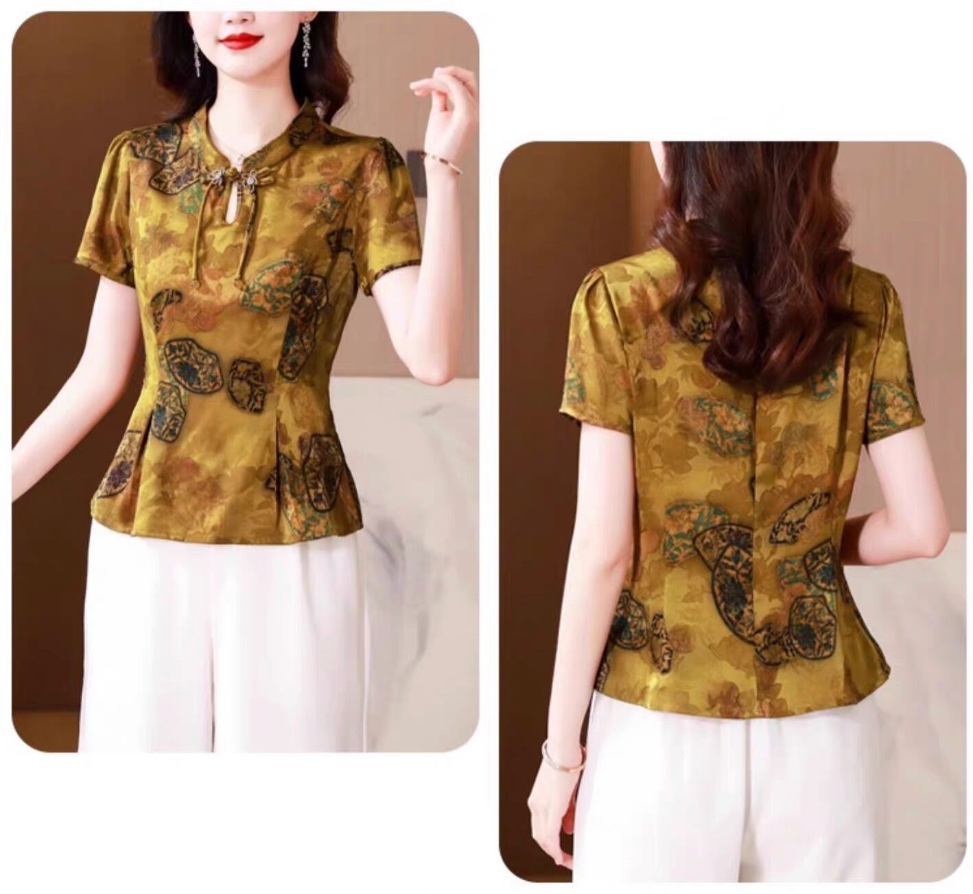 チャイナ服 トップス 上品 落ち着いた風合い イエロー 浅襟 半袖 普段着チャイナトップス 二胡衣装 zh530