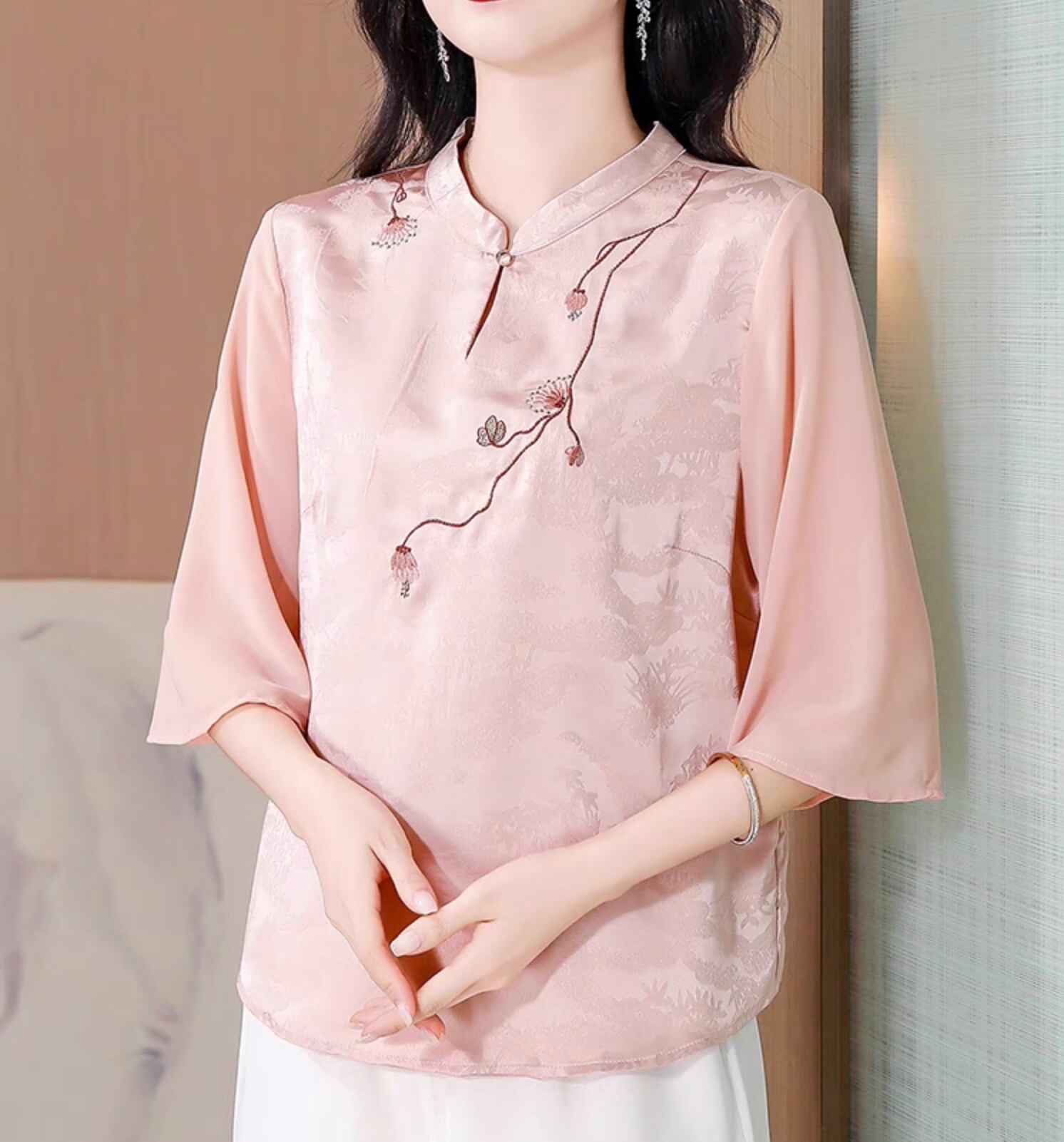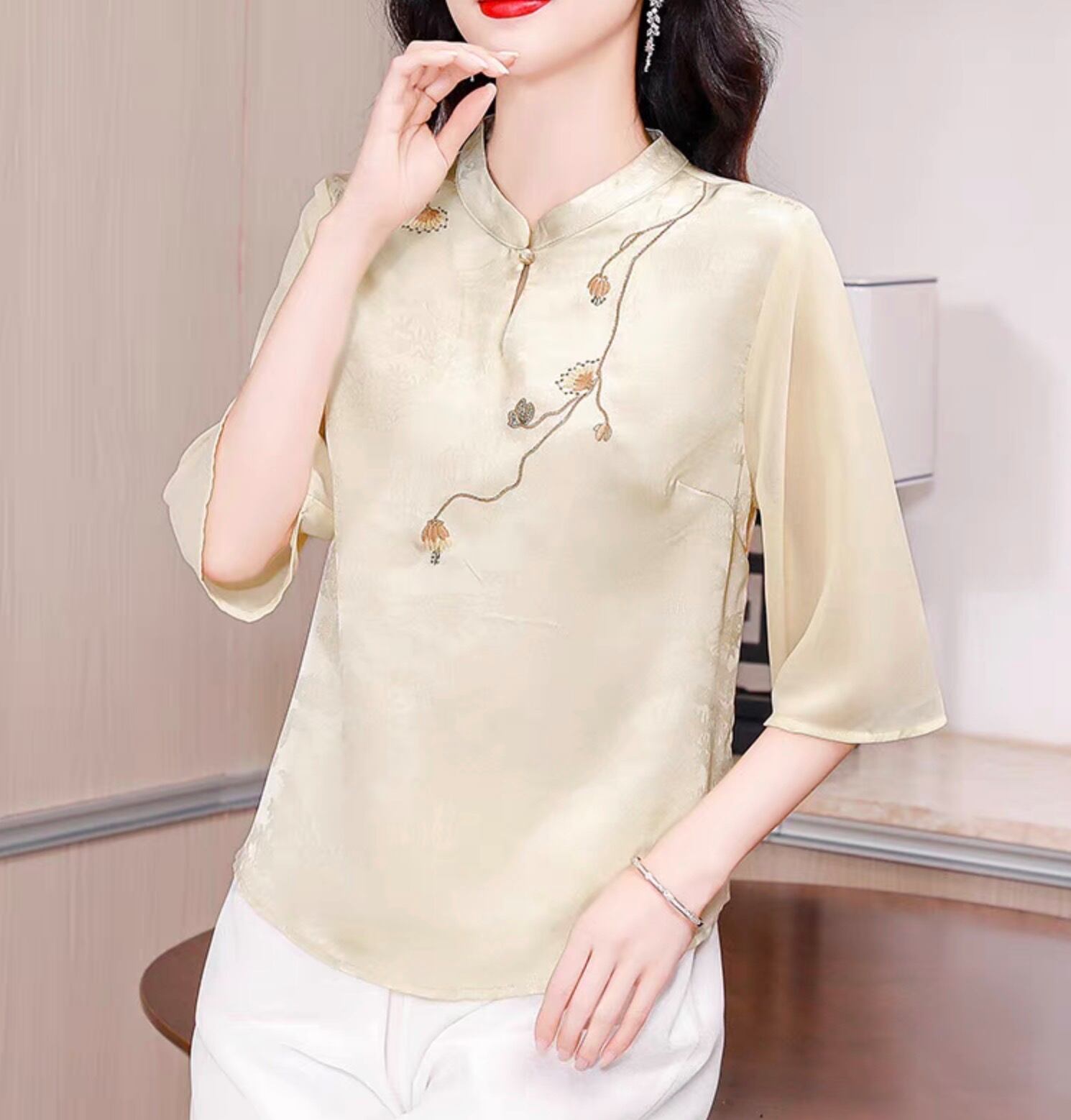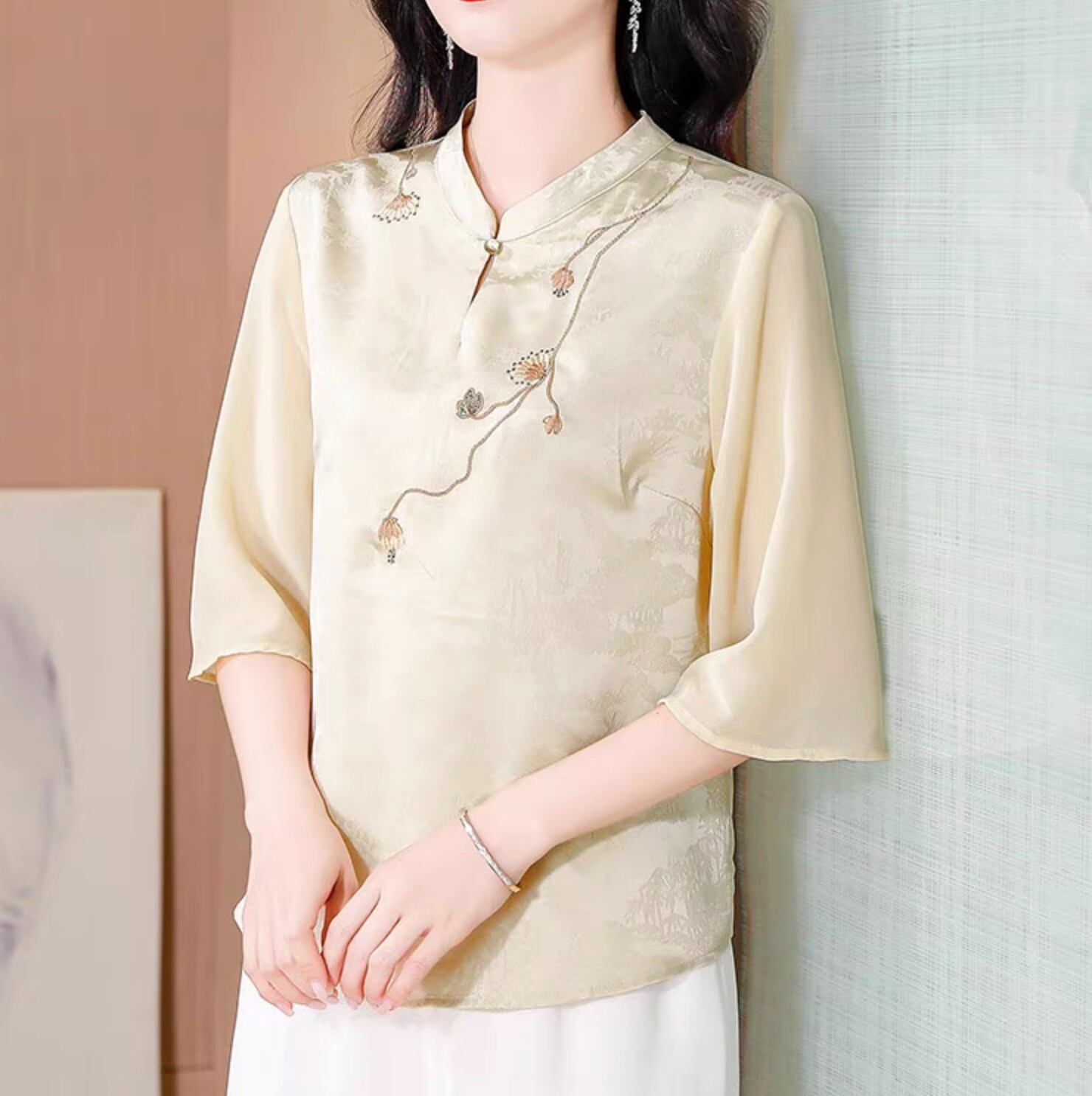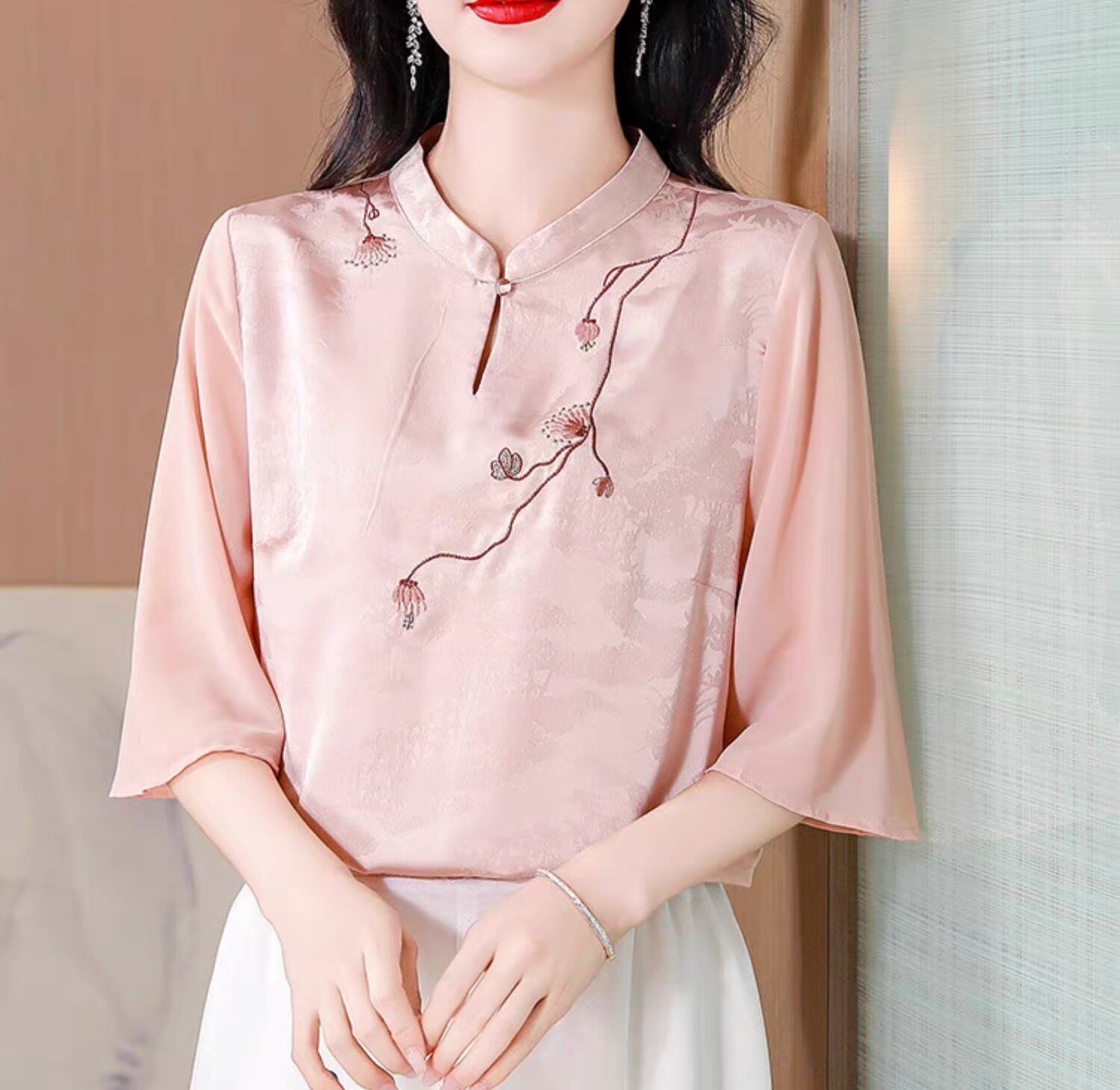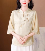 チャイナ服 トップス 上品な風合い 春夏薄手 浅襟 五分袖 普段着チャイナトップス zh531