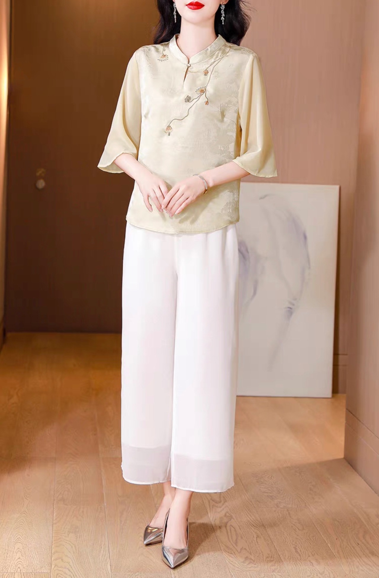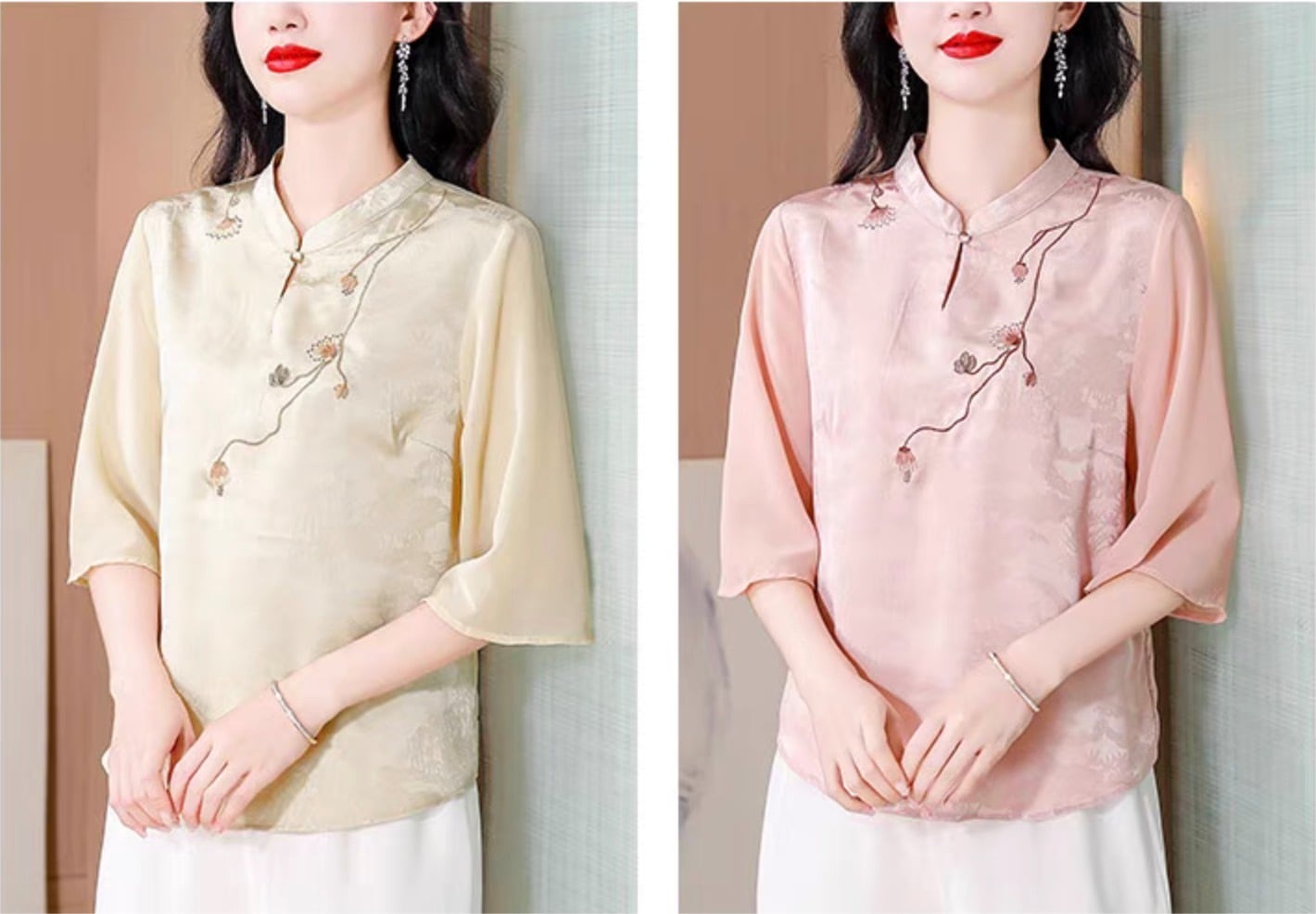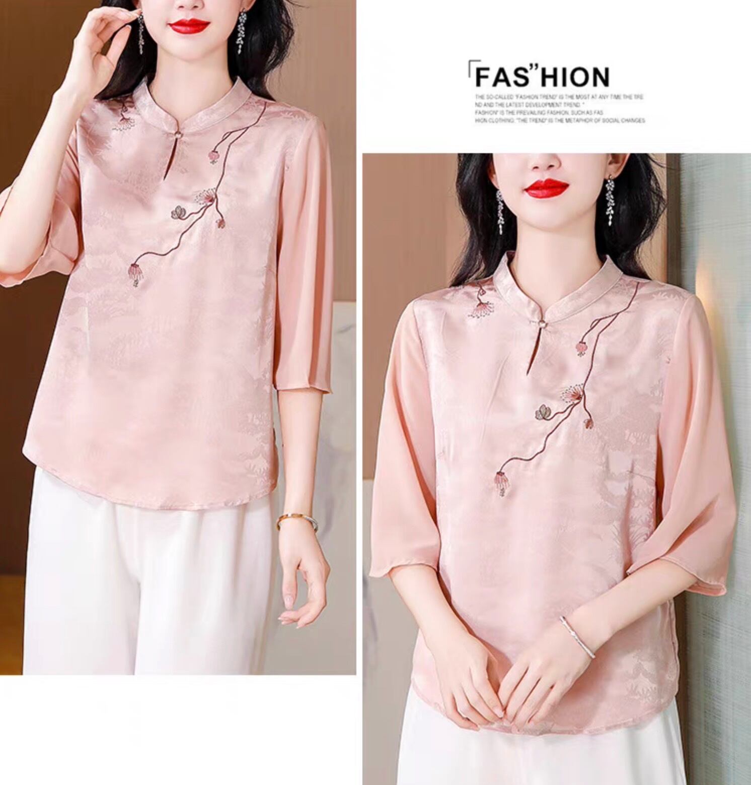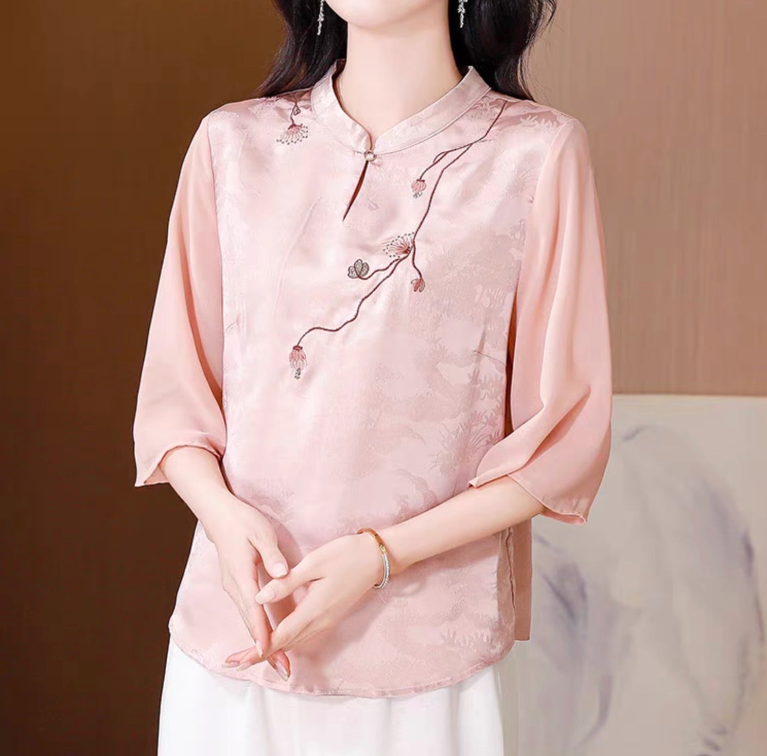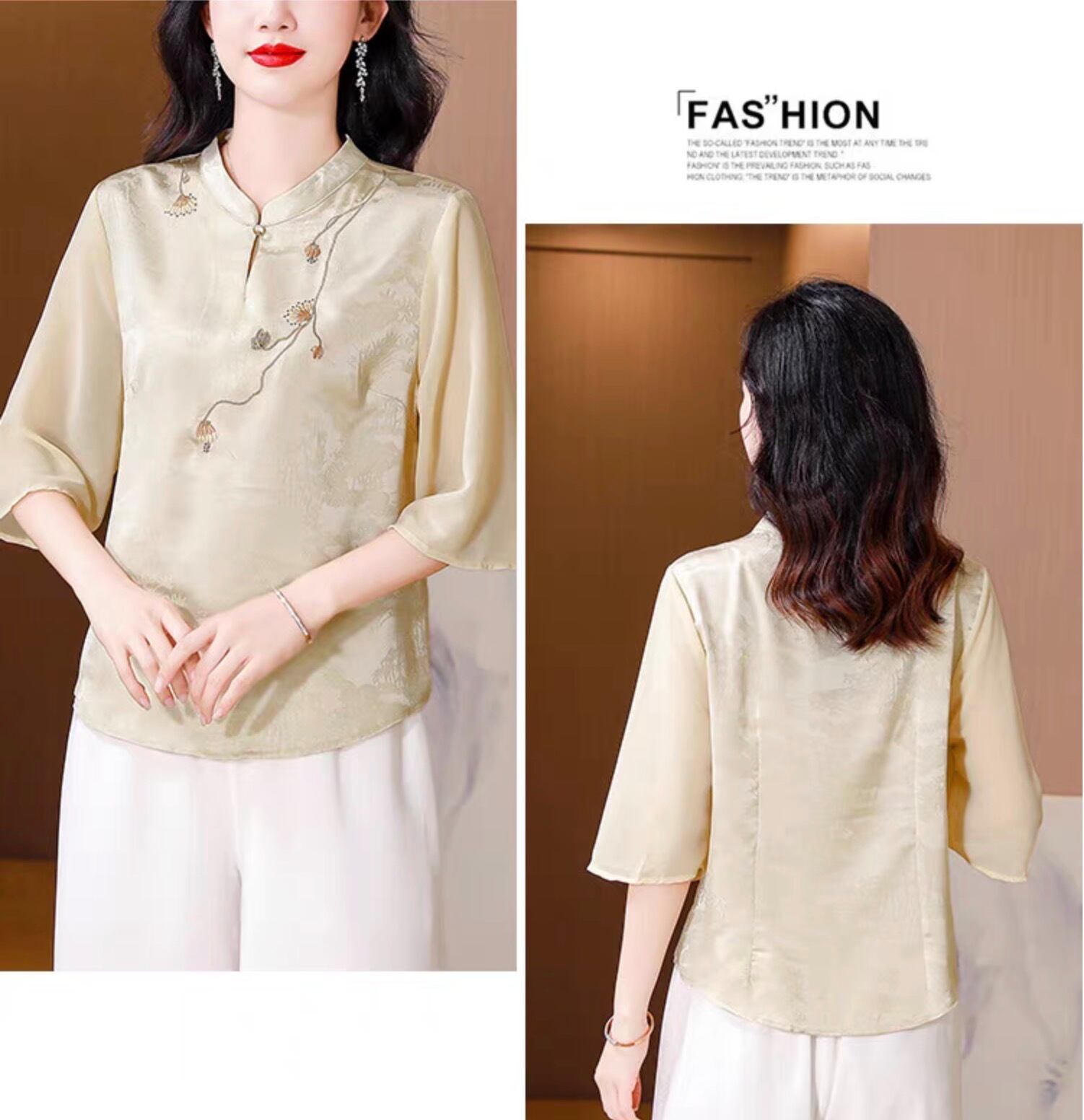 チャイナ服 トップス 上品な風合い 春夏薄手 浅襟 五分袖 普段着チャイナトップス zh531
