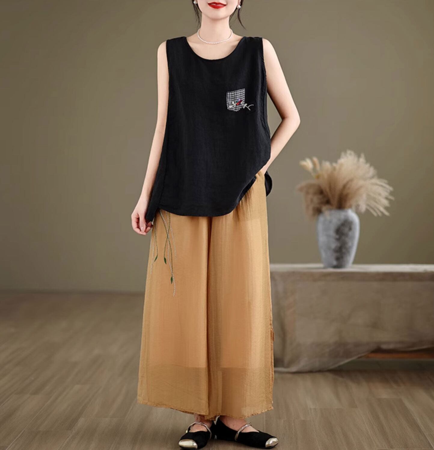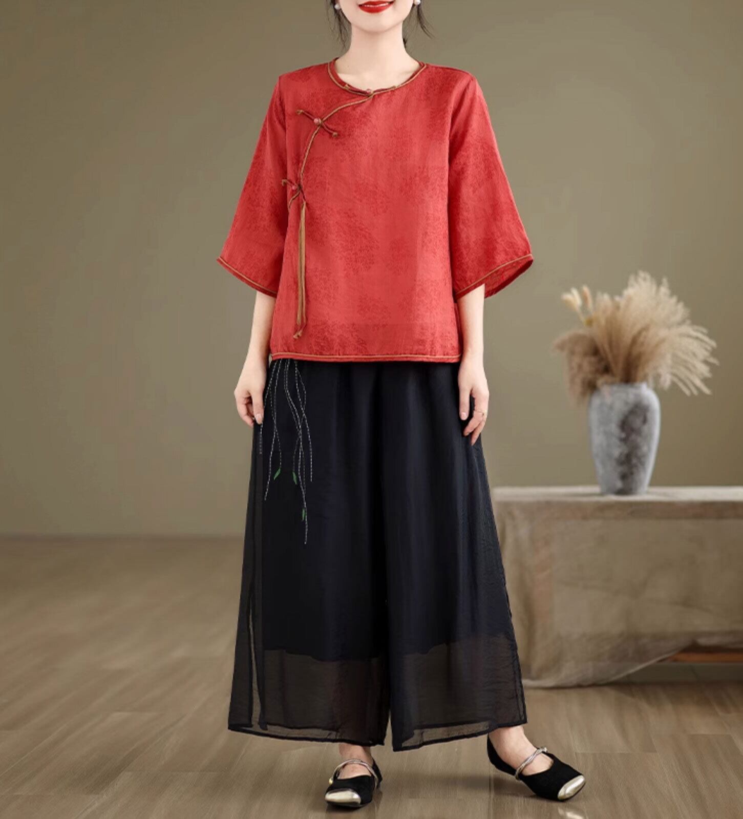 チャイナ服 ワイドパンツ 春夏薄手 刺繍 ゆったりシルエット 爽やかな風合い zb219
