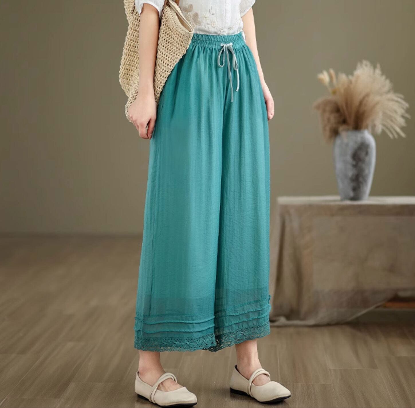 チャイナ服 ワイドパンツ 春夏薄手 シンプル ゆったりシルエット 九分丈 爽やかな風合い zb220