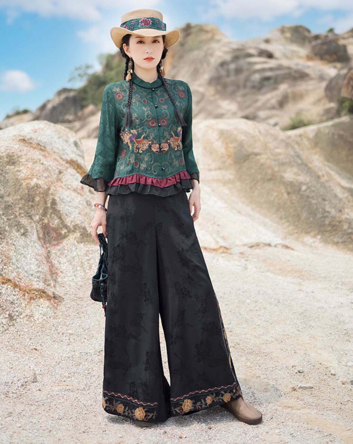 チャイナ服 ワイドパンツ 凝った刺繍 ロング丈 zb222
