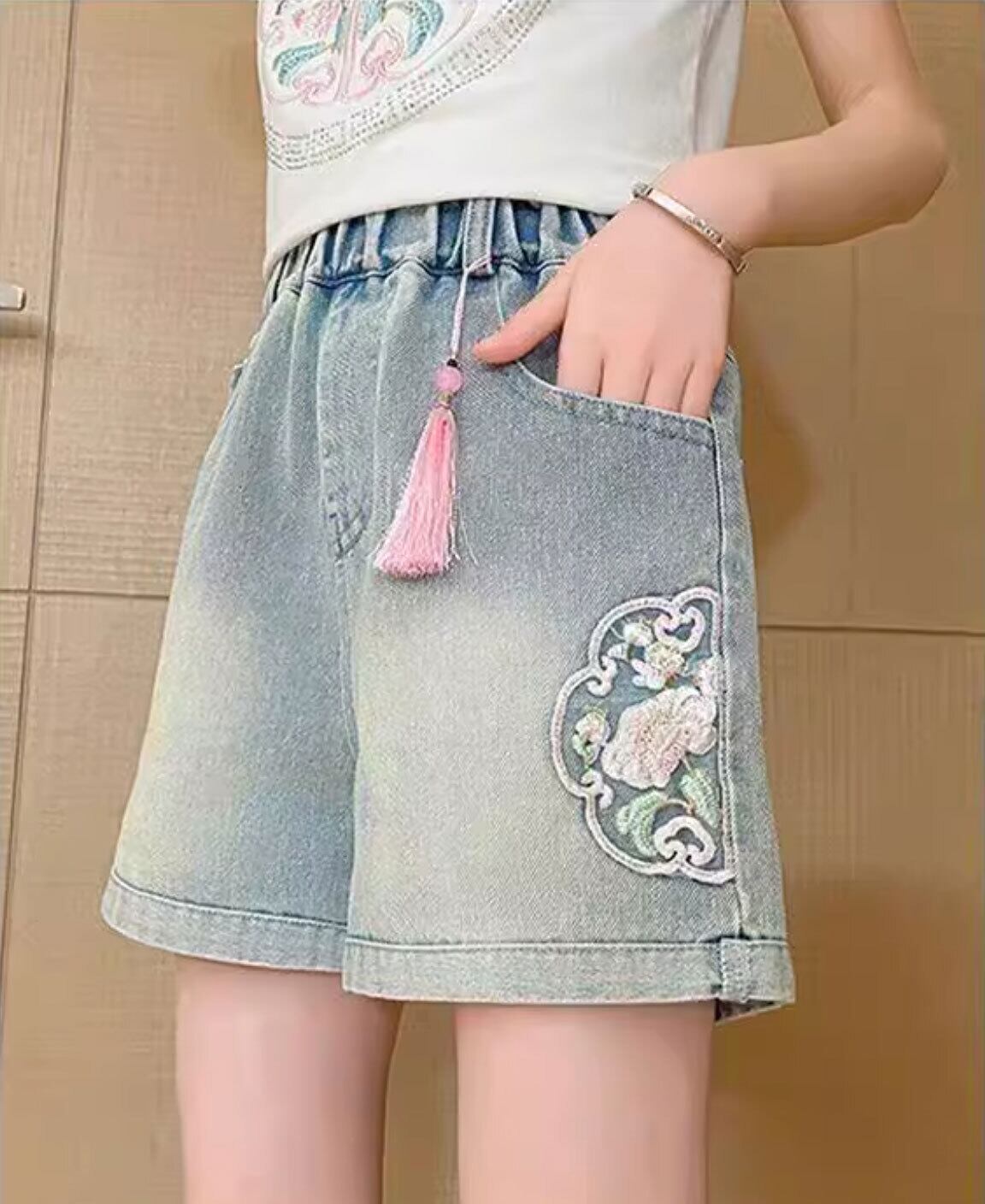 チャイナ服 ショートパンツ デニム 刺繍 チャイナ短パン タッセル zb225