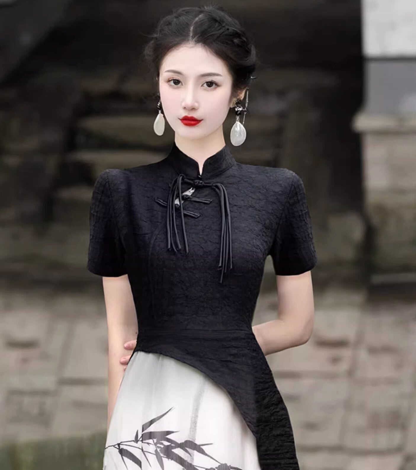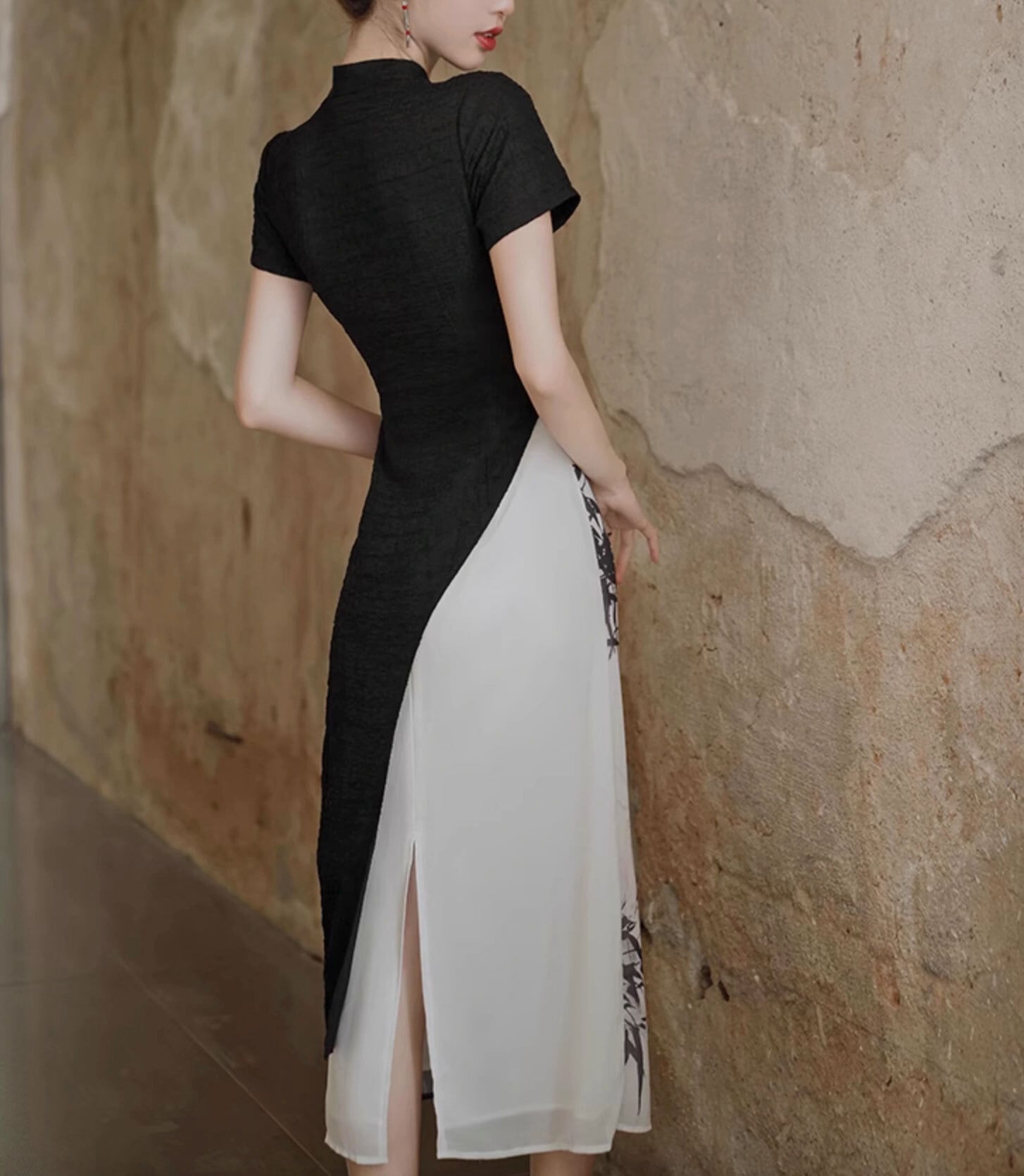 チャイナドレス チャイナ服 水墨画柄 半袖 ロングワンピース 重ね着風 チーパオ zl439