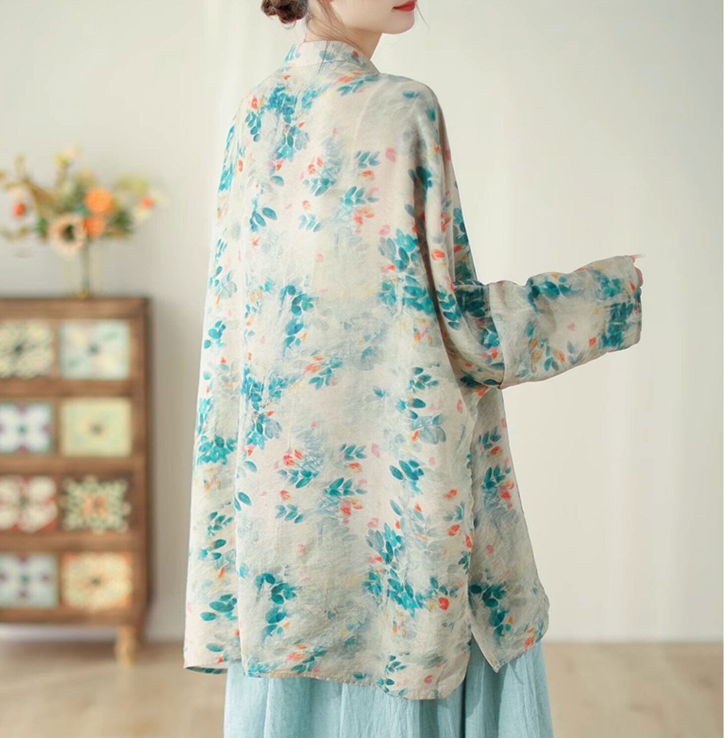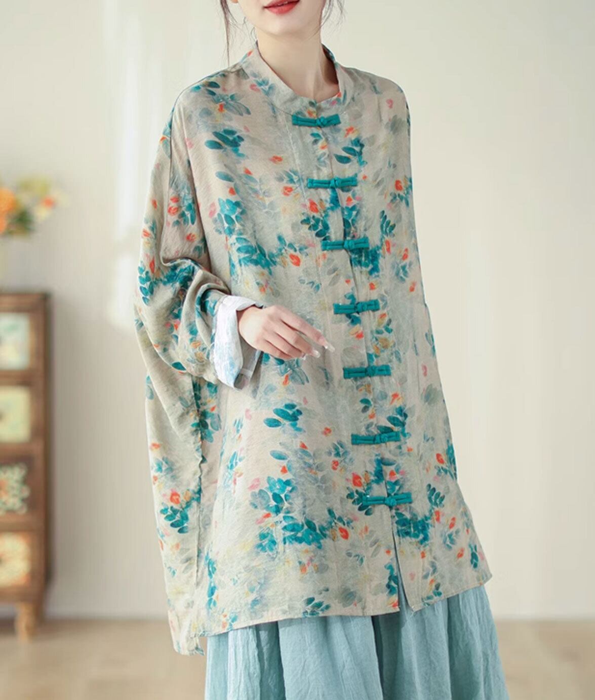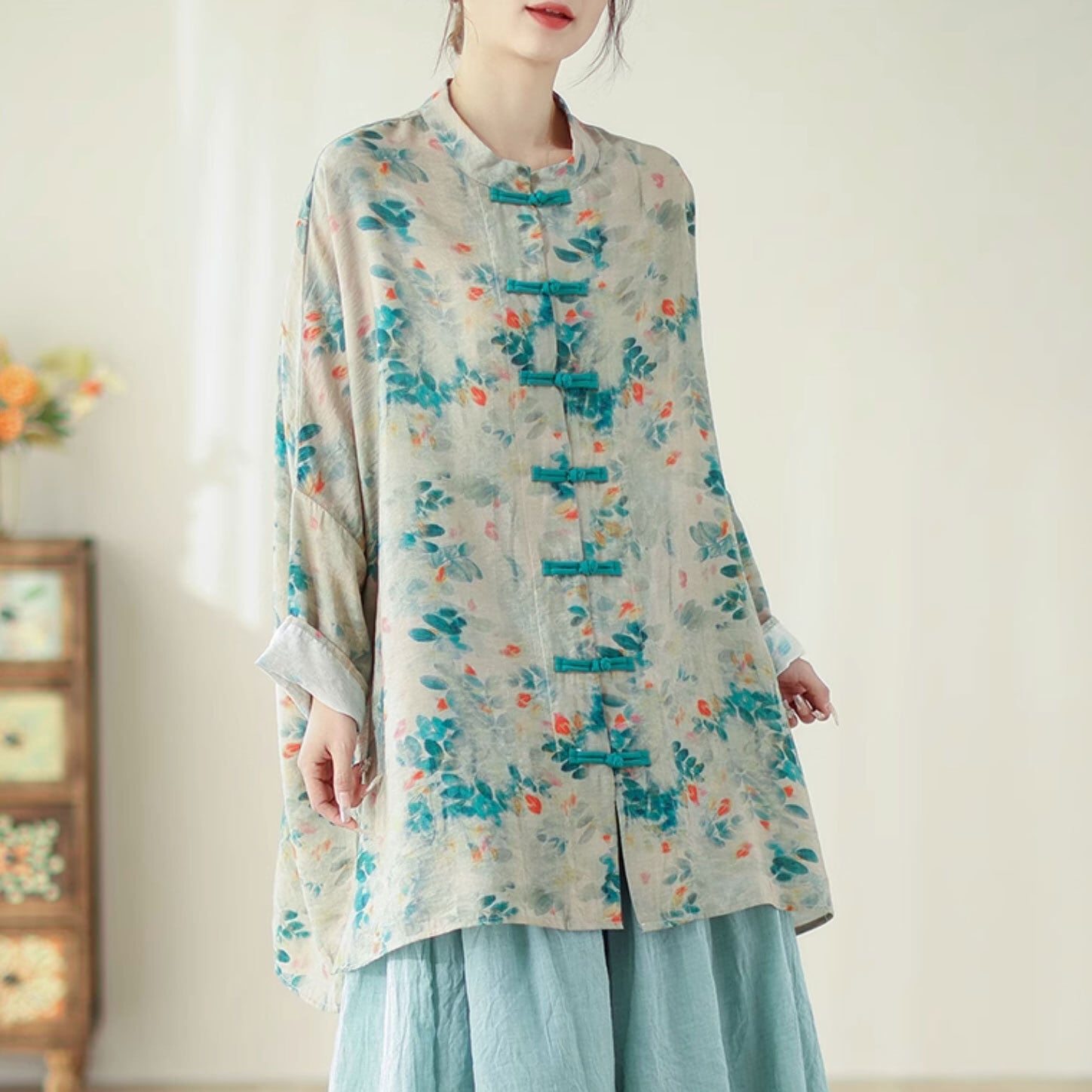 チャイナ風ロングトップス 春夏 薄手長袖 涼しげな風合い zt554
