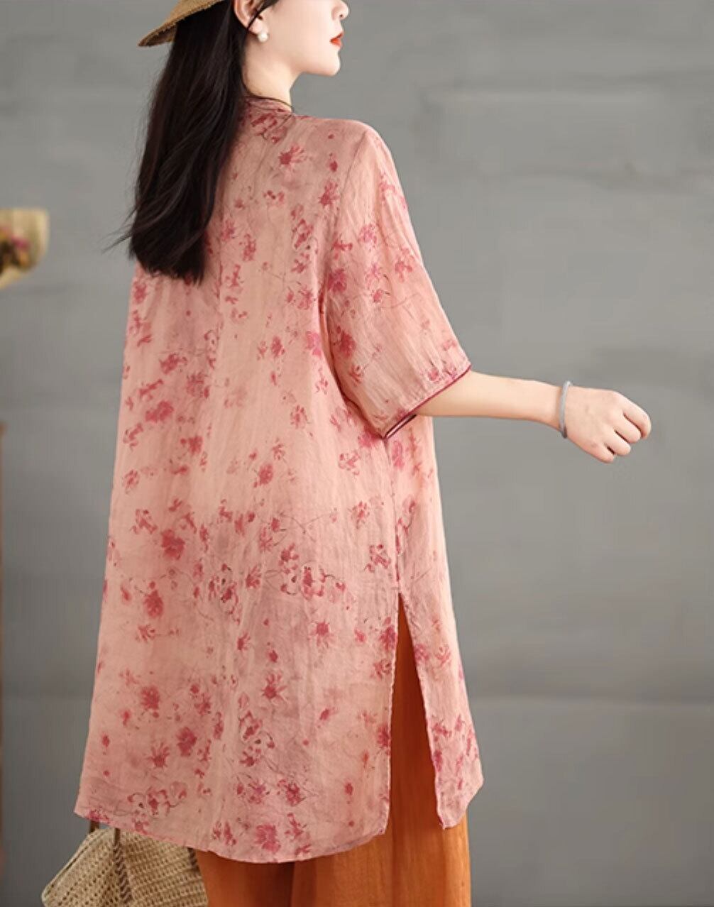 チャイナ風ロングトップス 春夏薄手 素朴 涼しげな風合い ピンク ゆったり zh542