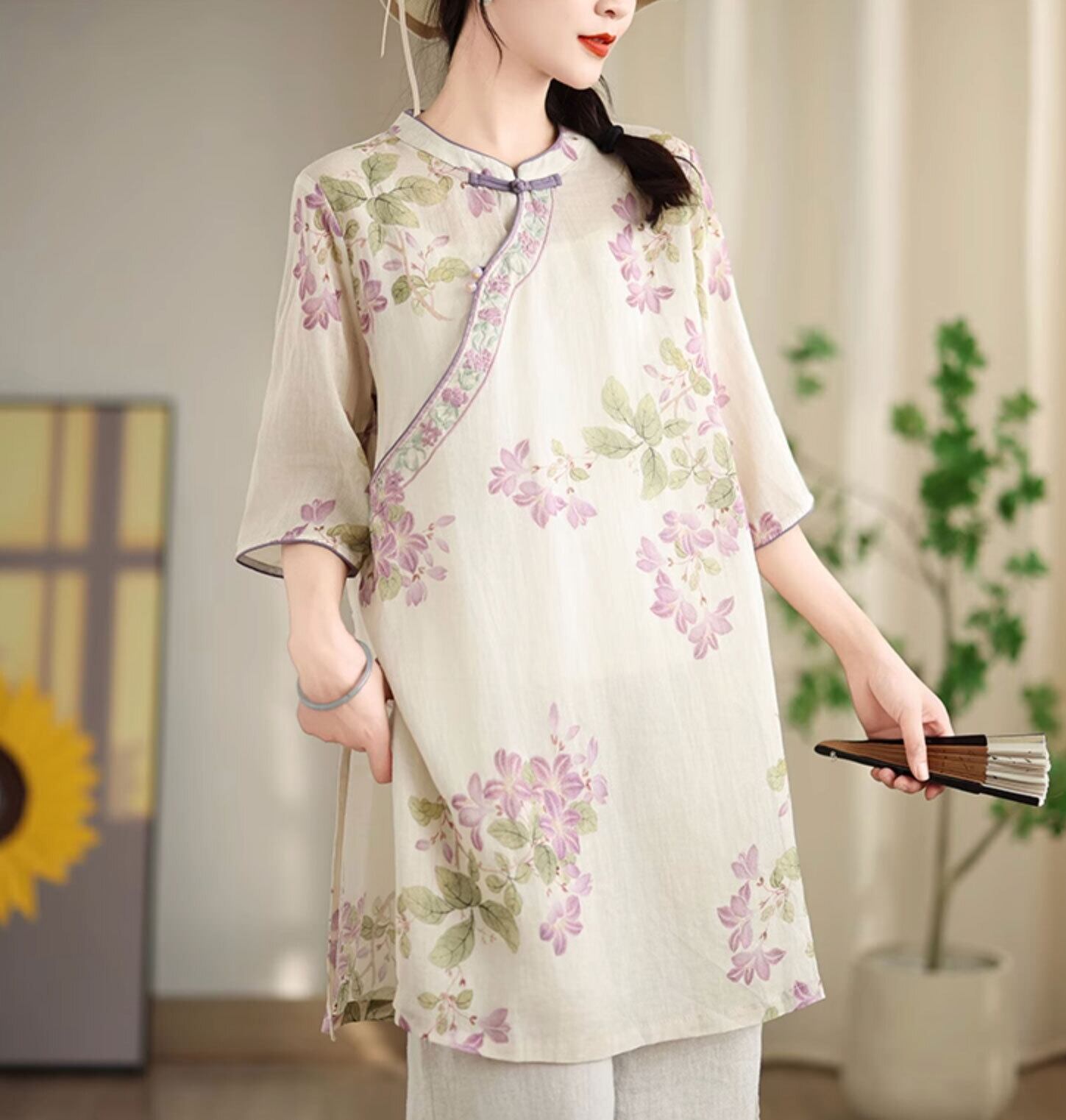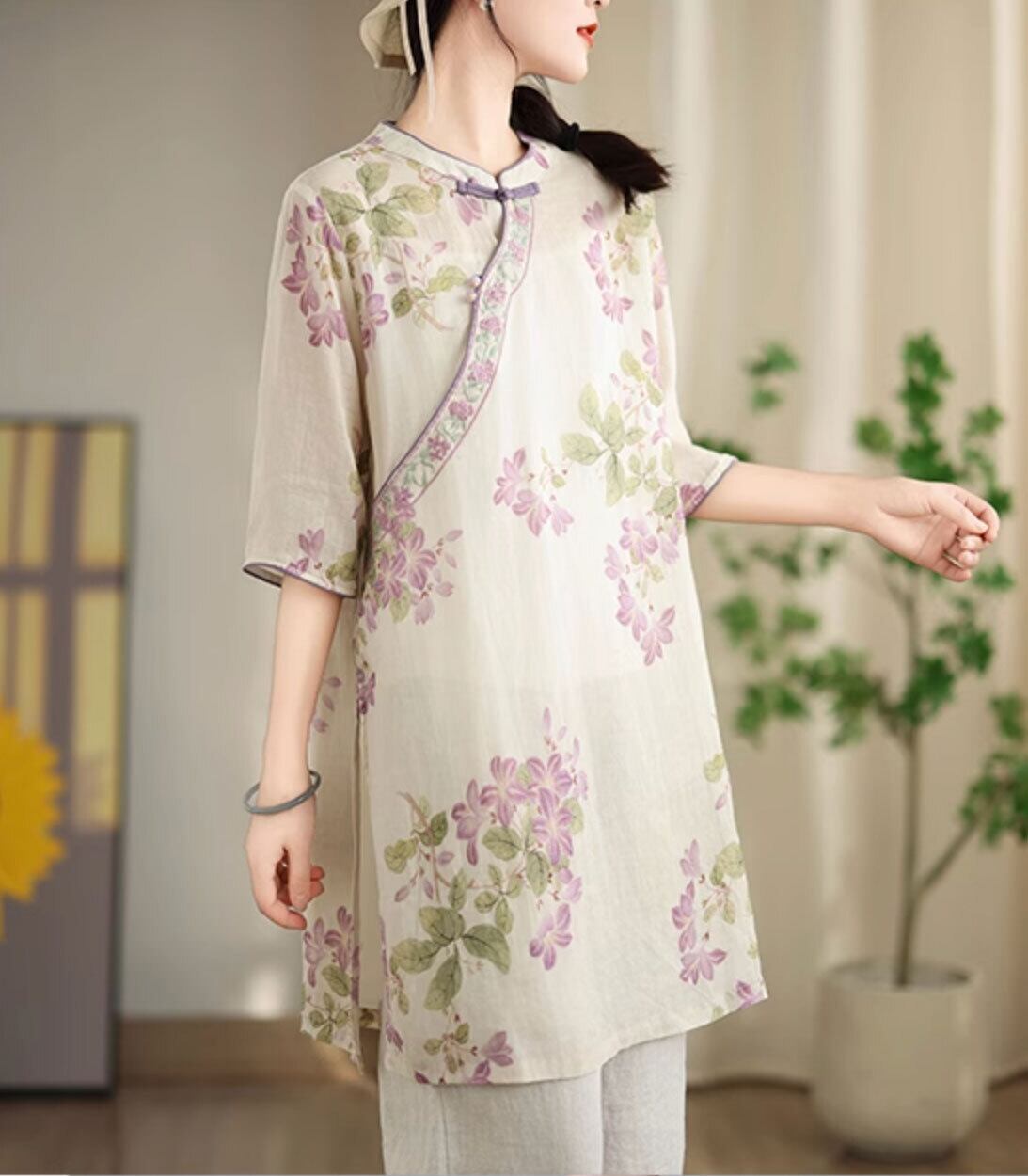 チャイナ風ロングトップス 春夏薄手 素朴 ゆったり 涼しげな風合い zh544