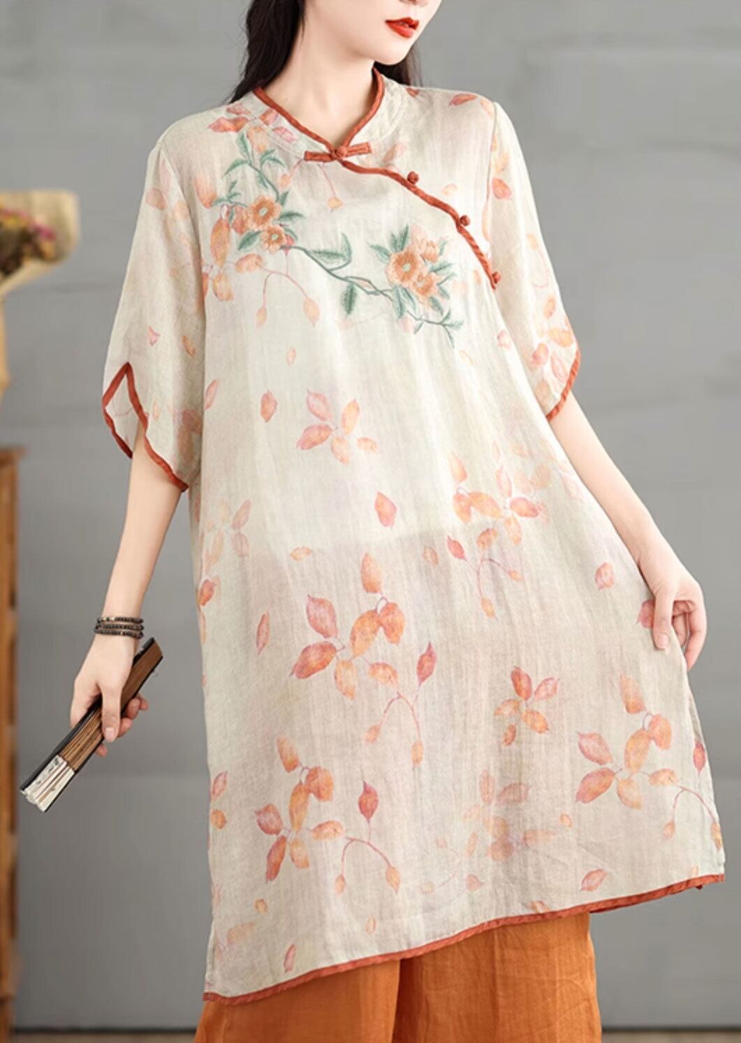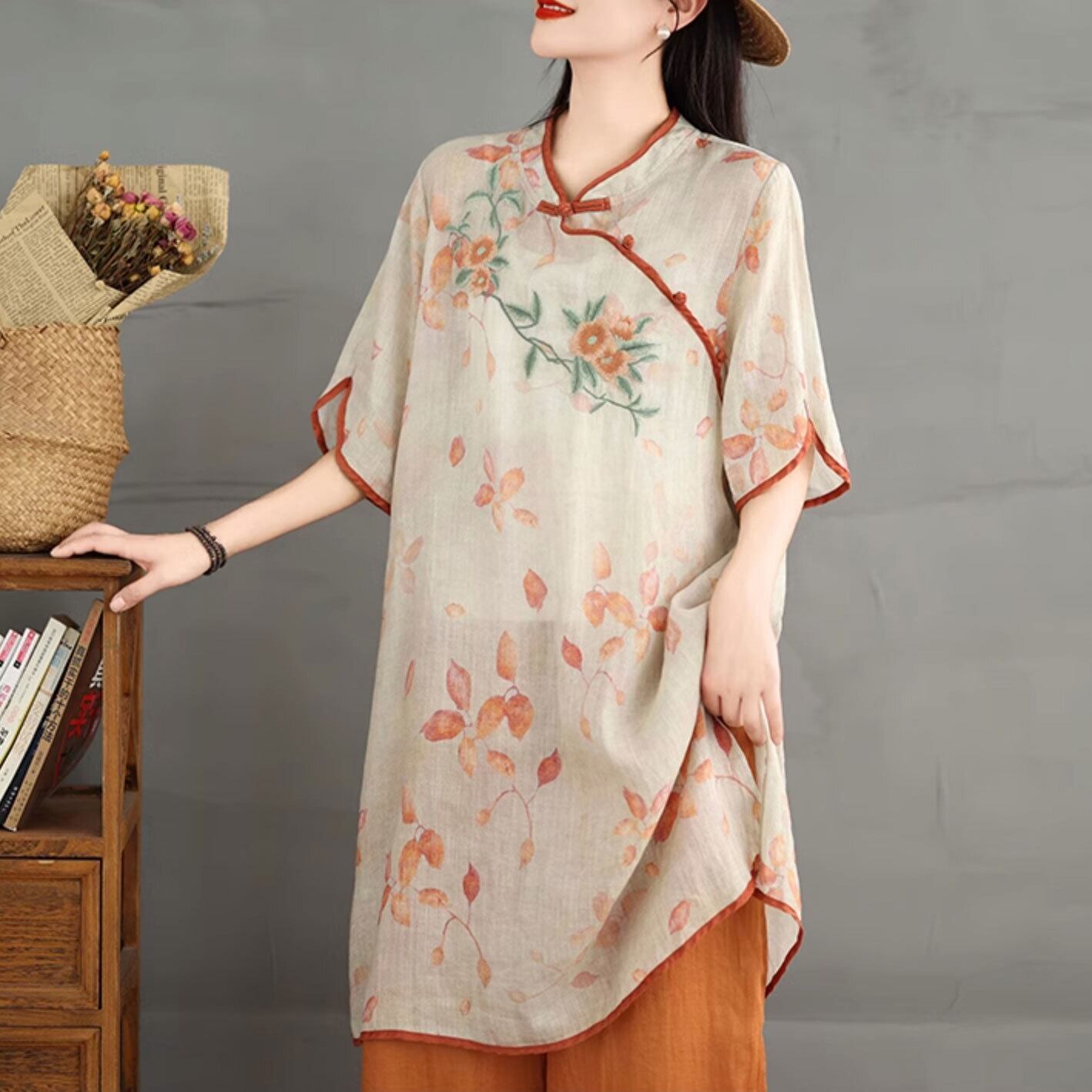 チャイナ風ロングトップス 春夏薄手 素朴 ゆったり 素朴な風合い zh545
