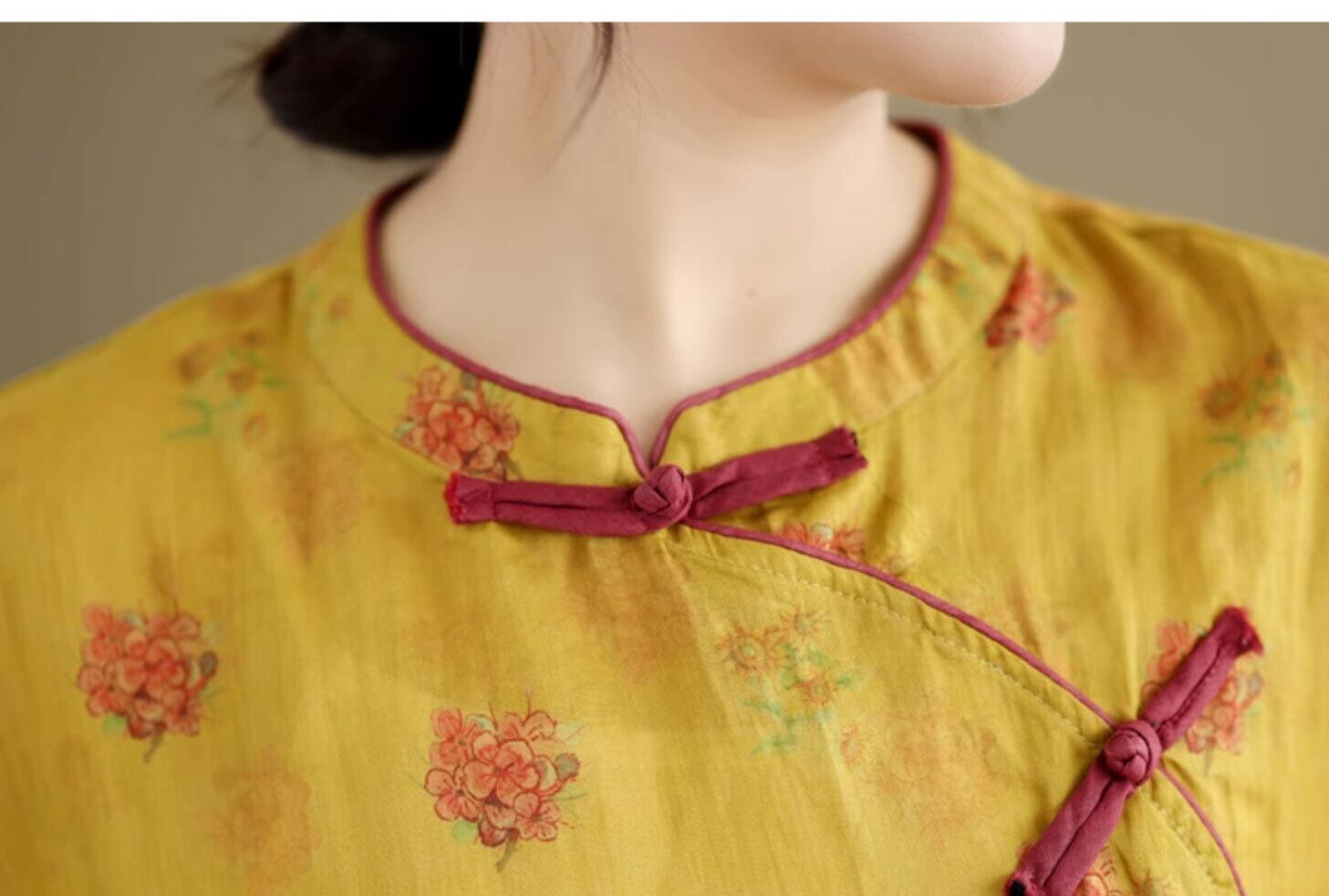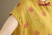 チャイナ風トップス イエロー ゆったり 春夏 薄手 素朴な風合い 花柄 zh547