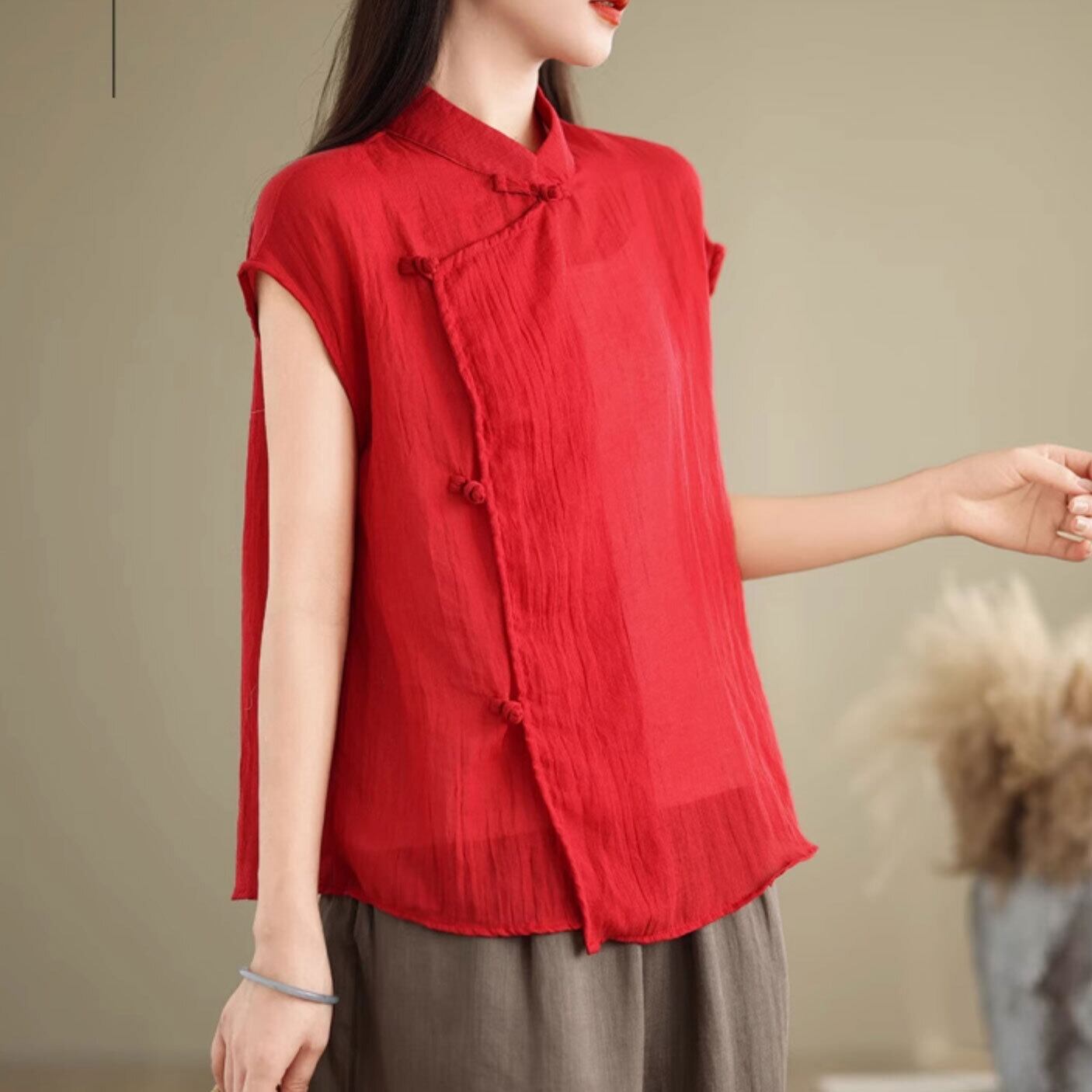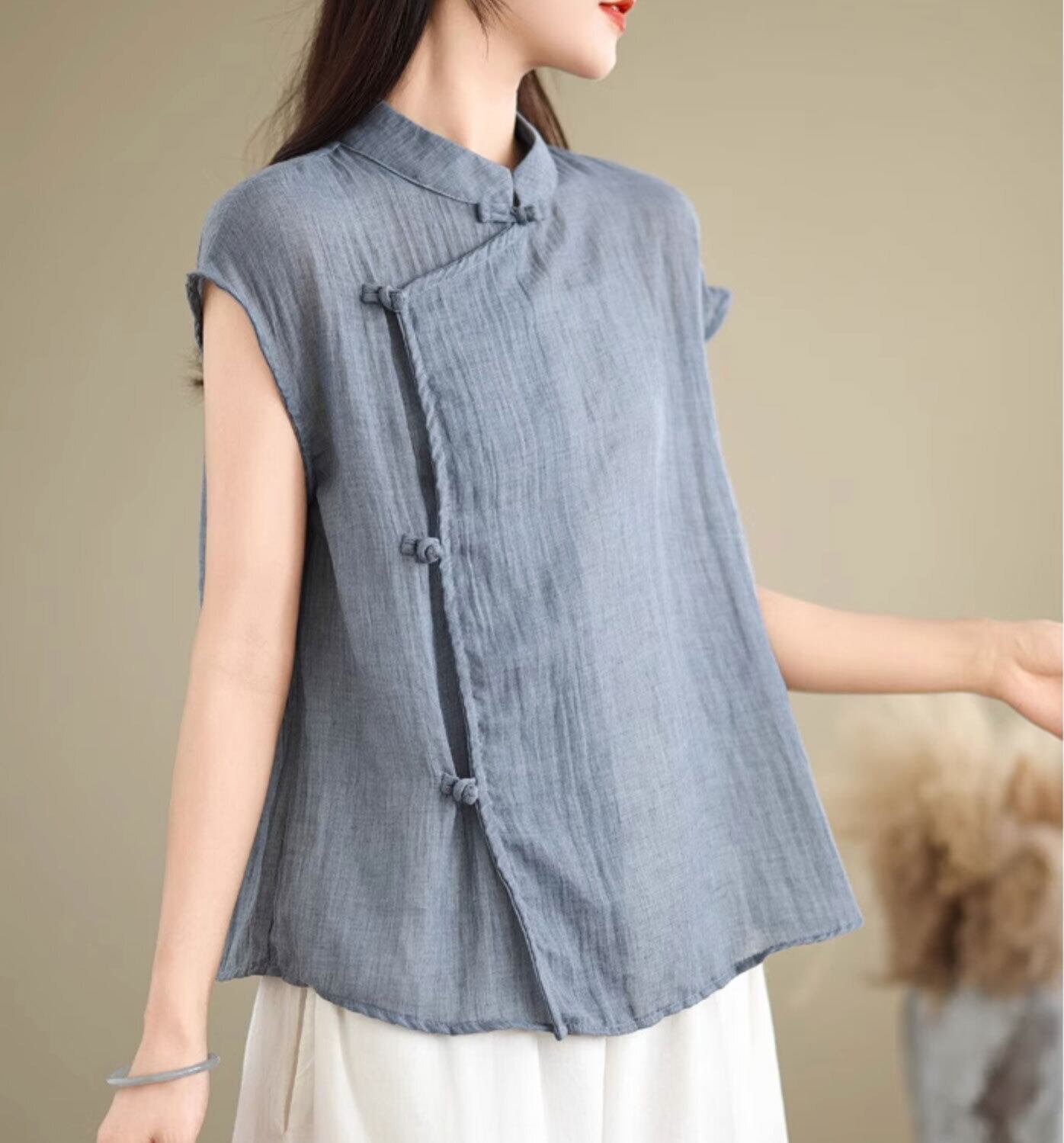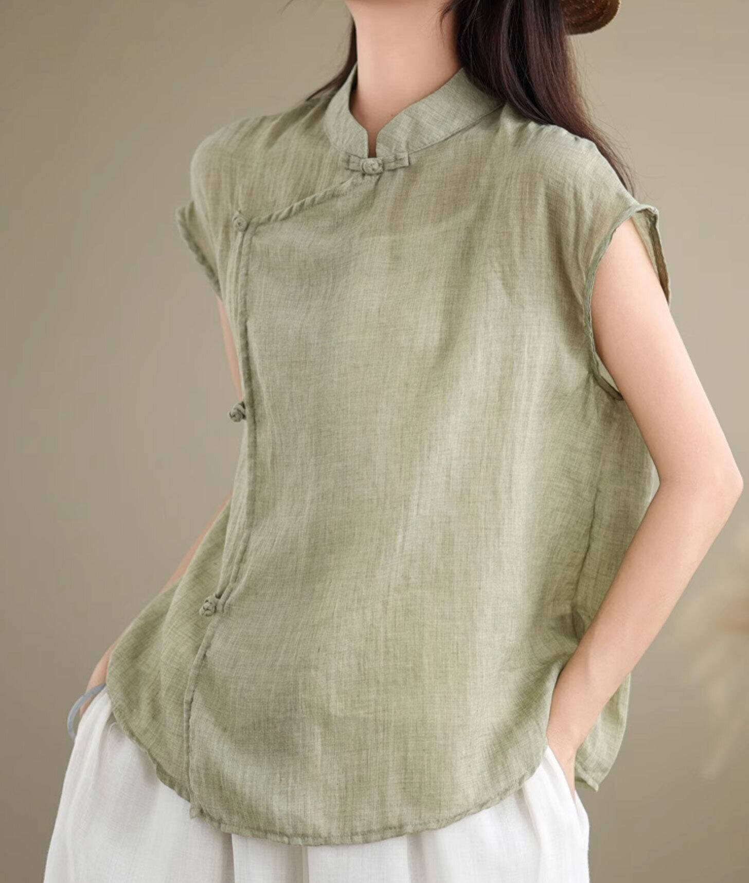チャイナ風トップス 春夏薄手 シンプル無地 素朴 落ち着いた風合い 半袖 zh550