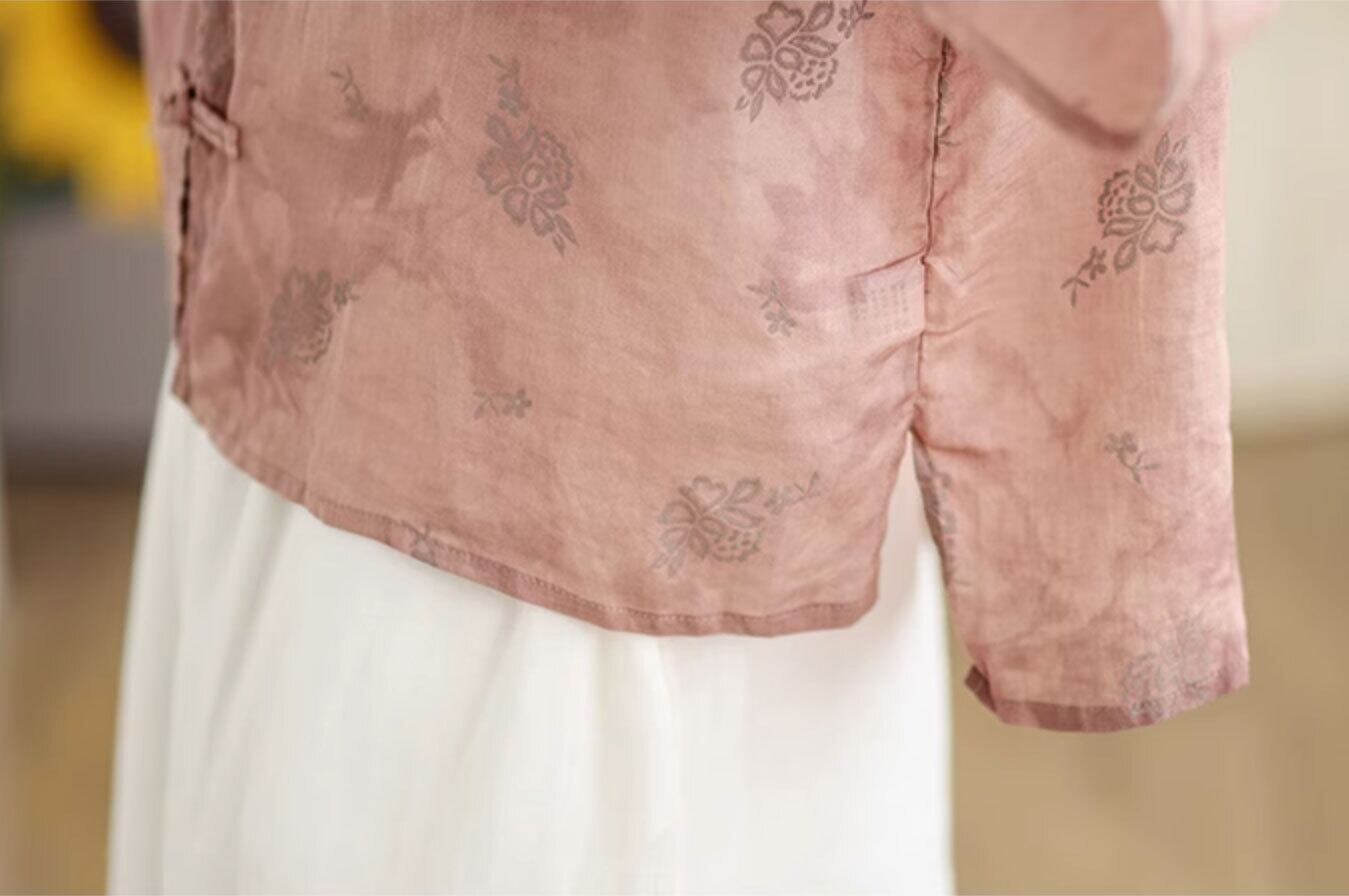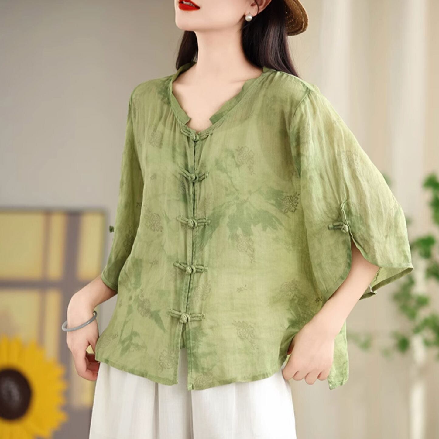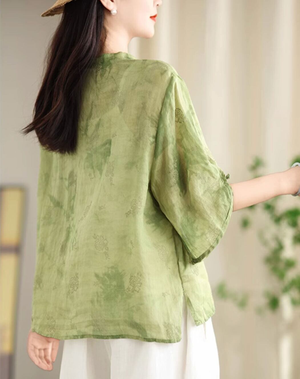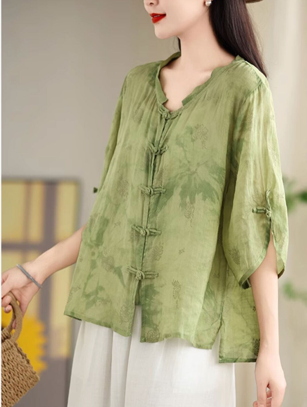 チャイナ風トップス ゆったり 春夏薄手 七分袖 素朴 落ち着いた風合い zh552