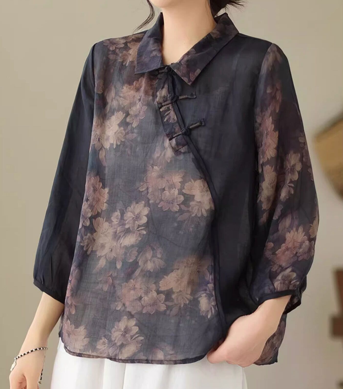 チャイナ風トップス ゆったり 春夏薄手 七分袖 素朴 落ち着いた風合い zh553