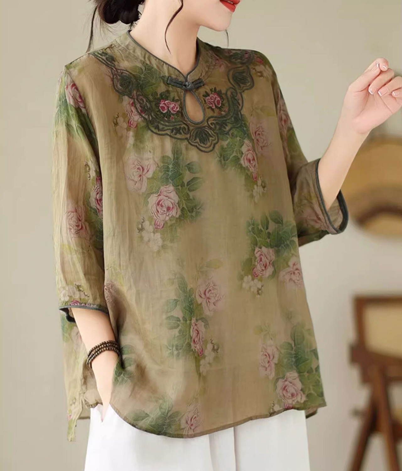 チャイナ風トップス ゆったり 春夏薄手 刺繍 七分袖 素朴 落ち着いた風合い zh554