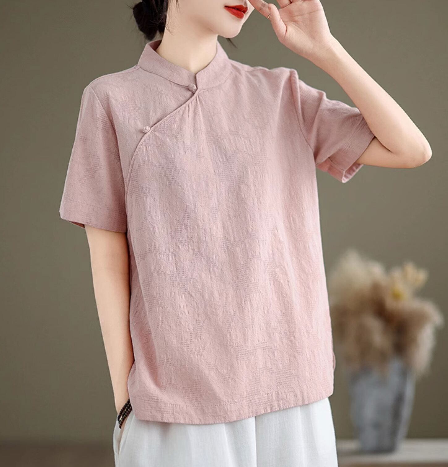 チャイナ服 トップス シンプル 素朴 半袖 落ち着いた風合い zh557