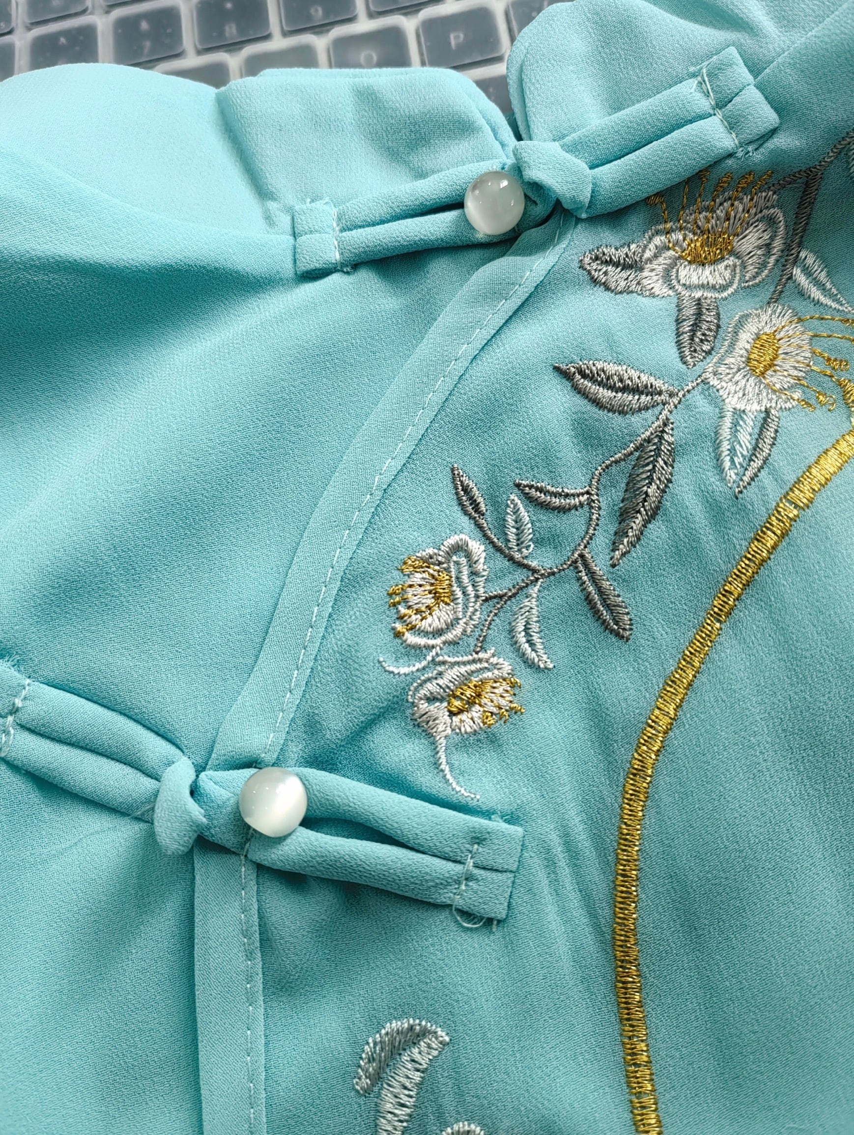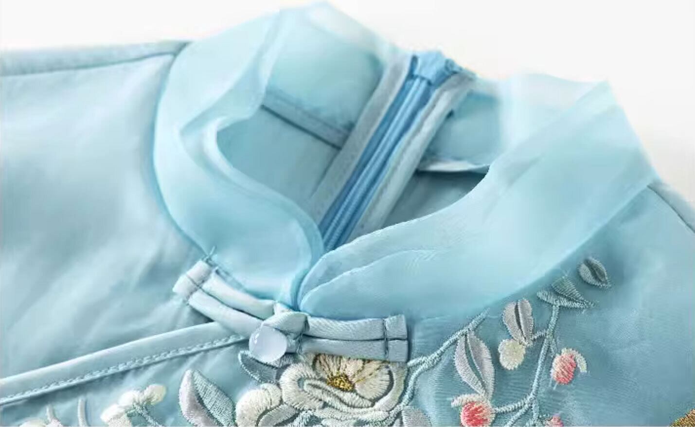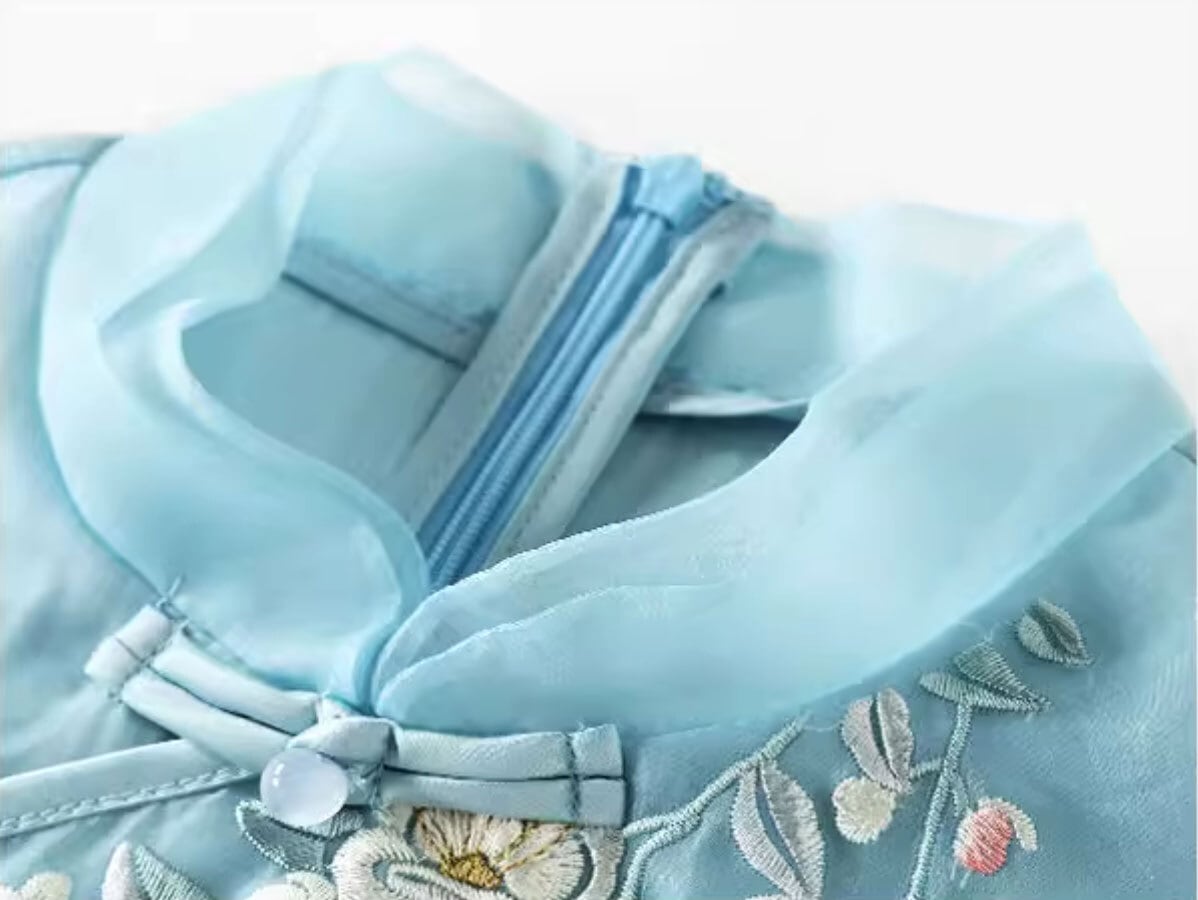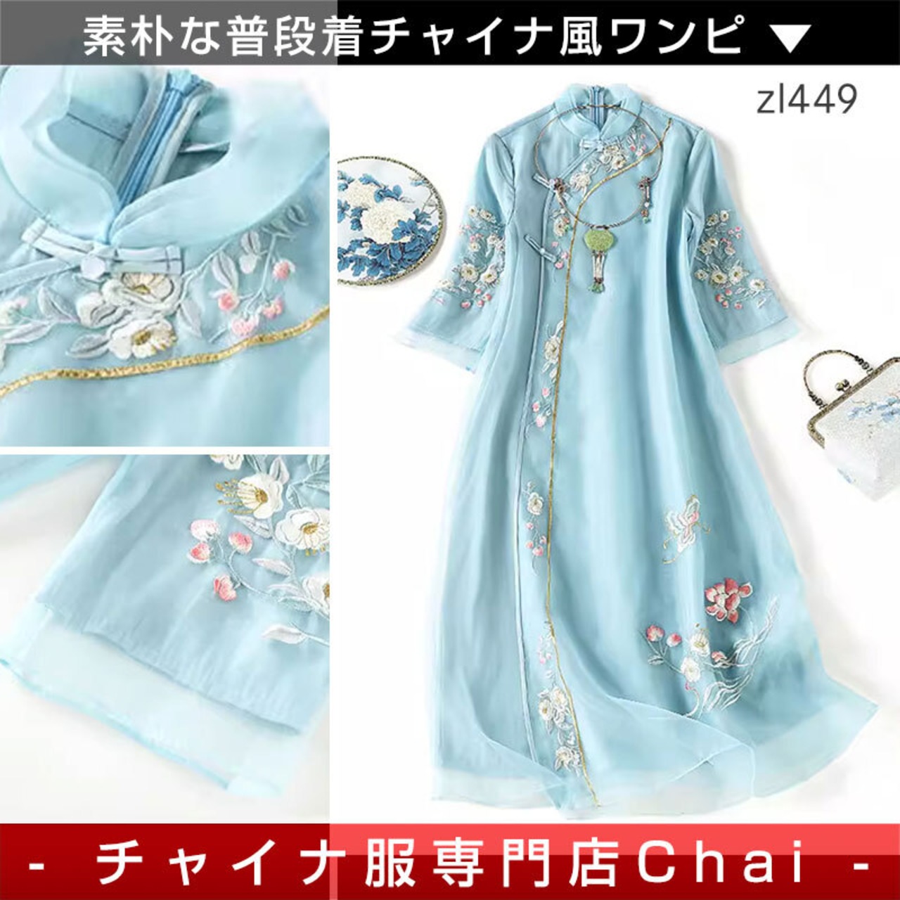 トップスも普段着も揃うチャイナ服専門店chaiです。こちらはチャイナ服 ワンピース 七分袖 刺繍 爽やかな風合い 水色 チャイナ風ワンピ zl449の商品ページです。爽やかな風合いが魅力的な水色のロングチャイナワンピースで、チャイナファッションにおすすめのアイテムです。
