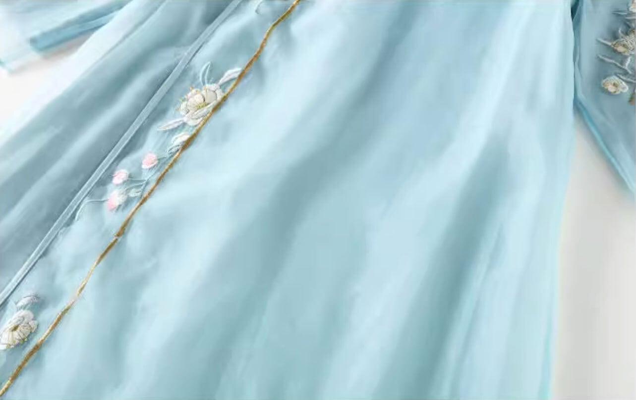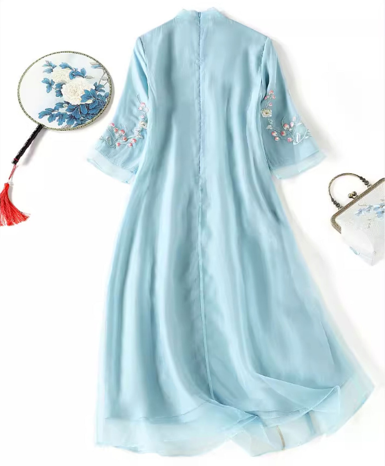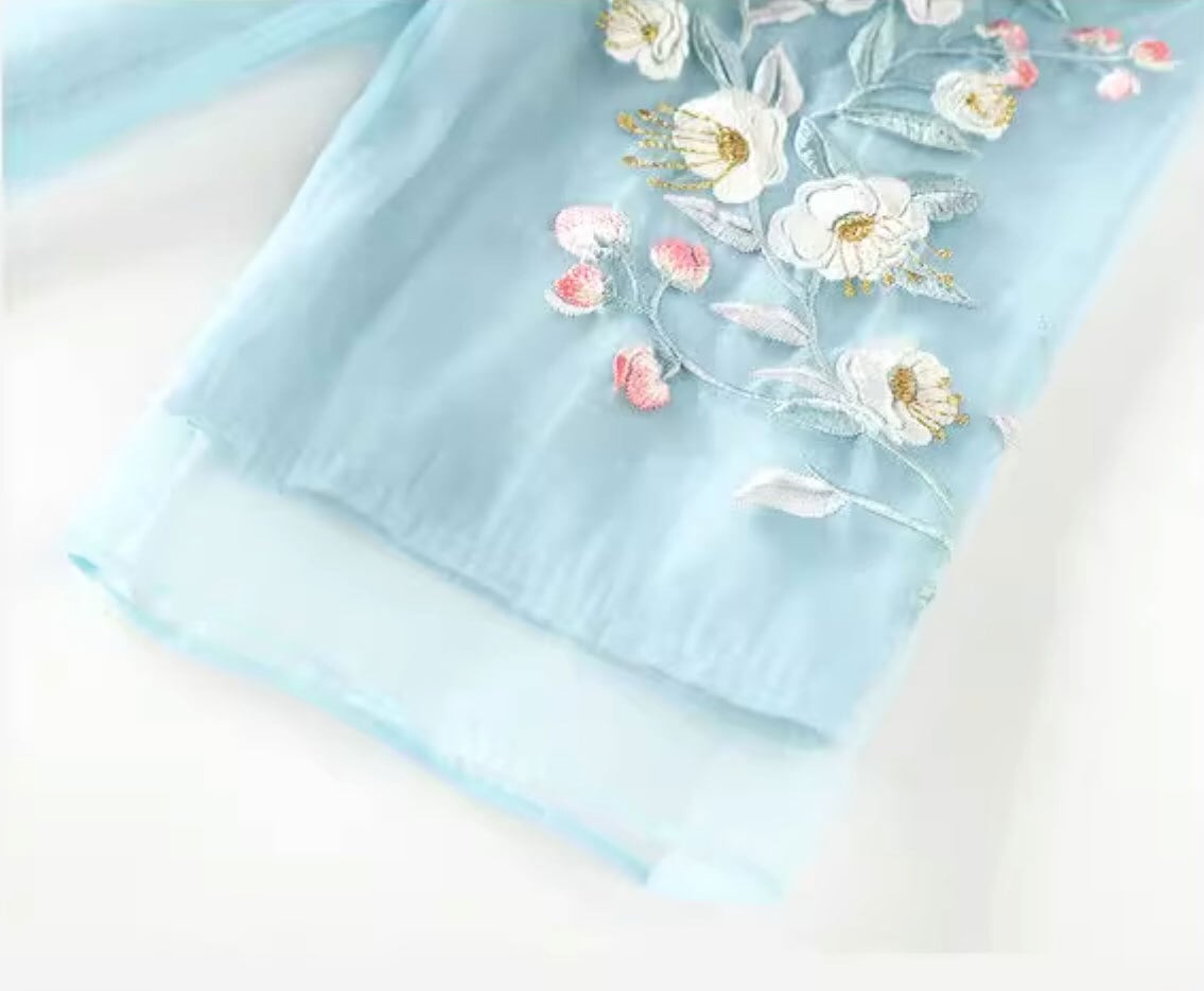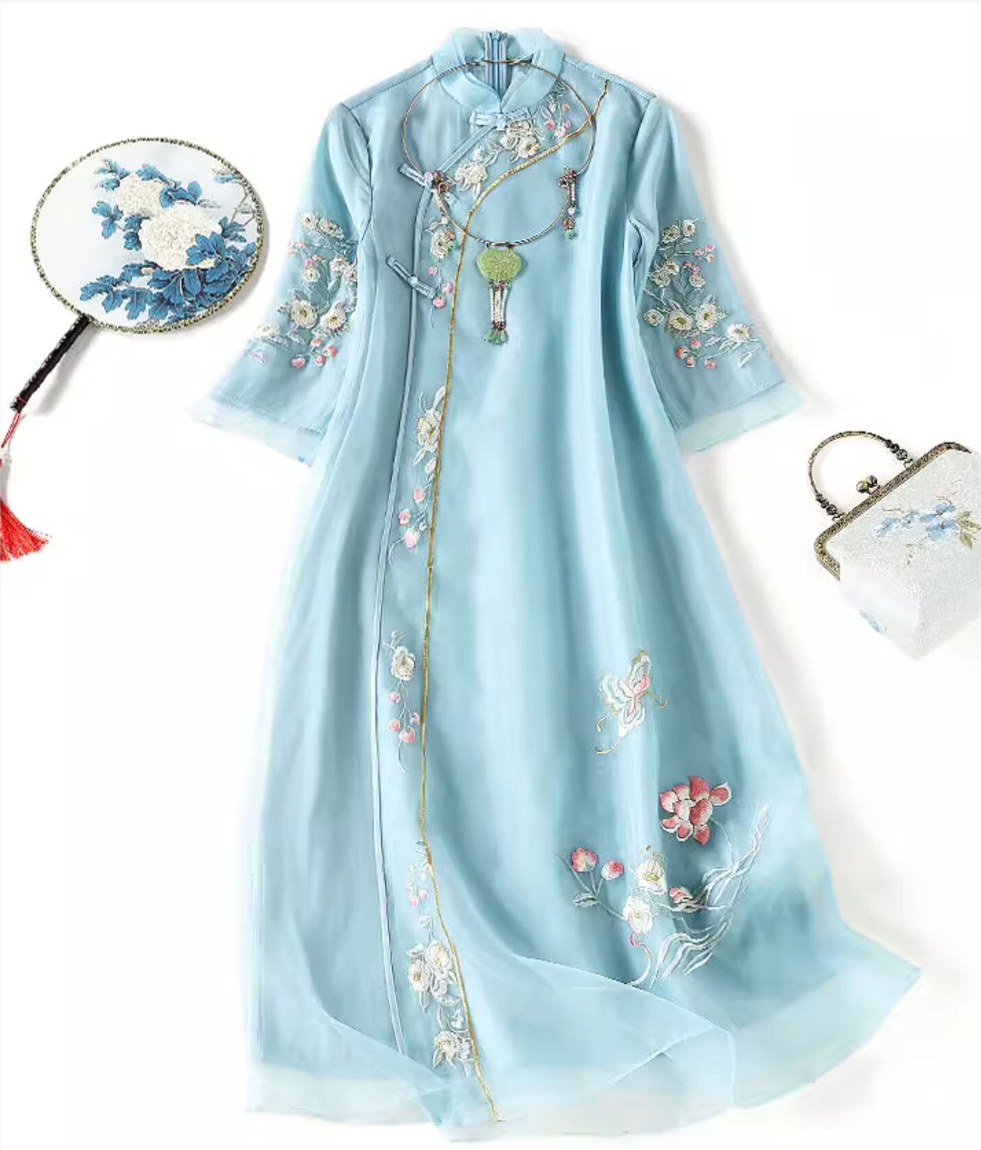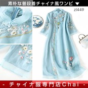 チャイナ服 ワンピース 七分袖 刺繍 爽やかな風合い 水色 チャイナ風ワンピ zl449