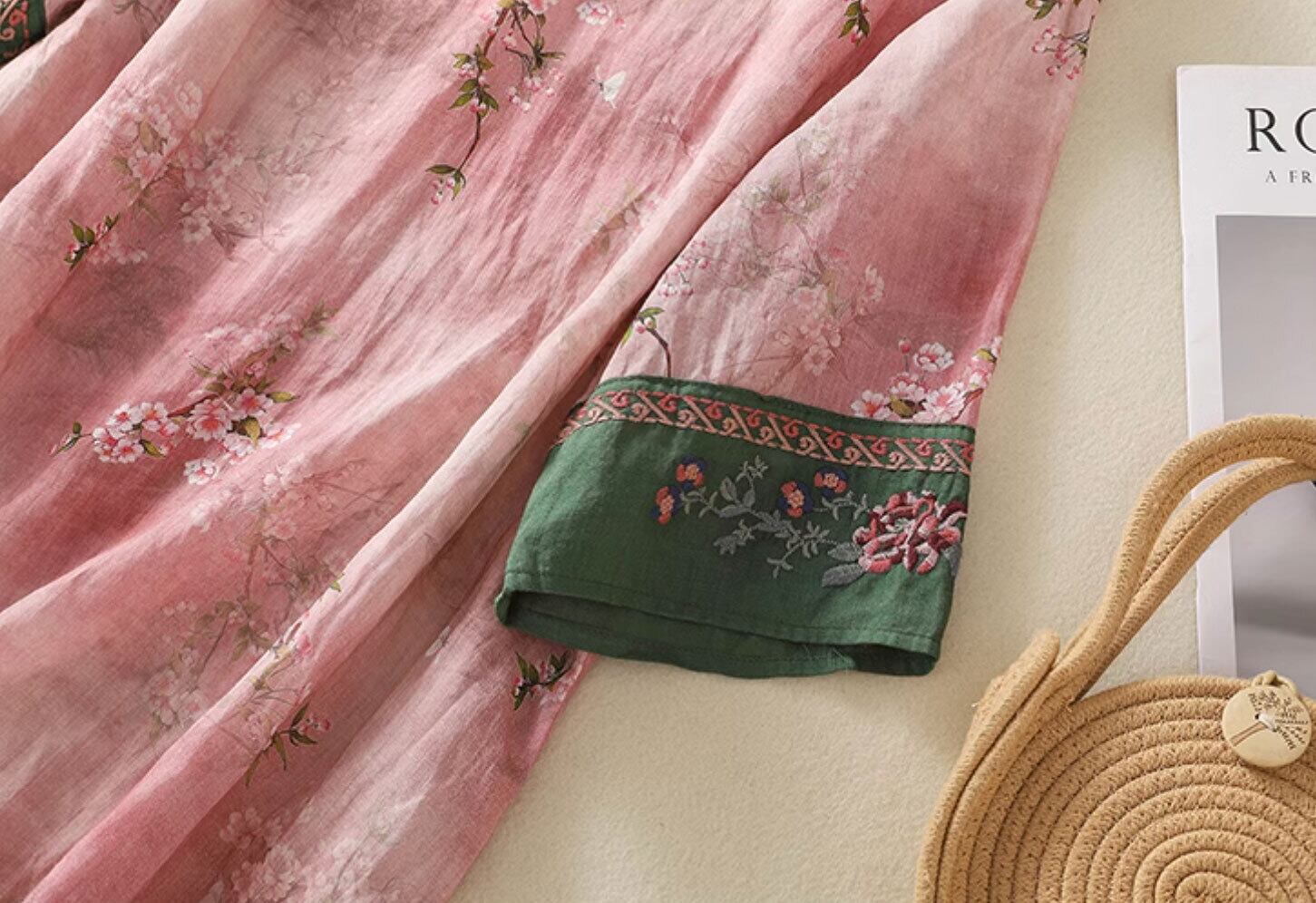 チャイナ服 ワンピース 七分袖 刺繍 素朴な風合い ピンク チャイナ風ワンピ zl450