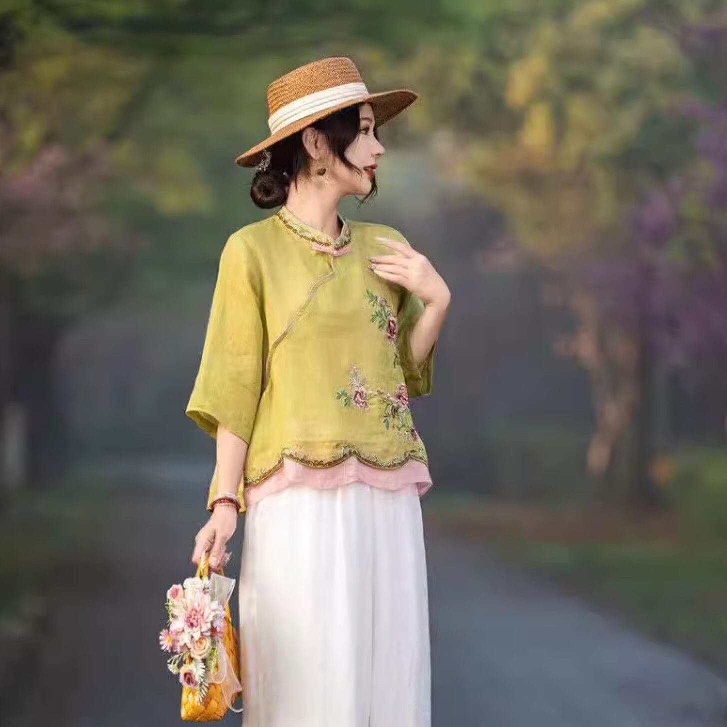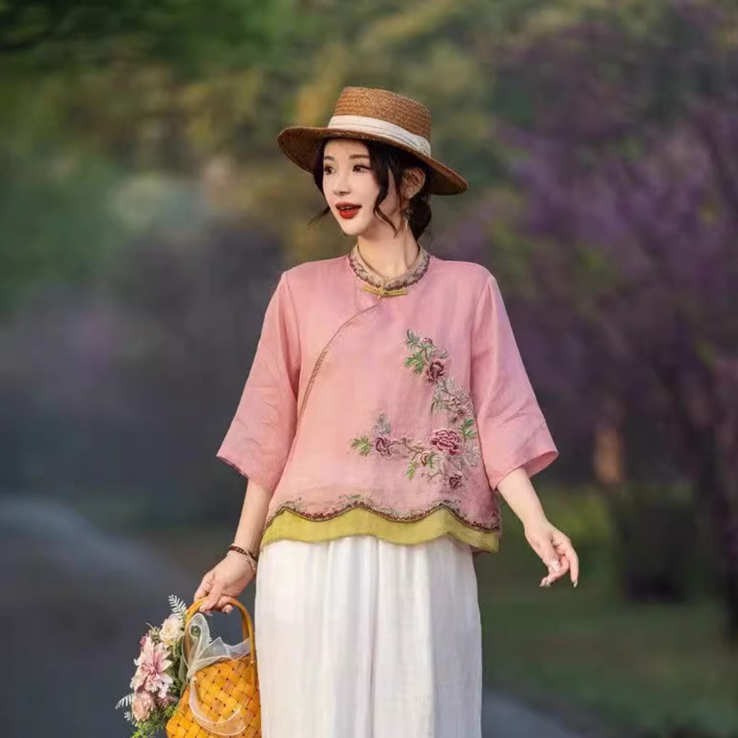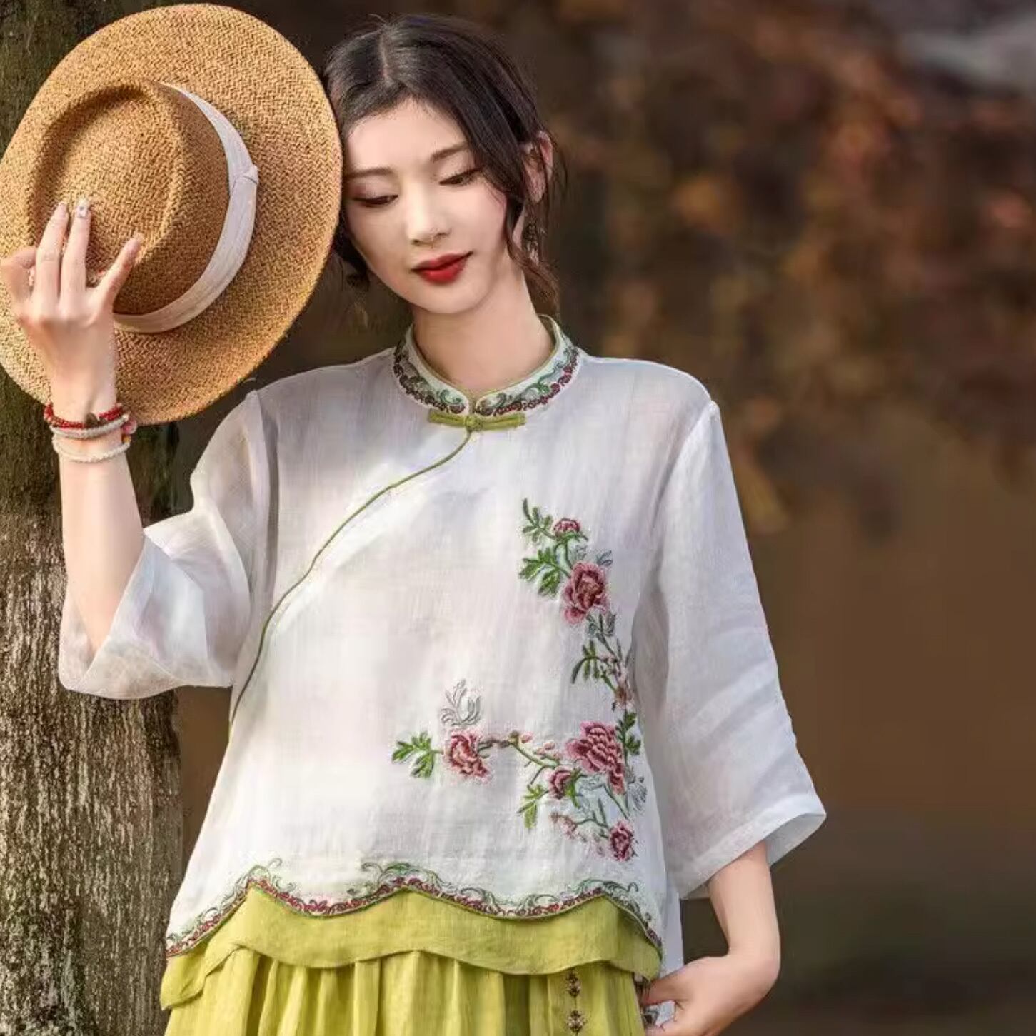 チャイナ服 トップス 春夏薄手 刺繍 素朴 七分袖 落ち着いた風合い zh560
