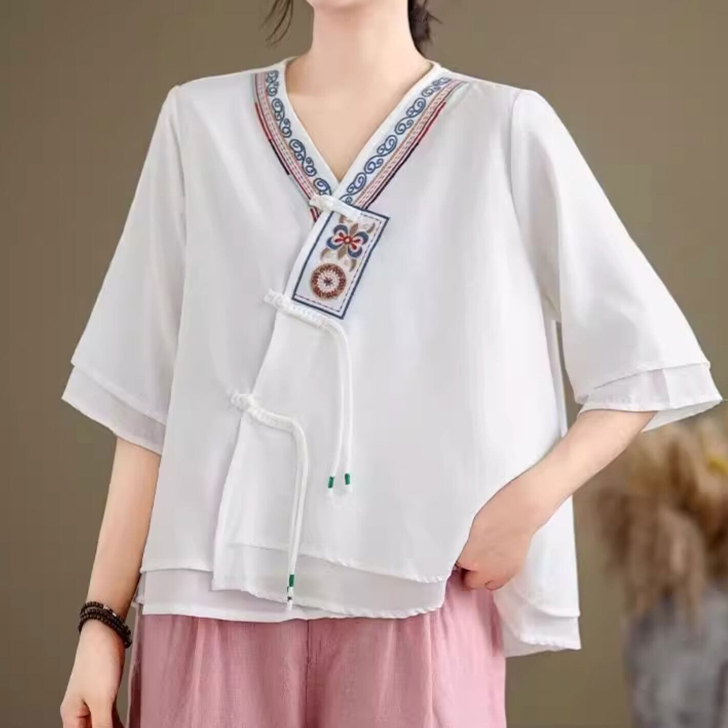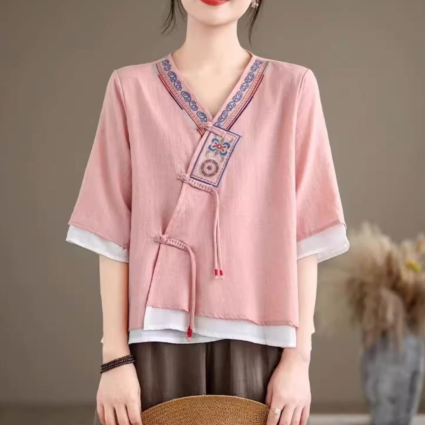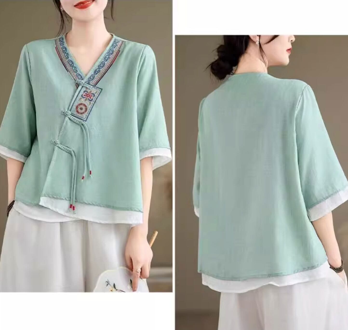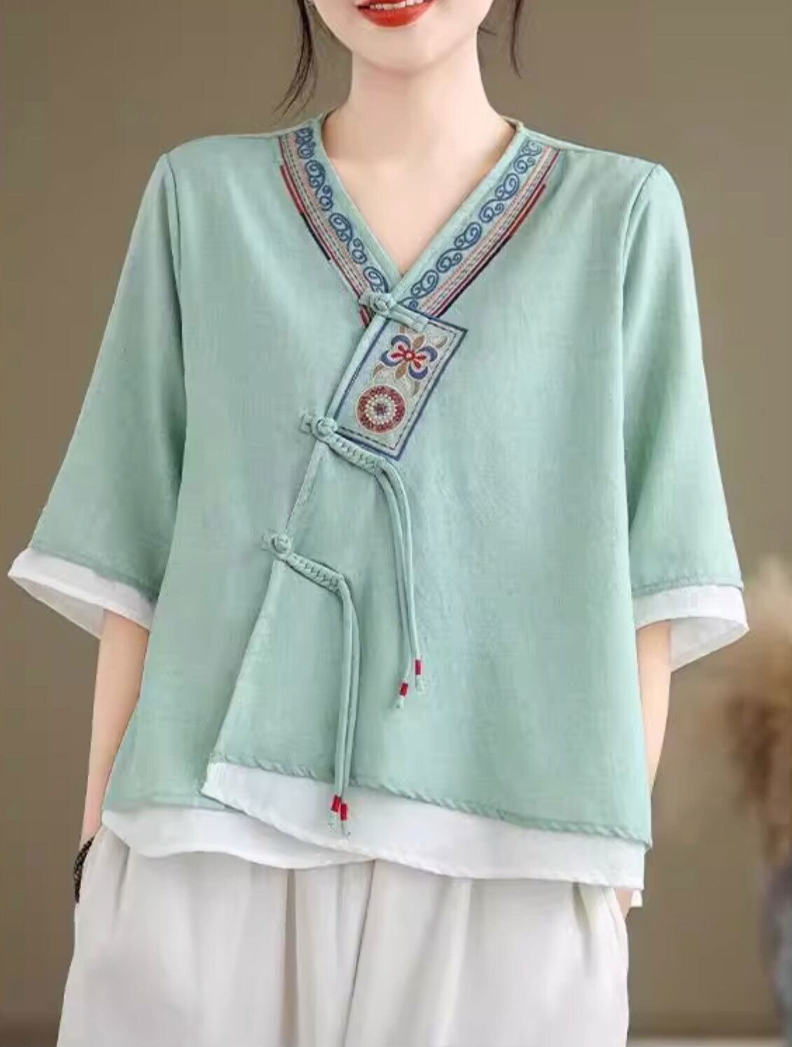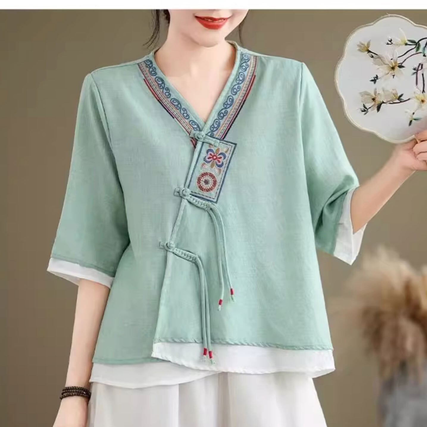 チャイナ服 トップス 春夏薄手 Vネック 刺繍 素朴 半袖 落ち着いた風合い zh565