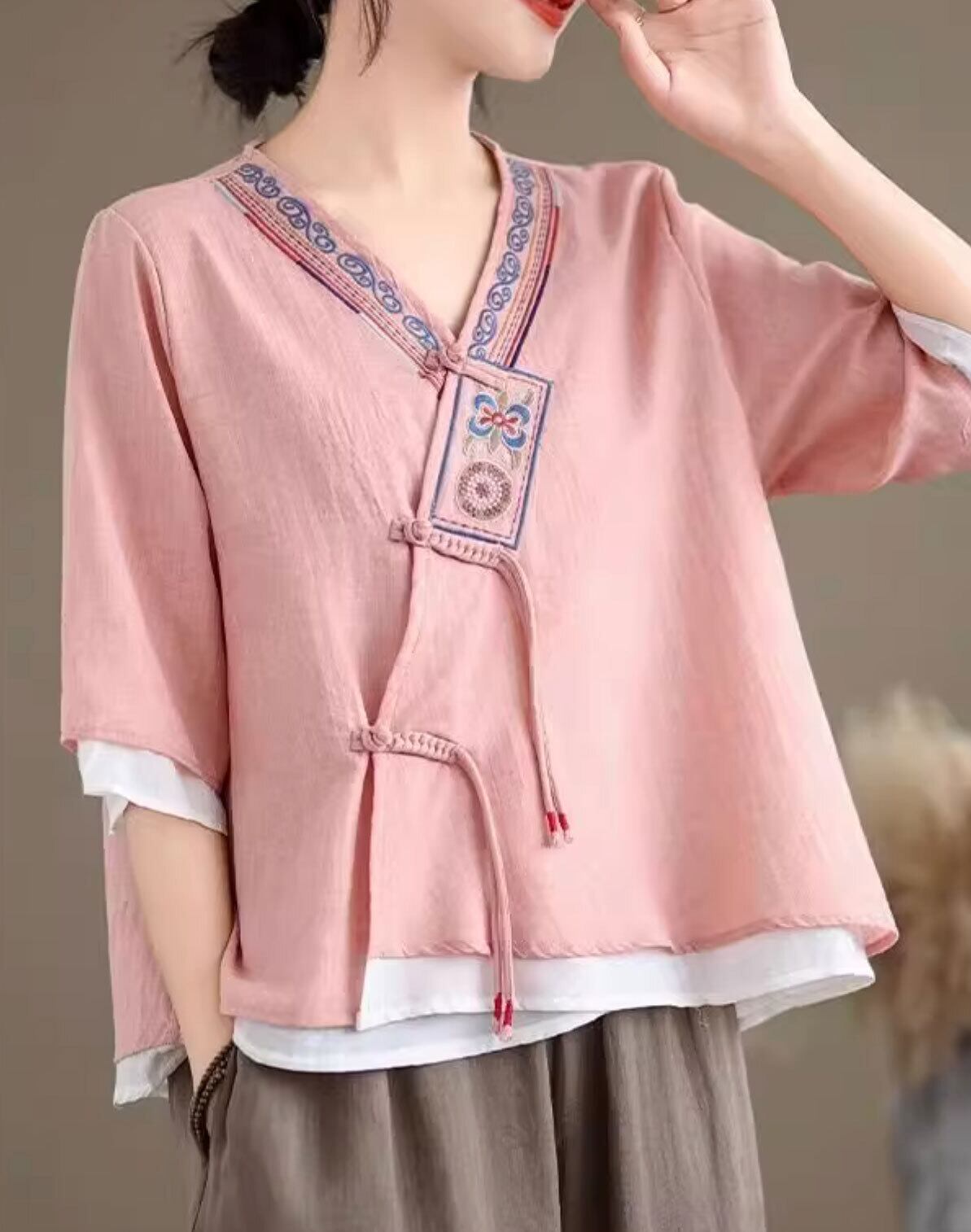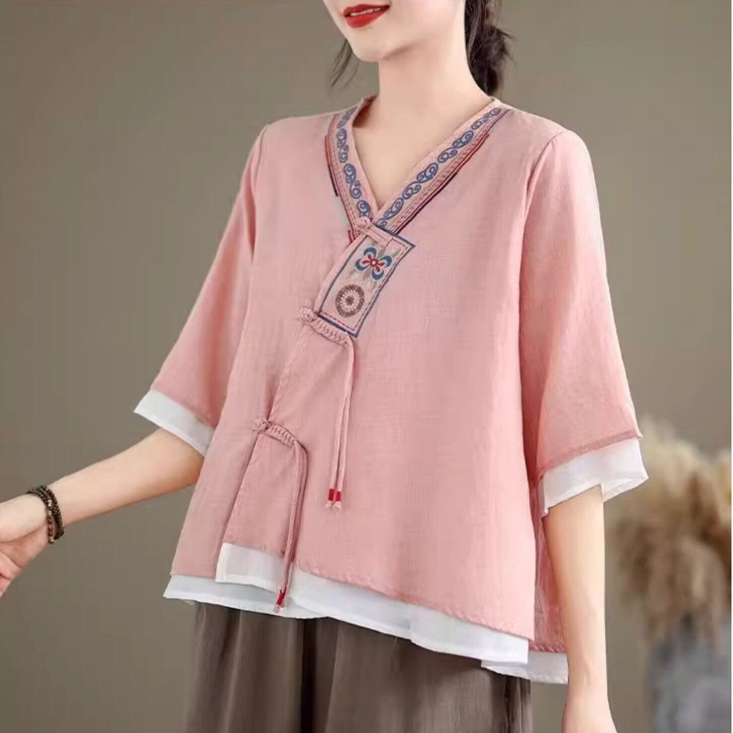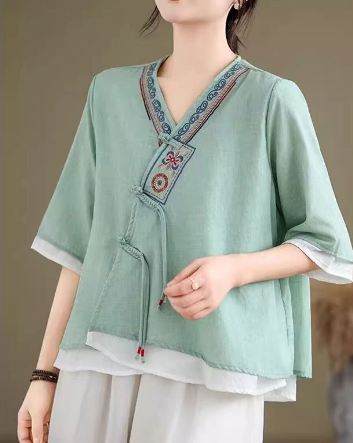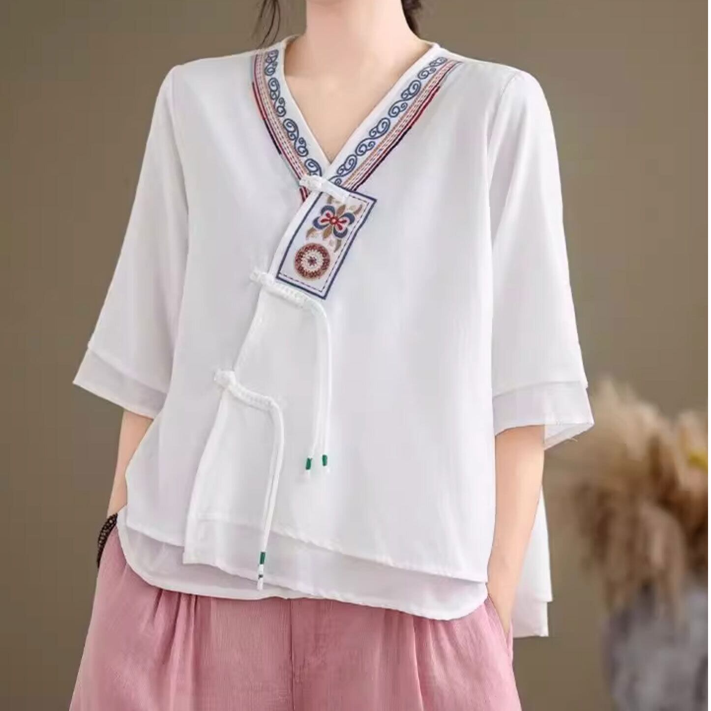 チャイナ服 トップス 春夏薄手 Vネック 刺繍 素朴 半袖 落ち着いた風合い zh565