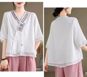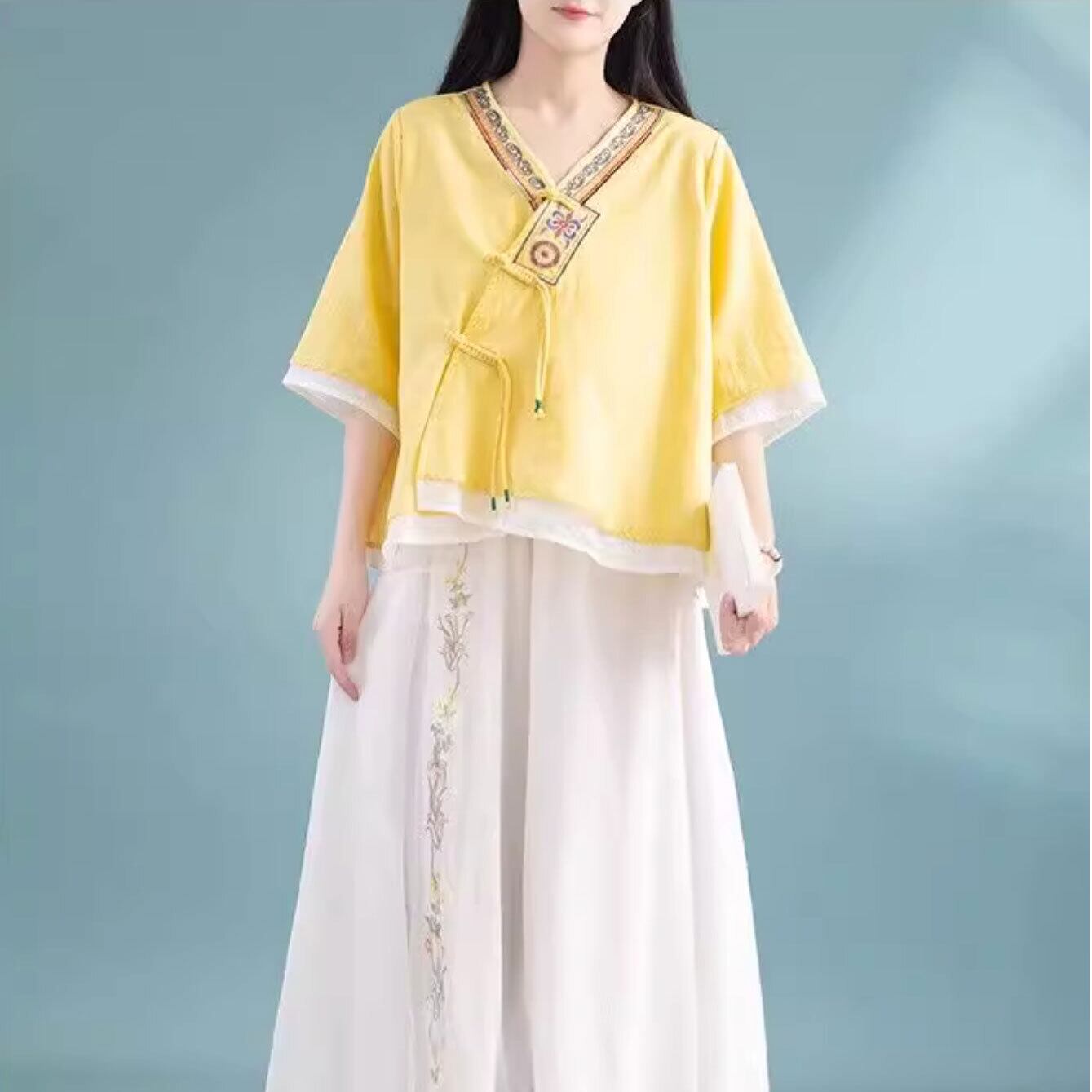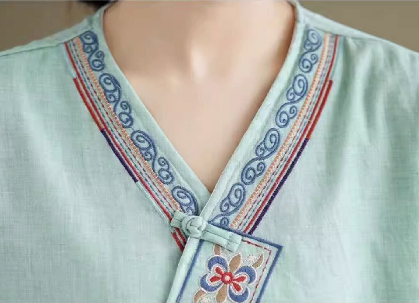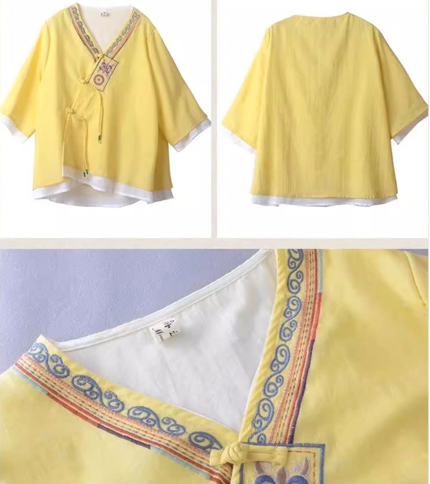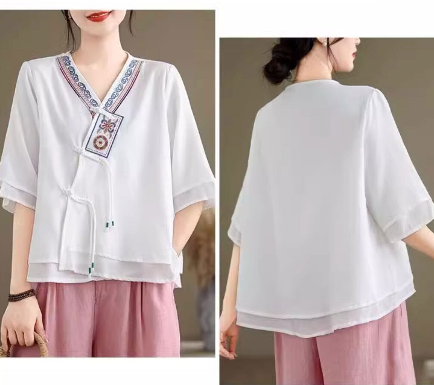 チャイナ服 トップス 春夏薄手 Vネック 刺繍 素朴 半袖 落ち着いた風合い zh565