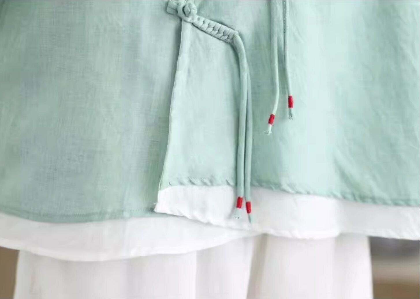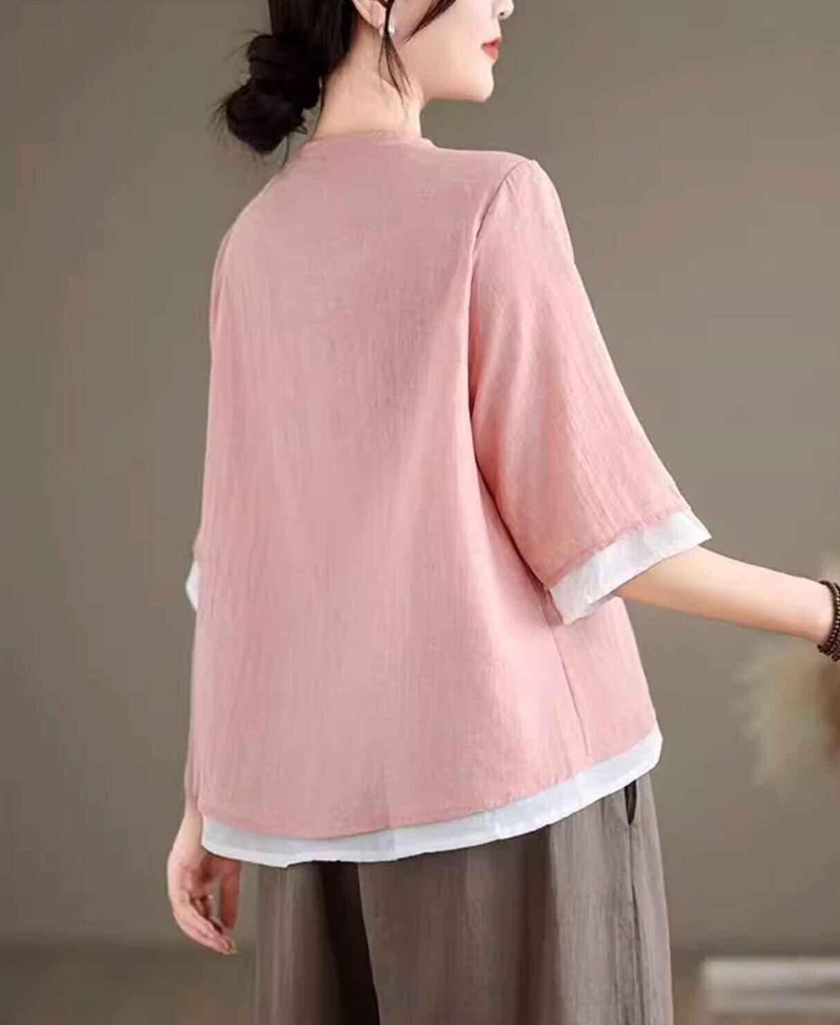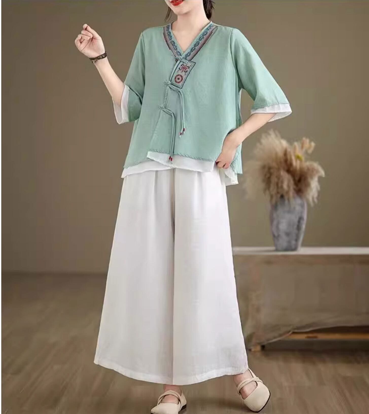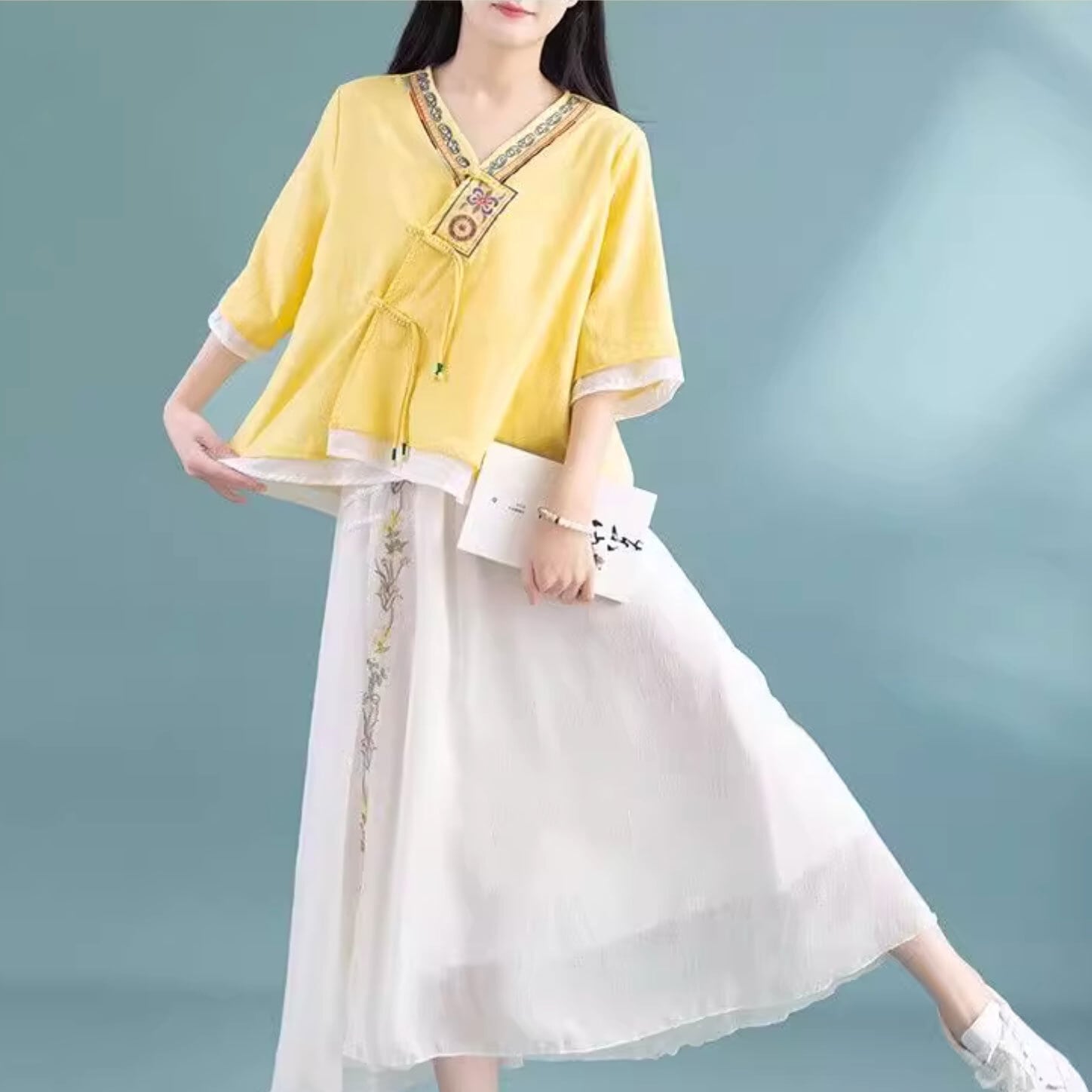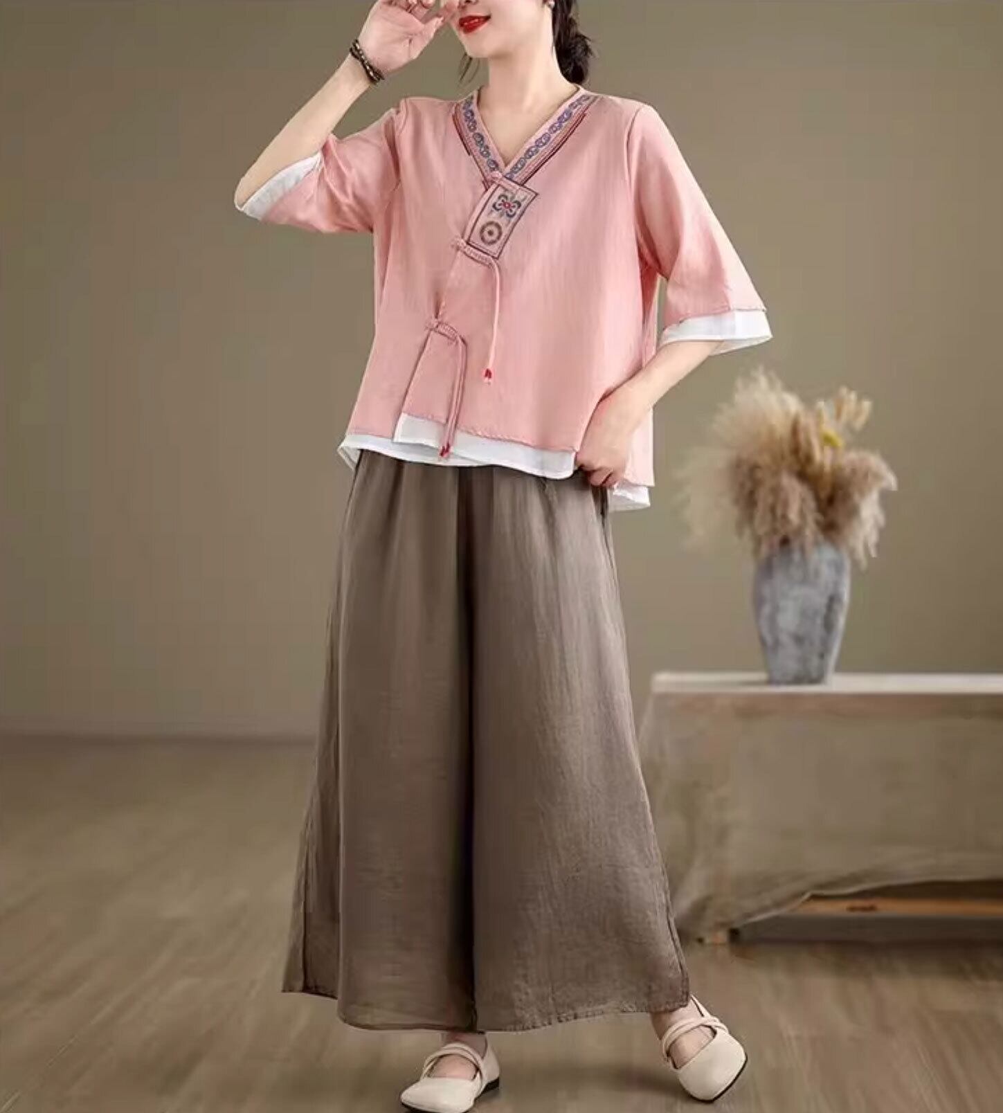 チャイナ服 トップス 春夏薄手 Vネック 刺繍 素朴 半袖 落ち着いた風合い zh565