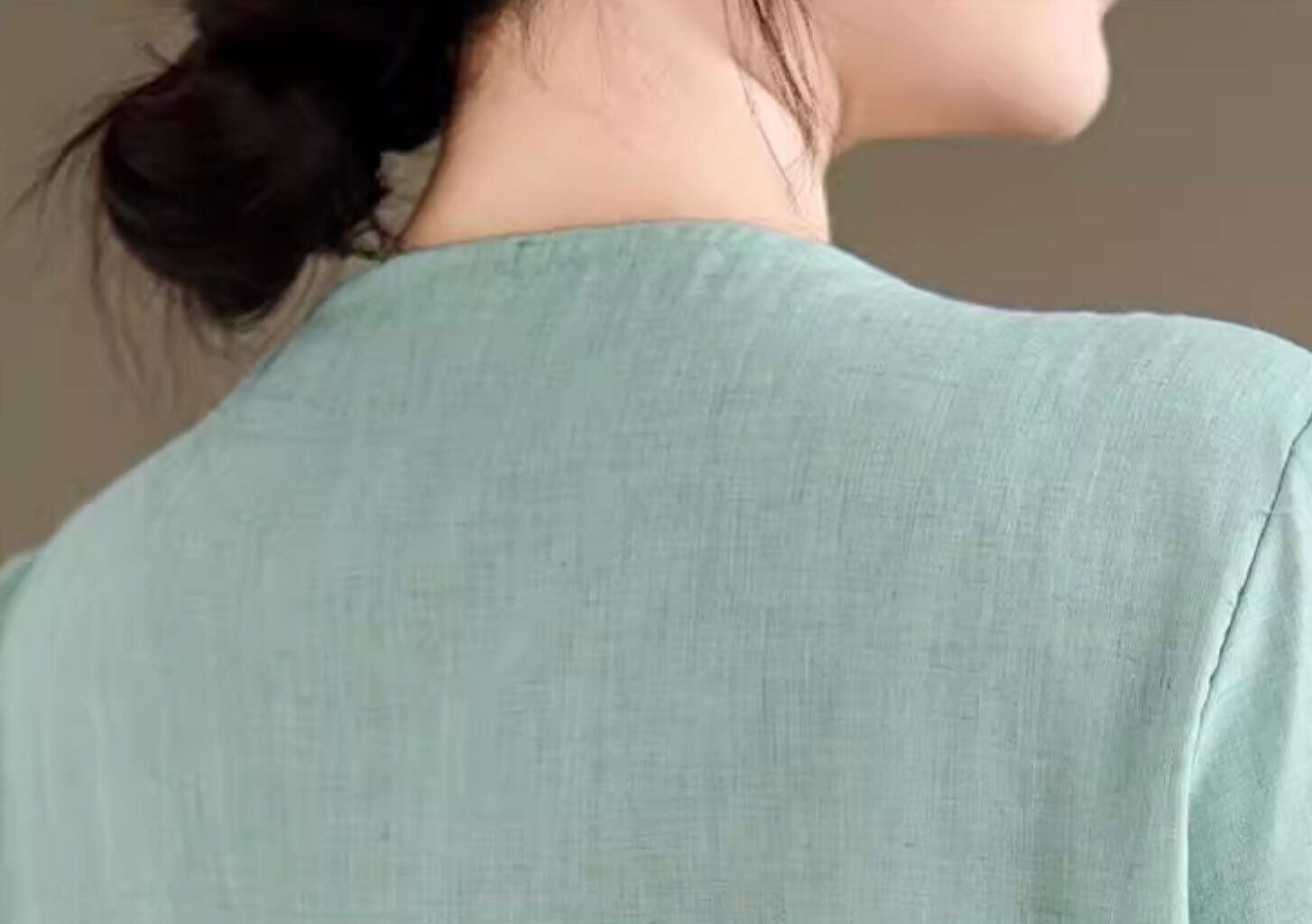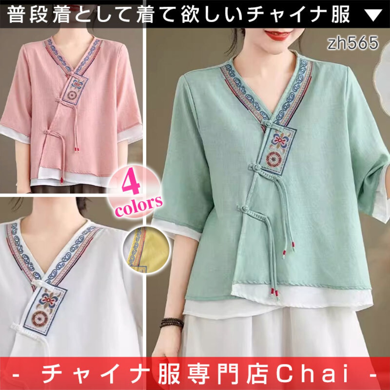 トップスも普段着も揃うチャイナ服専門店chaiです。こちらはチャイナ服 トップス 春夏薄手 Vネック 刺繍 素朴 半袖 落ち着いた風合い zh565の商品ページです。シンプルで素朴なチャイナトップスで、春夏の普段着でつかいやすいアイテムです。