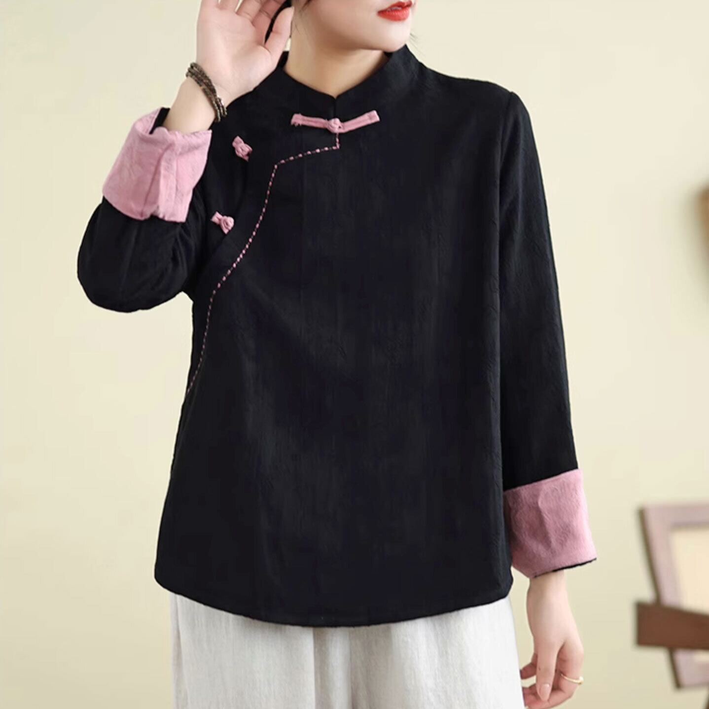 チャイナ風トップス 秋冬 ステッチ チャイナボタン 長袖 素朴 落ち着いた風合い zt569