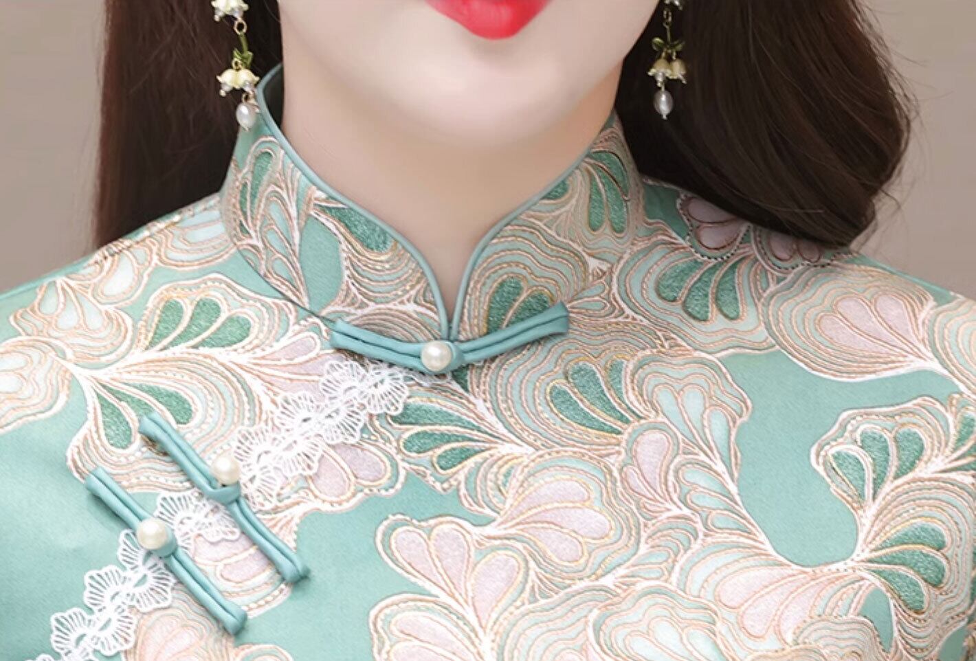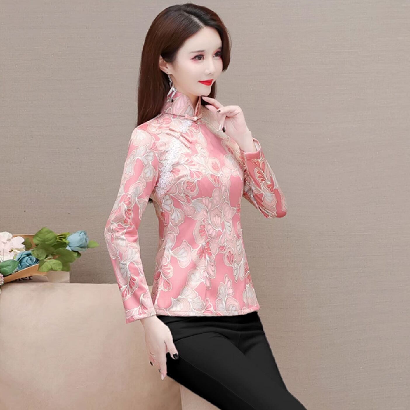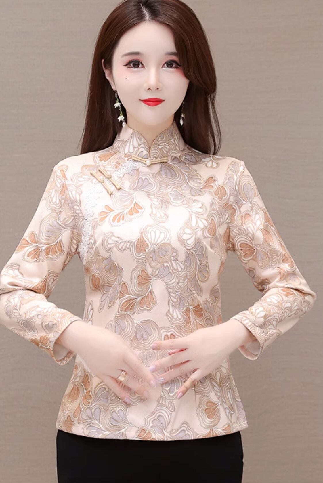 チャイナ風トップス 秋冬 総柄 上品な風合い チャイナボタンき zt573